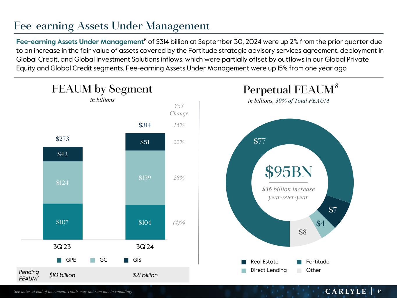 R-14 7 G-19 5 B-19 7 R-88 G-15 9 B-16 5 R-13 6 G-18 0 B-83 R-16 3 G-14 3 B-18 7 R-0 G-74 B-13 6 R-18 5 G-21 1 B-15 3 R-11 8 G-92 B-15 0 R-22 0 G-22 1 B-23 2 R-14 0 G-14 1 B-15 2R-12 0 G-16 9 B-22 2 Old Colors R-88 G-89 B-91 58595B R-23 G-234 B-234 EAEAEA R-208 G-232 B-247 D0E8F7 R-65 G-64 B-66 414042 R-8 G-51 B-94 08335E R-167 G-169 B-171 A7A9AB R-9 G-102 B-112 096670 R-220 G-221 B-222 DCDDDE R-97 G-161 B-224 61A1E0 R-237 G-217 B-157 EDD99D R-147 G-195 B-197 93C3C5 14 $77 $7 $4 $8 $107 $104 $124 $159 $42 $51$273 $314 3Q'23 3Q'24 Fee-earning Assets Under Management Fee-earning Assets Under Management6 of $314 billion at September 30, 2024 were up 2% from the prior quarter due to an increase in the fair value of assets covered by the Fortitude strategic advisory services agreement, deployment in Global Credit, and Global Investment Solutions inflows, which were partially offset by outflows in our Global Private Equity and Global Credit segments. Fee-earning Assets Under Management were up 15% from one year ago See notes at end of document. Totals may not sum due to rounding. Pending FEAUM7 $10 billion $21 billion FEAUM by Segment in billions Perpetual FEAUM in billions, 30% of Total FEAUM n Real Estate n Fortitude n Direct Lending n Other YoY Change 15% 22% 28% (4)% $36 billion increase year-over-year $95BN n GPE n GC n GIS 8