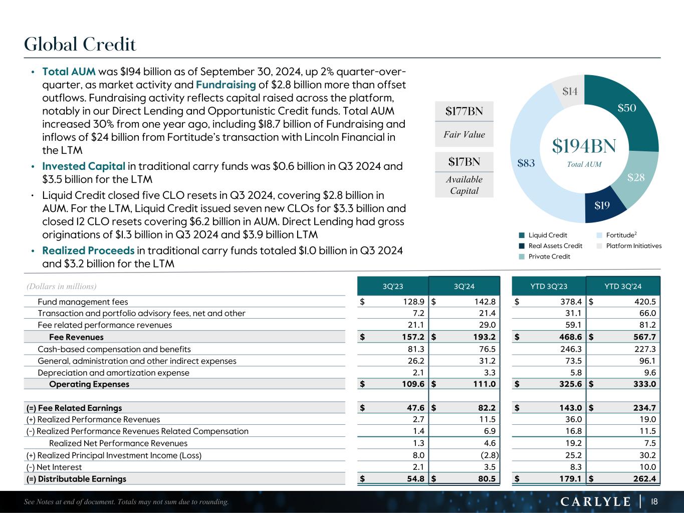 R-14 7 G-19 5 B-19 7 R-88 G-15 9 B-16 5 R-13 6 G-18 0 B-83 R-16 3 G-14 3 B-18 7 R-0 G-74 B-13 6 R-18 5 G-21 1 B-15 3 R-11 8 G-92 B-15 0 R-22 0 G-22 1 B-23 2 R-14 0 G-14 1 B-15 2R-12 0 G-16 9 B-22 2 Old Colors R-88 G-89 B-91 58595B R-23 G-234 B-234 EAEAEA R-208 G-232 B-247 D0E8F7 R-65 G-64 B-66 414042 R-8 G-51 B-94 08335E R-167 G-169 B-171 A7A9AB R-9 G-102 B-112 096670 R-220 G-221 B-222 DCDDDE R-97 G-161 B-224 61A1E0 R-237 G-217 B-157 EDD99D R-147 G-195 B-197 93C3C5 17 Global Private Equity • Total AUM was $169 billion as of September 30, 2024, up 3% from the prior quarter as Q3 2024 Fundraising of $3.7 billion and portfolio appreciation more than offset realizations. Fundraising in Q3 2024 was primarily driven by our latest U.S. Real Estate fund. Total AUM increased 5% from the prior year, including LTM Fundraising of $13.1 billion • Invested Capital was $1.6 billion in Q3 2024 and $7.2 billion for the LTM. Q3 2024 activity was driven by our Real Estate strategy, the purchase of KFC Holdings Japan, Ltd. (CJP IV / CAP V), and follow-on activity across the segment • Realized Proceeds totaled $4.1 billion in Q3 2024 and $14.7 billion for the LTM. Notable Q3 2024 realization activity included SER Group (CETP III), Tokiwa Corporation (CJP III), and PNB Housing Finance Limited (CAP IV) $111 $34 $24 $169BN Total AUM (Dollars in millions) 3Q'23 3Q'24 YTD 3Q'23 YTD 3Q'24 Fund management fees $ 330.1 $ 298.6 $ 987.2 $ 908.4 Transaction and portfolio advisory fees, net and other 4.0 5.9 14.7 16.8 Fee related performance revenues 0.7 — 63.1 6.9 Fee Revenues $ 334.8 $ 304.5 $ 1,065.0 $ 932.1 Cash-based compensation and benefits 142.3 101.1 464.6 314.3 General, administration and other indirect expenses 46.0 48.5 162.2 137.3 Depreciation and amortization expense 7.1 6.7 19.7 19.6 Operating Expenses $ 195.4 $ 156.3 $ 646.5 $ 471.2 (=) Fee Related Earnings $ 139.4 $ 148.2 $ 418.5 $ 460.9 (+) Realized Performance Revenues 164.6 225.2 577.3 728.7 (-) Realized Performance Revenues Related Compensation 18.2 141.5 209.1 457.2 Realized Net Performance Revenues 146.4 83.7 368.2 271.5 (+) Realized Principal Investment Income (Loss) 14.4 10.0 39.5 35.7 (-) Net Interest 8.0 6.4 30.5 20.4 (=) Distributable Earnings $ 292.2 $ 235.5 $ 795.7 $ 747.7 See notes at end of document. Totals may not sum due to rounding. $127BN Fair Value $42BN Available Capital 3% Publicly Traded 46% Aged 4+ Years1 n Corporate Private Equity n Infrastructure & Natural Resourcesn Real Estate