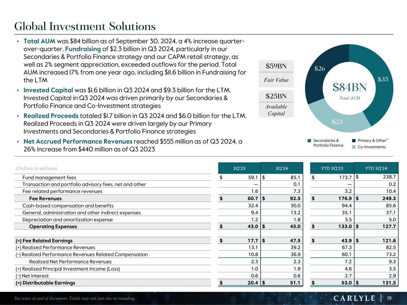 R-14 7 G-19 5 B-19 7 R-88 G-15 9 B-16 5 R-13 6 G-18 0 B-83 R-16 3 G-14 3 B-18 7 R-0 G-74 B-13 6 R-18 5 G-21 1 B-15 3 R-11 8 G-92 B-15 0 R-22 0 G-22 1 B-23 2 R-14 0 G-14 1 B-15 2R-12 0 G-16 9 B-22 2 Old Colors R-88 G-89 B-91 58595B R-23 G-234 B-234 EAEAEA R-208 G-232 B-247 D0E8F7 R-65 G-64 B-66 414042 R-8 G-51 B-94 08335E R-167 G-169 B-171 A7A9AB R-9 G-102 B-112 096670 R-220 G-221 B-222 DCDDDE R-97 G-161 B-224 61A1E0 R-237 G-217 B-157 EDD99D R-147 G-195 B-197 93C3C5 18 Global Credit • Total AUM was $194 billion as of September 30, 2024, up 2% quarter-over- quarter, as market activity and Fundraising of $2.8 billion more than offset outflows. Fundraising activity reflects capital raised across the platform, notably in our Direct Lending and Opportunistic Credit funds. Total AUM increased 30% from one year ago, including $18.7 billion of Fundraising and inflows of $24 billion from Fortitude’s transaction with Lincoln Financial in the LTM • Invested Capital in traditional carry funds was $0.6 billion in Q3 2024 and $3.5 billion for the LTM • Liquid Credit closed five CLO resets in Q3 2024, covering $2.8 billion in AUM. For the LTM, Liquid Credit issued seven new CLOs for $3.3 billion and closed 12 CLO resets covering $6.2 billion in AUM. Direct Lending had gross originations of $1.3 billion in Q3 2024 and $3.9 billion LTM • Realized Proceeds in traditional carry funds totaled $1.0 billion in Q3 2024 and $3.2 billion for the LTM (Dollars in millions) 3Q'23 3Q'24 YTD 3Q'23 YTD 3Q'24 Fund management fees $ 128.9 $ 142.8 $ 378.4 $ 420.5 Transaction and portfolio advisory fees, net and other 7.2 21.4 31.1 66.0 Fee related performance revenues 21.1 29.0 59.1 81.2 Fee Revenues $ 157.2 $ 193.2 $ 468.6 $ 567.7 Cash-based compensation and benefits 81.3 76.5 246.3 227.3 General, administration and other indirect expenses 26.2 31.2 73.5 96.1 Depreciation and amortization expense 2.1 3.3 5.8 9.6 Operating Expenses $ 109.6 $ 111.0 $ 325.6 $ 333.0 (=) Fee Related Earnings $ 47.6 $ 82.2 $ 143.0 $ 234.7 (+) Realized Performance Revenues 2.7 11.5 36.0 19.0 (-) Realized Performance Revenues Related Compensation 1.4 6.9 16.8 11.5 Realized Net Performance Revenues 1.3 4.6 19.2 7.5 (+) Realized Principal Investment Income (Loss) 8.0 (2.8) 25.2 30.2 (-) Net Interest 2.1 3.5 8.3 10.0 (=) Distributable Earnings $ 54.8 $ 80.5 $ 179.1 $ 262.4 $50 $28 $19 $83 $14 $194BN Total AUM See Notes at end of document. Totals may not sum due to rounding. $177BN Fair Value $17BN Available Capital n Liquid Credit n Fortitude2 n Real Assets Credit n Platform Initiatives n Private Credit