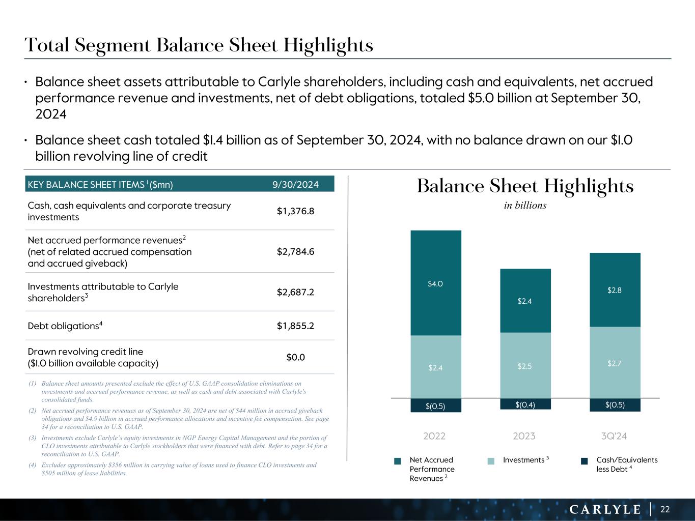 R-14 7 G-19 5 B-19 7 R-88 G-15 9 B-16 5 R-13 6 G-18 0 B-83 R-16 3 G-14 3 B-18 7 R-0 G-74 B-13 6 R-18 5 G-21 1 B-15 3 R-11 8 G-92 B-15 0 R-22 0 G-22 1 B-23 2 R-14 0 G-14 1 B-15 2R-12 0 G-16 9 B-22 2 Old Colors R-88 G-89 B-91 58595B R-23 G-234 B-234 EAEAEA R-208 G-232 B-247 D0E8F7 R-65 G-64 B-66 414042 R-8 G-51 B-94 08335E R-167 G-169 B-171 A7A9AB R-9 G-102 B-112 096670 R-220 G-221 B-222 DCDDDE R-97 G-161 B-224 61A1E0 R-237 G-217 B-157 EDD99D R-147 G-195 B-197 93C3C5 21 Note: Historical quarterly results by segment available in Q3 2024 financial supplement on Carlyle's investor relations website. (Dollars in millions, except per share amounts) 3Q'23 4Q'23 1Q'24 2Q'24 3Q'24 YTD 3Q'23 YTD 3Q'24 SEGMENT REVENUES Fund management fees $ 518.1 $ 525.1 $ 515.6 $ 525.5 $ 526.5 $ 1,539.3 $ 1,567.6 Transaction and portfolio advisory fees, net and other 11.2 34.6 26.7 28.9 27.4 45.8 83.0 Fee related performance revenues 23.4 35.6 29.1 33.1 36.3 125.4 98.5 Total segment fee revenues 552.7 595.3 571.4 587.5 590.2 1,710.5 1,749.1 Realized performance revenues 180.4 257.7 397.8 156.5 275.9 680.6 830.2 Realized principal investment income 23.4 19.5 33.7 26.6 9.1 69.3 69.4 Interest income 20.1 23.9 20.1 18.3 19.8 48.3 58.2 Total Segment Revenues $ 776.6 $ 896.4 $ 1,023.0 $ 788.9 $ 895.0 $ 2,508.7 $ 2,706.9 SEGMENT EXPENSES Compensation and benefits Cash-based compensation and benefits $ 256.0 $ 226.6 $ 214.3 $ 205.3 $ 207.6 $ 805.3 $ 627.2 Realized performance revenues related compensation 30.4 121.3 255.8 100.8 185.3 286.0 541.9 Total compensation and benefits 286.4 347.9 470.1 306.1 392.9 1,091.3 1,169.1 General, administrative and other expenses 81.6 105.7 79.7 97.9 92.9 270.8 270.5 Depreciation and amortization expense 10.4 9.0 11.1 11.3 11.8 29.0 34.2 Interest expense 30.8 31.1 30.8 30.4 30.3 89.8 91.5 Total Segment Expenses $ 409.2 $ 493.7 $ 591.7 $ 445.7 $ 527.9 $ 1,480.9 $ 1,565.3 Total Segment Revenues 776.6 896.4 1,023.0 788.9 895.0 2,508.7 2,706.9 Total Segment Expenses 409.2 493.7 591.7 445.7 527.9 1,480.9 1,565.3 (=) Distributable Earnings $ 367.4 $ 402.7 $ 431.3 $ 343.2 $ 367.1 $ 1,027.8 $ 1,141.6 (-) Realized Net Performance Revenues 150.0 136.4 142.0 55.7 90.6 394.6 288.3 (-) Realized Principal Investment Income 23.4 19.5 33.7 26.6 9.1 69.3 69.4 (+) Net Interest 10.7 7.2 10.7 12.1 10.5 41.5 33.3 (=) Fee Related Earnings $ 204.7 $ 254.0 $ 266.3 $ 273.0 $ 277.9 $ 605.4 $ 817.2 After-tax Distributable Earnings, per common share $ 0.87 $ 0.86 $ 1.01 $ 0.78 $ 0.95 $ 2.38 $ 2.74 Dividend per common share $ 0.35 $ 0.35 $ 0.35 $ 0.35 $ 0.35 $ 1.05 $ 1.05 Carlyle Third Quarter 2024 Total Segment Results