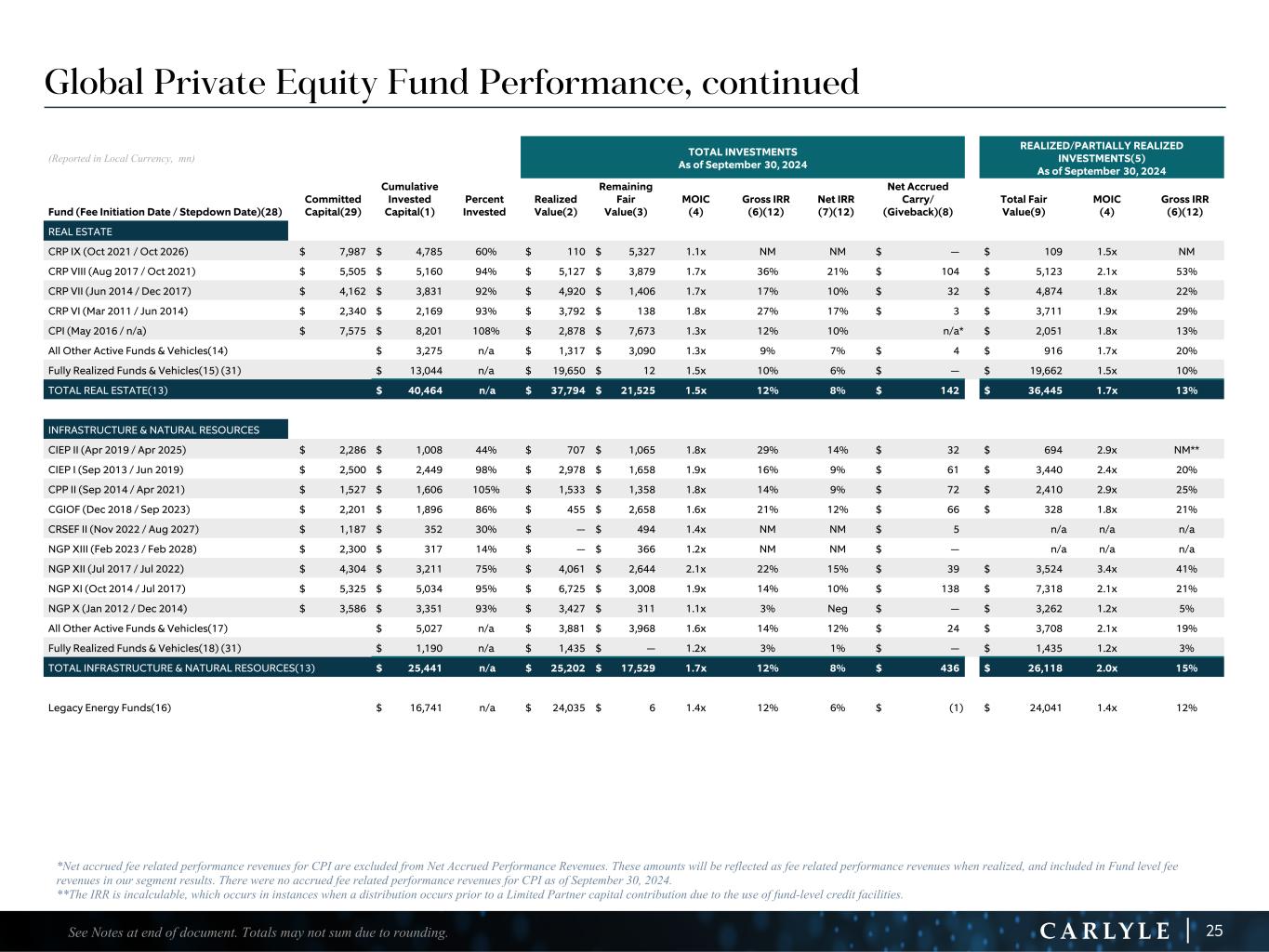 R-14 7 G-19 5 B-19 7 R-88 G-15 9 B-16 5 R-13 6 G-18 0 B-83 R-16 3 G-14 3 B-18 7 R-0 G-74 B-13 6 R-18 5 G-21 1 B-15 3 R-11 8 G-92 B-15 0 R-22 0 G-22 1 B-23 2 R-14 0 G-14 1 B-15 2R-12 0 G-16 9 B-22 2 Old Colors R-88 G-89 B-91 58595B R-23 G-234 B-234 EAEAEA R-208 G-232 B-247 D0E8F7 R-65 G-64 B-66 414042 R-8 G-51 B-94 08335E R-167 G-169 B-171 A7A9AB R-9 G-102 B-112 096670 R-220 G-221 B-222 DCDDDE R-97 G-161 B-224 61A1E0 R-237 G-217 B-157 EDD99D R-147 G-195 B-197 93C3C5 24 Global Private Equity Fund Performance (Reported in Local Currency, mn) TOTAL INVESTMENTS As of September 30, 2024 REALIZED/PARTIALLY REALIZED INVESTMENTS(5) As of September 30, 2024 Fund (Fee Initiation Date / Stepdown Date)(28) Committed Capital (29) Cumulative Invested Capital(1) Percent Invested Realized Value(2) Remaining Fair Value(3) MOIC (4) Gross IRR (6)(12) Net IRR (7)(12) Net Accrued Carry/ (Giveback)(8) Total Fair Value(9) MOIC (4) Gross IRR (6)(12) CORPORATE PRIVATE EQUITY CP VIII (Oct 2021 / Oct 2027) $ 14,797 $ 8,005 54% $ 683 $ 9,964 1.3x 23% 9% $ 84 n/a n/a n/a CP VII (May 2018 / Oct 2021) $ 18,510 $ 17,740 96% $ 3,167 $ 24,182 1.5x 12% 8% $ 461 $ 2,218 1.0x Neg CP VI (May 2013 / May 2018) $ 13,000 $ 13,140 101% $ 24,845 $ 3,547 2.2x 18% 13% $ 129 $ 26,211 2.5x 22% CP V (Jun 2007 / May 2013) $ 13,720 $ 13,238 96% $ 28,106 $ 799 2.2x 18% 14% $ 56 $ 28,150 2.3x 20% CEP V (Oct 2018 / Sep 2024) € 6,416 € 5,548 86% € 1,446 € 5,690 1.3x 9% 4% $ — n/a n/a n/a CEP IV (Sep 2014 / Oct 2018) € 3,670 € 3,797 103% € 6,196 € 1,360 2.0x 17% 12% $ 86 € 6,246 2.1x 20% CEP III (Jul 2007 / Dec 2013) € 5,295 € 5,177 98% € 11,725 € 55 2.3x 19% 14% $ 4 € 11,658 2.3x 19% CAP VI (Jun 2024/Jun 2030) $ 2,115 $ — 0% $ — $ — n/a n/a n/a $ — n/a n/a n/a CAP V (Jun 2018 / Jun 2024) $ 6,554 $ 6,370 97% $ 2,138 $ 7,182 1.5x 18% 10% $ 137 $ 1,018 1.6x 136% CAP IV (Jul 2013 / Jun 2018) $ 3,880 $ 4,146 107% $ 8,091 $ 893 2.2x 18% 13% $ 60 $ 8,713 2.4x 22% CJP IV (Oct 2020 / Oct 2026) ¥ 258,000 ¥ 205,048 79% ¥ 54,503 ¥ 298,714 1.7x 41% 25% $ 60 ¥ 50,811 3.5x 149% CJP III (Sep 2013 / Aug 2020) ¥ 119,505 ¥ 91,192 76% ¥ 256,882 ¥ 17,664 3.0x 25% 18% $ 7 ¥ 247,821 3.4x 27% CGFSP III (Dec 2017 / Dec 2023) $ 1,005 $ 963 96% $ 425 $ 1,763 2.3x 26% 19% $ 74 $ 787 6.3x 47% CGFSP II (Jun 2013 / Dec 2017) $ 1,000 $ 943 94% $ 1,960 $ 579 2.7x 26% 20% $ 33 $ 1,956 2.4x 28% CP Growth (Oct 2021 / Oct 2027) $ 1,283 $ 472 37% $ — $ 547 1.2x NM NM $ — n/a n/a n/a CEOF II (Nov 2015 / Mar 2020) $ 2,400 $ 2,364 98% $ 3,108 $ 2,181 2.2x 21% 15% $ 101 $ 3,087 2.4x 26% CETP V (Mar 2022 / Jun 2028) € 3,180 € 1,208 38% € — € 1,271 1.1x NM NM $ — n/a n/a n/a CETP IV (Jul 2019 / Jun 2022) € 1,350 € 1,192 88% € 1,009 € 1,658 2.2x 34% 24% $ 69 € 1,009 4.9x 82% CETP III (Jul 2014 / Jul 2019) € 657 € 607 92% € 1,750 € 309 3.4x 41% 29% $ 17 € 1,755 3.8x 45% CGP II (Dec 2020 / Jan 2025) $ 1,840 $ 984 53% $ 42 $ 1,448 1.5x 18% 13% $ 18 n/a n/a n/a CGP (Jan 2015 / Mar 2021) $ 3,588 $ 3,206 89% $ 1,569 $ 2,969 1.4x 6% 5% $ 32 $ 1,713 2.1x 16% All Other Active Funds & Vehicles(10) $ 21,349 n/a $ 19,083 $ 16,562 1.7x 20% 13% $ 50 $ 18,593 2.0x 27% Fully Realized Funds & Vehicles(11) (31) $ 32,412 n/a $ 75,565 $ 15 2.3x 28% 20% $ 2 $ 75,580 2.3x 28% TOTAL CORPORATE PRIVATE EQUITY(13) $ 146,941 n/a $ 195,624 $ 86,374 1.9x 25% 17% $ 1,479 $ 193,152 2.3x 26% See Notes at end of document. Totals may not sum due to rounding.