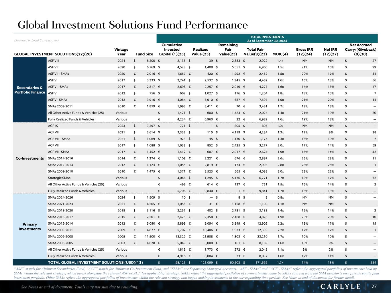 R-14 7 G-19 5 B-19 7 R-88 G-15 9 B-16 5 R-13 6 G-18 0 B-83 R-16 3 G-14 3 B-18 7 R-0 G-74 B-13 6 R-18 5 G-21 1 B-15 3 R-11 8 G-92 B-15 0 R-22 0 G-22 1 B-23 2 R-14 0 G-14 1 B-15 2R-12 0 G-16 9 B-22 2 Old Colors R-88 G-89 B-91 58595B R-23 G-234 B-234 EAEAEA R-208 G-232 B-247 D0E8F7 R-65 G-64 B-66 414042 R-8 G-51 B-94 08335E R-167 G-169 B-171 A7A9AB R-9 G-102 B-112 096670 R-220 G-221 B-222 DCDDDE R-97 G-161 B-224 61A1E0 R-237 G-217 B-157 EDD99D R-147 G-195 B-197 93C3C5 27 Global Investment Solutions Fund Performance (Reported in Local Currency, mn) TOTAL INVESTMENTS As of September 30, 2024 GLOBAL INVESTMENT SOLUTIONS(22)(26) Vintage Year Fund Size Cumulative Invested Capital (1)(23) Realized Value (23) Remaining Fair Value(23) Total Fair Value(9)(23) MOIC(4) Gross IRR (12)(24) Net IRR (12)(27) Net Accrued Carry/(Giveback) (8)(30) Secondaries & Portfolio Finance ASF VIII 2024 $ 8,200 $ 2,138 $ 39 $ 2,883 $ 2,922 1.4x NM NM $ 27 ASF VII 2020 $ 6,769 $ 4,528 $ 1,408 $ 5,551 $ 6,960 1.5x 21% 16% $ 99 ASF VII - SMAs 2020 € 2,016 € 1,657 € 420 € 1,992 € 2,412 1.5x 20% 17% $ 34 ASF VI 2017 $ 3,333 $ 2,741 $ 2,537 $ 1,945 $ 4,482 1.6x 16% 13% $ 56 ASF VI - SMAs 2017 € 2,817 € 2,698 € 2,257 € 2,019 € 4,277 1.6x 14% 13% $ 47 ASF V 2012 $ 756 $ 662 $ 1,027 $ 176 $ 1,204 1.8x 18% 15% $ 7 ASF V - SMAs 2012 € 3,916 € 4,054 € 6,910 € 687 € 7,597 1.9x 21% 20% $ 14 SMAs 2009-2011 2010 € 1,859 € 1,993 € 3,411 € 70 € 3,481 1.7x 19% 18% $ — All Other Active Funds & Vehicles (25) Various $ 1,471 $ 600 $ 1,423 $ 2,024 1.4x 21% 19% $ 20 Fully Realized Funds & Vehicles Various € 4,234 € 6,960 € 22 € 6,982 1.6x 19% 18% $ — Co-Investments ACF IX 2023 $ 3,297 $ 771 $ 1 $ 805 $ 805 1.0x NM NM $ — ACF VIII 2021 $ 3,614 $ 3,338 $ 115 $ 4,119 $ 4,234 1.3x 12% 9% $ 28 ACF VIII - SMAs 2021 $ 1,069 $ 923 $ 45 $ 1,130 $ 1,175 1.3x 13% 10% $ 7 ACF VII 2017 $ 1,688 $ 1,638 $ 852 $ 2,425 $ 3,277 2.0x 17% 14% $ 59 ACF VII - SMAs 2017 € 1,452 € 1,412 € 607 € 2,017 € 2,624 1.9x 16% 14% $ 42 SMAs 2014-2016 2014 € 1,274 € 1,108 € 2,221 € 676 € 2,897 2.6x 25% 23% $ 11 SMAs 2012-2013 2012 € 1,124 € 1,055 € 2,819 € 174 € 2,993 2.8x 28% 26% $ 1 SMAs 2009-2010 2010 € 1,475 € 1,371 € 3,523 € 565 € 4,088 3.0x 23% 22% $ — Strategic SMAs Various $ 4,046 $ 1,295 $ 5,476 $ 6,771 1.7x 18% 17% $ 72 All Other Active Funds & Vehicles (25) Various € 499 € 614 € 137 € 751 1.5x 16% 14% $ 2 Fully Realized Funds & Vehicles Various € 5,706 € 9,840 € 1 € 9,841 1.7x 15% 13% $ — Primary Investments SMAs 2024-2026 2024 $ 1,509 $ 10 $ — $ 8 $ 8 0.8x NM NM $ — SMAs 2021-2023 2021 € 4,505 € 1,055 € 31 € 1,158 € 1,190 1.1x NM NM $ — SMAs 2018-2020 2018 $ 3,116 $ 2,257 $ 402 $ 2,781 $ 3,183 1.4x 15% 14% $ 2 SMAs 2015-2017 2015 € 2,501 € 2,475 € 2,358 € 2,468 € 4,826 1.9x 20% 20% $ 10 SMAs 2012-2014 2012 € 5,080 € 5,899 € 9,054 € 3,849 € 12,902 2.2x 18% 17% $ 15 SMAs 2009-2011 2009 € 4,877 € 5,702 € 10,406 € 1,933 € 12,339 2.2x 17% 17% $ 1 SMAs 2006-2008 2005 € 11,500 € 13,322 € 21,908 € 1,303 € 23,210 1.7x 10% 10% $ — SMAs 2003-2005 2003 € 4,628 € 5,049 € 8,008 € 161 € 8,169 1.6x 10% 9% $ — All Other Active Funds & Vehicles (25) Various € 1,813 € 1,773 € 272 € 2,045 1.1x 3% 2% $ — Fully Realized Funds & Vehicles Various € 4,916 € 8,004 € 33 € 8,037 1.6x 12% 11% $ — TOTAL GLOBAL INVESTMENT SOLUTIONS (USD)(13) $ 98,125 $ 121,059 $ 50,503 $ 171,562 1.7x 14% 13% $ 554 See Notes at end of document. Totals may not sum due to rounding. “ASF” stands for AlpInvest Secondaries Fund, “ACF” stands for AlpInvest Co-Investment Fund, and “SMAs” are Separately Managed Accounts. “ASF - SMAs” and “ACF - SMAs” reflect the aggregated portfolios of investments held by SMAs within the relevant strategy, which invest alongside the relevant ASF or ACF (as applicable). Strategic SMAs reflect the aggregated portfolios of co-investments made by SMAs sourced from the SMA investor’s own private equity fund investment portfolio. Other SMAs reflect the aggregated portfolios of investments within the relevant strategy that began making investments in the corresponding time periods. See Notes at end of document for further detail.