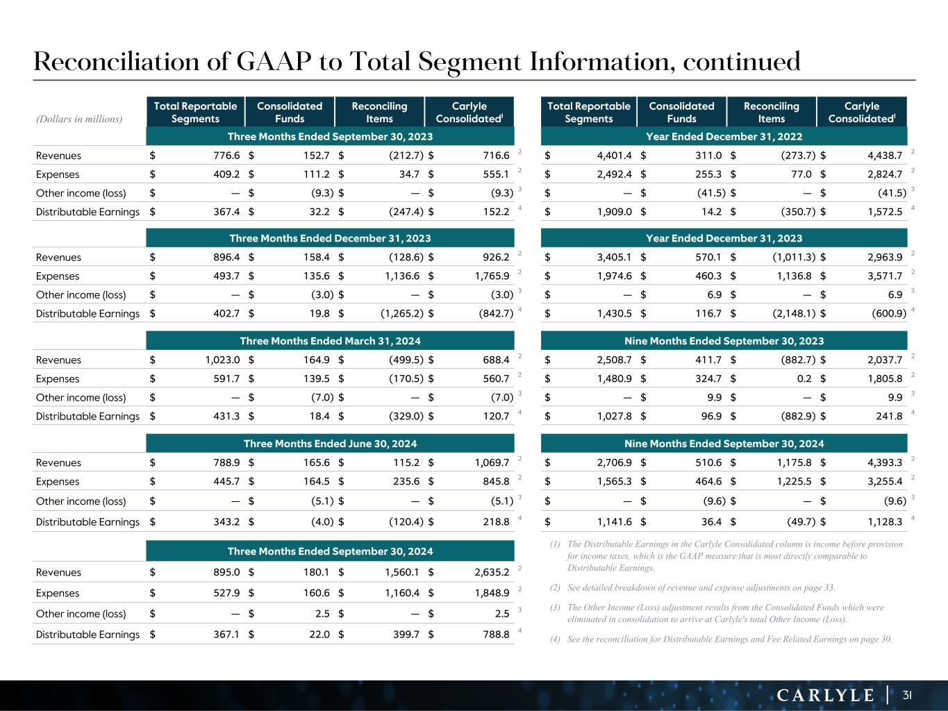 R-14 7 G-19 5 B-19 7 R-88 G-15 9 B-16 5 R-13 6 G-18 0 B-83 R-16 3 G-14 3 B-18 7 R-0 G-74 B-13 6 R-18 5 G-21 1 B-15 3 R-11 8 G-92 B-15 0 R-22 0 G-22 1 B-23 2 R-14 0 G-14 1 B-15 2R-12 0 G-16 9 B-22 2 Old Colors R-88 G-89 B-91 58595B R-23 G-234 B-234 EAEAEA R-208 G-232 B-247 D0E8F7 R-65 G-64 B-66 414042 R-8 G-51 B-94 08335E R-167 G-169 B-171 A7A9AB R-9 G-102 B-112 096670 R-220 G-221 B-222 DCDDDE R-97 G-161 B-224 61A1E0 R-237 G-217 B-157 EDD99D R-147 G-195 B-197 93C3C5 30 Reconciliation of GAAP to Total Segment Information (1) Effective December 31, 2023, we realigned our employee compensation program to increase the proportion of our performance allocations used to compensate our employees. Net realized performance and fee related performance revenues in 4Q’23 and FY 2023 include a one-time charge of $1.1 billion to unrealized performance allocations and incentive fee related compensation expense related to this compensation realignment. (2) In connection with the initial drawdown of the March 2022 capital raise from Fortitude, the Company’s indirect ownership of Fortitude decreased from 19.9% to 13.5%. As a result of the dilution, the Company recorded a reduction in the carrying value of its equity method investment and corresponding loss of $177 million in 2Q’22. In 2Q’23, the remaining capital was called by Fortitude and the Company’s indirect ownership further decreased to 10.5%. As a result of this dilution, the Company recorded an additional reduction in carrying value and corresponding loss of $104 million. These amounts are excluded from the total segment results. (3) Equity-based compensation includes amounts reflected in principal investment income and general, administrative and other expense in our U.S. GAAP statement of operations. (4) Includes charges (credits) related to Carlyle corporate actions and non-recurring items that affect period-to-period comparability and are not reflective of the Company’s operating performance. (Dollars in millions) 3Q'23 4Q'23 1Q'24 2Q'24 3Q'24 YTD 3Q'23 YTD 3Q'24 FY'22 FY'23 INCOME (LOSS) BEFORE PROVISION FOR INCOME TAXES $ 152.2 $ (842.7) $ 120.7 $ 218.8 $ 788.8 $ 241.8 $ 1,128.3 $ 1,572.5 $ (600.9) Adjustments: Net unrealized performance and fee related performance revenues1 138.9 1,187.6 193.2 (15.2) (564.4) 471.6 (386.4) (183.7) 1,659.2 Unrealized principal investment (income) loss (17.1) (17.6) (4.4) (48.1) (1.8) (18.5) (54.3) 38.3 (36.1) Principal investment loss from dilution of indirect investment in Fortitude2 — — — — — 104.0 — 176.9 104.0 Equity-based compensation3 67.3 65.0 111.0 127.4 122.0 195.1 360.4 161.9 260.1 Acquisition related charges, including amortization of intangibles and impairment 50.6 32.3 32.8 33.3 37.4 113.0 103.5 187.4 145.3 Tax (expense) benefit associated with certain foreign performance revenues (0.2) (0.2) (1.0) (0.2) (0.2) (0.8) (1.4) 3.0 (1.0) Net (income) loss attributable to non-controlling interests in consolidated entities (29.7) (21.7) (33.2) (1.1) (20.0) (90.0) (54.3) (59.7) (111.7) Other adjustments 4 5.4 — 12.2 28.3 5.3 11.6 45.8 12.4 11.6 DISTRIBUTABLE EARNINGS $ 367.4 $ 402.7 $ 431.3 $ 343.2 $ 367.1 $ 1,027.8 $ 1,141.6 $ 1,909.0 $ 1,430.5 Realized net performance revenues 150.0 136.4 142.0 55.7 90.6 394.6 288.3 998.5 531.0 Realized principal investment income 23.4 19.5 33.7 26.6 9.1 69.3 69.4 150.6 88.8 Net interest 10.7 7.2 10.7 12.1 10.5 41.5 33.3 74.5 48.7 FEE RELATED EARNINGS $ 204.7 $ 254.0 $ 266.3 $ 273.0 $ 277.9 $ 605.4 $ 817.2 $ 834.4 $ 859.4