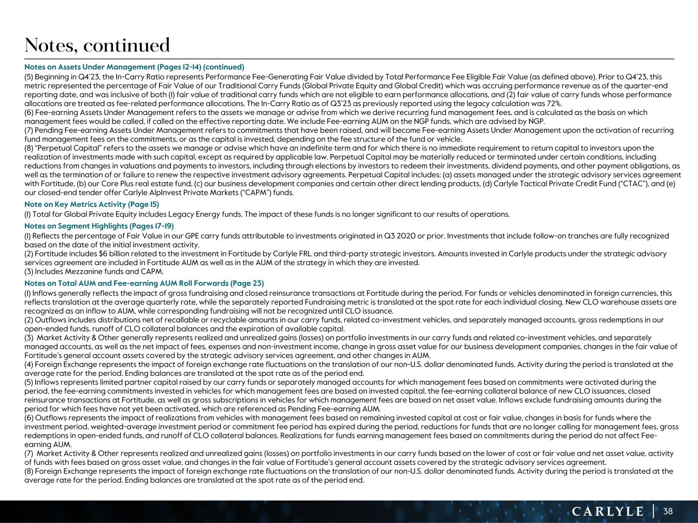 R-14 7 G-19 5 B-19 7 R-88 G-15 9 B-16 5 R-13 6 G-18 0 B-83 R-16 3 G-14 3 B-18 7 R-0 G-74 B-13 6 R-18 5 G-21 1 B-15 3 R-11 8 G-92 B-15 0 R-22 0 G-22 1 B-23 2 R-14 0 G-14 1 B-15 2R-12 0 G-16 9 B-22 2 Old Colors R-88 G-89 B-91 58595B R-23 G-234 B-234 EAEAEA R-208 G-232 B-247 D0E8F7 R-65 G-64 B-66 414042 R-8 G-51 B-94 08335E R-167 G-169 B-171 A7A9AB R-9 G-102 B-112 096670 R-220 G-221 B-222 DCDDDE R-97 G-161 B-224 61A1E0 R-237 G-217 B-157 EDD99D R-147 G-195 B-197 93C3C5 37 Notes Dividend Policy Our dividend policy for our common stock is an annual rate of $1.40 per share ($0.35 per common share on a quarterly basis), which commenced with the first quarter 2023 dividend paid in May 2023. Prior to the first quarter 2023 dividend, our dividend policy for our common stock was an annual rate of $1.30 per share of common stock ($0.325 per common share on a quarterly basis). The declaration and payment of any dividends to holders of our common stock are subject to the discretion of our Board of Directors, which may change our dividend policy at any time or from time to time, and the terms of our amended and restated certificate of incorporation. There can be no assurance that dividends will be made as intended or at all or that any particular dividend policy will be maintained. Non-GAAP Financial Measures This press release contains financial measures that are calculated and presented on the basis of methodologies other than in accordance with generally accepted accounting principles in the United States of America. These non-GAAP financial measures should be considered in addition to and not as a substitute for, or superior to, financial measures presented in accordance with U.S. GAAP. The reasons management believes that these non-GAAP financial measures provide useful information are set forth in our most recent Annual Report on Form 10-K filed with the SEC. A reconciliation of any forward-looking non-GAAP financial measures cannot be provided without unreasonable effort because of the inherent difficulty of accurately forecasting the occurrence and financial impact of the various adjusting items necessary for such reconciliation that have not yet occurred, are out of our control, or cannot be reasonably predicted. For the same reasons, Carlyle is unable to assess the probable significance of the unavailable information, which could have a material impact on its future GAAP financial results. Notes on Carlyle Consolidated GAAP Results (Page 5) (1) Income (loss) before provision for income taxes is the GAAP measure that is most directly comparable to Distributable Earnings, which management uses to measure the performance of the business. A full reconciliation is included starting on page 30. (2) Income (loss) before provision for taxes margin is equal to Income (loss) before provision for taxes, divided by Total revenues. (3) Net performance revenues are equal to Performance revenues less Performance revenues related compensation expense. Note on Fee Related Earnings (Page 9) (1) FRE Margin is calculated as Fee Related Earnings, divided by Total Segment Fee Revenues. Effective December 31, 2023, we realigned of our employee compensation program, which increased the proportion of our accrued performance allocations used to compensate our employees. This led to a lower FRE compensation ratio, which is calculated as total segment cash- based compensation and benefits, divided by total segment fee revenues, and a higher realized performance revenue compensation ratio. Notes on Performance Revenues (Page 11) (1) We generally earn performance revenues (or carried interest) from our carry funds representing a 20% allocation of profits generated on third-party capital, and on which the general partner receives a special residual allocation of income from limited partners, which we refer to as carried interest, in the event that specified investment returns are achieved by the fund. Disclosures referring to carry funds also include the impact of certain commitments that do not earn carried interest, but are either part of, or associated with, our carry funds. The rate of carried interest, as well as the share of carried interest allocated to Carlyle, may vary across the carry fund platform. See “Non-GAAP Financial Measures” for more information. A reconciliation of accrued performance allocations to total segment net accrued performance revenues is included on page 34. (2) Includes the change in performance revenue accrual from positive or negative movements in portfolio valuation, incremental preferred return and fees, foreign exchange fluctuations and acquisition/divestiture activity. See “Non-GAAP Financial Measures” for more information. See page 32 for a reconciliation of performance revenues to realized net performance revenues. (3) Total for Global Private Equity includes Legacy Energy funds. The impact of these funds is no longer significant to our results of operations. Notes on Assets Under Management (Pages 12-14) (1) Total Assets Under Management refers to the assets we manage or advise, and reflects the sum of the unrealized Fair Value of Investments and Available Capital. We also include the NGP funds, which are advised by NGP. (2) Available Capital refers to the amount of capital commitments available to be called for investments, which may be reduced for equity invested that is funded via fund credit facility and expected to be called from investors at a later date, plus any additional assets/liabilities at the fund level other than active investments. Amounts previously called may be added back to available capital following certain distributions. (3) Credit (Non-Carry Funds) includes our CLOs, business development companies and related managed accounts, the Carlyle Tactical Private Credit Fund, as well as securitization vehicles and various managed accounts in our Carlyle Aviation business. "Other" includes certain managed account vehicles. Total AUM for Fortitude includes $6 bil