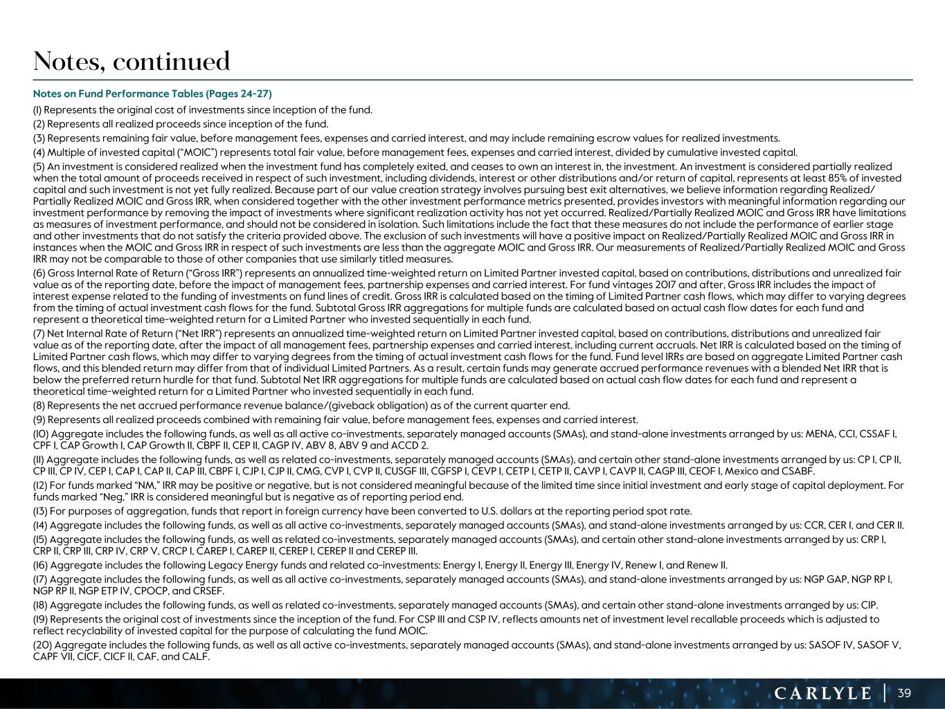R-14 7 G-19 5 B-19 7 R-88 G-15 9 B-16 5 R-13 6 G-18 0 B-83 R-16 3 G-14 3 B-18 7 R-0 G-74 B-13 6 R-18 5 G-21 1 B-15 3 R-11 8 G-92 B-15 0 R-22 0 G-22 1 B-23 2 R-14 0 G-14 1 B-15 2R-12 0 G-16 9 B-22 2 Old Colors R-88 G-89 B-91 58595B R-23 G-234 B-234 EAEAEA R-208 G-232 B-247 D0E8F7 R-65 G-64 B-66 414042 R-8 G-51 B-94 08335E R-167 G-169 B-171 A7A9AB R-9 G-102 B-112 096670 R-220 G-221 B-222 DCDDDE R-97 G-161 B-224 61A1E0 R-237 G-217 B-157 EDD99D R-147 G-195 B-197 93C3C5 38 Notes, continued Notes on Assets Under Management (Pages 12-14) (continued) (5) Beginning in Q4’23, the In-Carry Ratio represents Performance Fee-Generating Fair Value divided by Total Performance Fee Eligible Fair Value (as defined above). Prior to Q4’23, this metric represented the percentage of Fair Value of our Traditional Carry Funds (Global Private Equity and Global Credit) which was accruing performance revenue as of the quarter-end reporting date, and was inclusive of both (1) fair value of traditional carry funds which are not eligible to earn performance allocations, and (2) fair value of carry funds whose performance allocations are treated as fee-related performance allocations. The In-Carry Ratio as of Q3’23 as previously reported using the legacy calculation was 72%. (6) Fee-earning Assets Under Management refers to the assets we manage or advise from which we derive recurring fund management fees, and is calculated as the basis on which management fees would be called, if called on the effective reporting date. We include Fee-earning AUM on the NGP funds, which are advised by NGP. (7) Pending Fee-earning Assets Under Management refers to commitments that have been raised, and will become Fee-earning Assets Under Management upon the activation of recurring fund management fees on the commitments, or as the capital is invested, depending on the fee structure of the fund or vehicle. (8) “Perpetual Capital” refers to the assets we manage or advise which have an indefinite term and for which there is no immediate requirement to return capital to investors upon the realization of investments made with such capital, except as required by applicable law. Perpetual Capital may be materially reduced or terminated under certain conditions, including reductions from changes in valuations and payments to investors, including through elections by investors to redeem their investments, dividend payments, and other payment obligations, as well as the termination of or failure to renew the respective investment advisory agreements. Perpetual Capital includes: (a) assets managed under the strategic advisory services agreement with Fortitude, (b) our Core Plus real estate fund, (c) our business development companies and certain other direct lending products, (d) Carlyle Tactical Private Credit Fund (“CTAC”), and (e) our closed-end tender offer Carlyle AlpInvest Private Markets (“CAPM”) funds. Note on Key Metrics Activity (Page 15) (1) Total for Global Private Equity includes Legacy Energy funds. The impact of these funds is no longer significant to our results of operations. Notes on Segment Highlights (Pages 17-19) (1) Reflects the percentage of Fair Value in our GPE carry funds attributable to investments originated in Q3 2020 or prior. Investments that include follow-on tranches are fully recognized based on the date of the initial investment activity. (2) Fortitude includes $6 billion related to the investment in Fortitude by Carlyle FRL and third-party strategic investors. Amounts invested in Carlyle products under the strategic advisory services agreement are included in Fortitude AUM as well as in the AUM of the strategy in which they are invested. (3) Includes Mezzanine funds and CAPM. Notes on Total AUM and Fee-earning AUM Roll Forwards (Page 23) (1) Inflows generally reflects the impact of gross fundraising and closed reinsurance transactions at Fortitude during the period. For funds or vehicles denominated in foreign currencies, this reflects translation at the average quarterly rate, while the separately reported Fundraising metric is translated at the spot rate for each individual closing. New CLO warehouse assets are recognized as an inflow to AUM, while corresponding fundraising will not be recognized until CLO issuance. (2) Outflows includes distributions net of recallable or recyclable amounts in our carry funds, related co-investment vehicles, and separately managed accounts, gross redemptions in our open-ended funds, runoff of CLO collateral balances and the expiration of available capital. (3) Market Activity & Other generally represents realized and unrealized gains (losses) on portfolio investments in our carry funds and related co-investment vehicles, and separately managed accounts, as well as the net impact of fees, expenses and non-investment income, change in gross asset value for our business development companies, changes in the fair value of Fortitude’s general account assets covered by the strategic advisory services agreement, and other changes in AUM. (4) Foreign Exchange represents the impact of foreign exchange rate fluctuations on the translation of our non-U.S. dollar denominated funds. Activity during the period is translated at the average rate for the period. Ending balances are translated at the spot rate as of the period end. (5) Inflows represents limited partner capital raised by our carry funds or separately managed accounts for which management fees based on commitments were activated during the period, the fee-earning commitments invested in vehicles for which management fees are based on invested capital, the fee-earning collateral balance of new CLO issuances, closed reinsurance transactions at Fortitude, as well as gross subscriptions in vehicles for which management fees are based on net asset value. Inflows exclude fundraising amounts during the period for which fees have not yet been activated, which are referenced as Pending Fee-earning AUM. (6) Outflows 