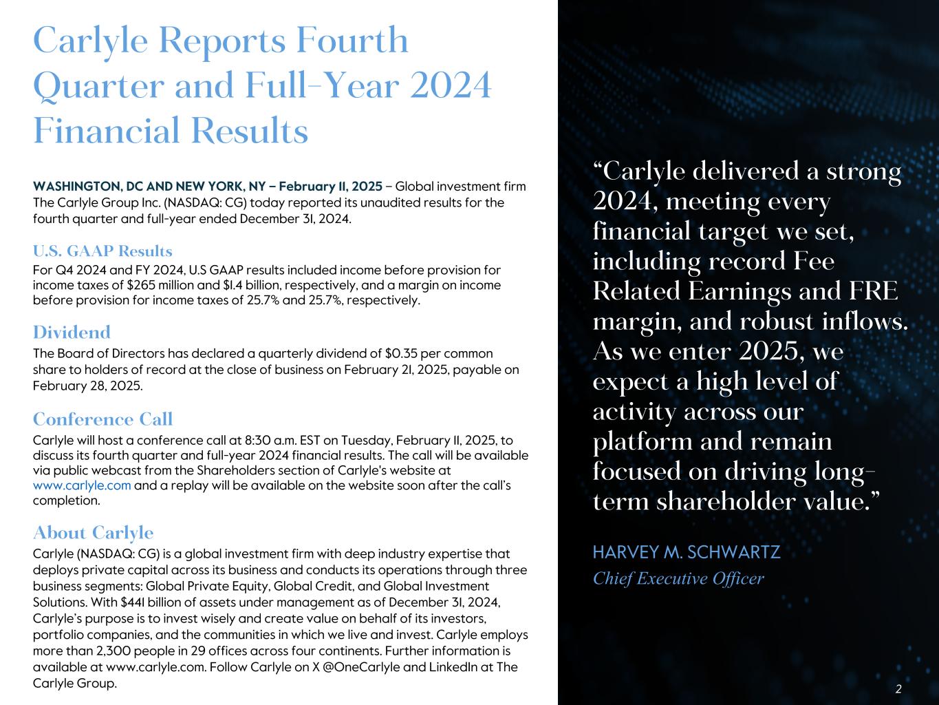 Carlyle Reports Fourth Quarter and Full-Year 2024 Financial Results WASHINGTON, DC AND NEW YORK, NY – February 11, 2025 – Global investment firm The Carlyle Group Inc. (NASDAQ: CG) today reported its unaudited results for the fourth quarter and full-year ended December 31, 2024. U.S. GAAP Results For Q4 2024 and FY 2024, U.S GAAP results included income before provision for income taxes of $265 million and $1.4 billion, respectively, and a margin on income before provision for income taxes of 25.7% and 25.7%, respectively. Dividend The Board of Directors has declared a quarterly dividend of $0.35 per common share to holders of record at the close of business on February 21, 2025, payable on February 28, 2025. Conference Call Carlyle will host a conference call at 8:30 a.m. EST on Tuesday, February 11, 2025, to discuss its fourth quarter and full-year 2024 financial results. The call will be available via public webcast from the Shareholders section of Carlyle's website at www.carlyle.com and a replay will be available on the website soon after the call’s completion. About Carlyle Carlyle (NASDAQ: CG) is a global investment firm with deep industry expertise that deploys private capital across its business and conducts its operations through three business segments: Global Private Equity, Global Credit, and Global Investment Solutions. With $441 billion of assets under management as of December 31, 2024, Carlyle’s purpose is to invest wisely and create value on behalf of its investors, portfolio companies, and the communities in which we live and invest. Carlyle employs more than 2,300 people in 29 offices across four continents. Further information is available at www.carlyle.com. Follow Carlyle on X @OneCarlyle and LinkedIn at The Carlyle Group. 2 “Carlyle delivered a strong 2024, meeting every financial target we set, including record Fee Related Earnings and FRE margin, and robust inflows. As we enter 2025, we expect a high level of activity across our platform and remain focused on driving long- term shareholder value.” HARVEY M. SCHWARTZ Chief Executive Officer