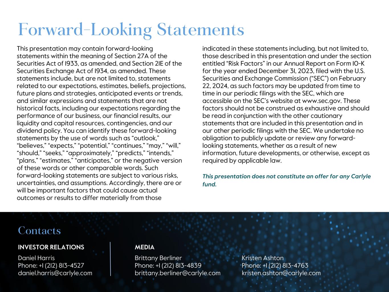 This presentation may contain forward-looking statements within the meaning of Section 27A of the Securities Act of 1933, as amended, and Section 21E of the Securities Exchange Act of 1934, as amended. These statements include, but are not limited to, statements related to our expectations, estimates, beliefs, projections, future plans and strategies, anticipated events or trends, and similar expressions and statements that are not historical facts, including our expectations regarding the performance of our business, our financial results, our liquidity and capital resources, contingencies, and our dividend policy. You can identify these forward-looking statements by the use of words such as “outlook,” “believes,” “expects,” “potential,” “continues,” “may,” “will,” “should,” “seeks,” “approximately,” “predicts,” “intends,” “plans,” “estimates,” “anticipates,” or the negative version of these words or other comparable words. Such forward-looking statements are subject to various risks, uncertainties, and assumptions. Accordingly, there are or will be important factors that could cause actual outcomes or results to differ materially from those Forward-Looking Statements indicated in these statements including, but not limited to, those described in this presentation and under the section entitled “Risk Factors” in our Annual Report on Form 10-K for the year ended December 31, 2023, filed with the U.S. Securities and Exchange Commission (“SEC”) on February 22, 2024, as such factors may be updated from time to time in our periodic filings with the SEC, which are accessible on the SEC’s website at www.sec.gov. These factors should not be construed as exhaustive and should be read in conjunction with the other cautionary statements that are included in this presentation and in our other periodic filings with the SEC. We undertake no obligation to publicly update or review any forward- looking statements, whether as a result of new information, future developments, or otherwise, except as required by applicable law. This presentation does not constitute an offer for any Carlyle fund. Contacts INVESTOR RELATIONS MEDIA Daniel Harris Brittany Berliner Kristen Ashton Phone: +1 (212) 813-4527 Phone: +1 (212) 813-4839 Phone: +1 (212) 813-4763 daniel.harris@carlyle.com brittany.berliner@carlyle.com kristen.ashton@carlyle.com