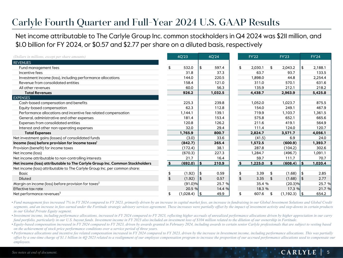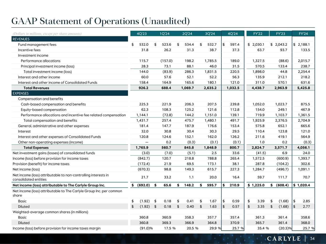 R-14 7 G-19 5 B-19 7 R-88 G-15 9 B-16 5 R-13 6 G-18 0 B-83 R-16 3 G-14 3 B-18 7 R-0 G-74 B-13 6 R-18 5 G-21 1 B-15 3 R-11 8 G-92 B-15 0 R-22 0 G-22 1 B-23 2 R-14 0 G-14 1 B-15 2R-12 0 G-16 9 B-22 2 Old Colors R-88 G-89 B-91 58595B R-23 G-234 B-234 EAEAEA R-208 G-232 B-247 D0E8F7 R-65 G-64 B-66 414042 R-8 G-51 B-94 08335E R-167 G-169 B-171 A7A9AB R-9 G-102 B-112 096670 R-220 G-221 B-222 DCDDDE R-97 G-161 B-224 61A1E0 R-237 G-217 B-157 EDD99D R-147 G-195 B-197 93C3C5 GAAP Statement of Operations (Unaudited) (Dollars in millions, except per share amounts) 4Q'23 1Q’24 2Q’24 3Q’24 4Q'24 FY'22 FY'23 FY'24 REVENUES Fund management fees $ 532.0 $ 523.6 $ 534.4 $ 532.7 $ 597.4 $ 2,030.1 $ 2,043.2 $ 2,188.1 Incentive fees 31.8 26.2 31.3 38.7 37.3 63.7 93.7 133.5 Investment income Performance allocations 115.7 (157.0) 198.2 1,785.5 189.0 1,327.5 (88.6) 2,015.7 Principal investment income (loss) 28.3 73.1 88.1 46.0 31.5 570.5 133.4 238.7 Total investment income (loss) 144.0 (83.9) 286.3 1,831.5 220.5 1,898.0 44.8 2,254.4 Interest and other income 60.0 57.6 52.1 52.2 56.3 135.9 212.1 218.2 Interest and other income of Consolidated Funds 158.4 164.9 165.6 180.1 121.0 311.0 570.1 631.6 Total Revenues 926.2 688.4 1,069.7 2,635.2 1,032.5 4,438.7 2,963.9 5,425.8 EXPENSES Compensation and benefits Cash-based compensation and benefits 225.3 221.9 206.3 207.5 239.8 1,052.0 1,023.7 875.5 Equity-based compensation 62.3 108.3 125.2 121.6 112.8 154.0 249.1 467.9 Performance allocations and incentive fee related compensation 1,144.1 (72.8) 144.2 1,151.0 139.1 719.9 1,103.7 1,361.5 Total compensation and benefits 1,431.7 257.4 475.7 1,480.1 491.7 1,925.9 2,376.5 2,704.9 General, administrative and other expenses 181.4 147.7 187.9 176.6 153.4 575.8 652.1 665.6 Interest 32.0 30.8 30.4 30.3 29.5 110.4 123.8 121.0 Interest and other expenses of Consolidated Funds 120.8 124.6 152.1 162.0 126.2 211.6 419.1 564.9 Other non-operating expenses (income) — 0.2 (0.3) (0.1) (0.1) 1.0 0.2 (0.3) Total Expenses 1,765.9 560.7 845.8 1,848.9 800.7 2,824.7 3,571.7 4,056.1 Net investment gains (losses) of consolidated funds (3.0) (7.0) (5.1) 2.5 33.6 (41.5) 6.9 24.0 Income (loss) before provision for income taxes (842.7) 120.7 218.8 788.8 265.4 1,572.5 (600.9) 1,393.7 Provision (benefit) for income taxes (172.4) 21.9 69.5 173.1 38.1 287.8 (104.2) 302.6 Net income (loss) (670.3) 98.8 149.3 615.7 227.3 1,284.7 (496.7) 1,091.1 Net income (loss) attributable to non-controlling interests in consolidated entities 21.7 33.2 1.1 20.0 16.4 59.7 111.7 70.7 Net income (loss) attributable to The Carlyle Group Inc. $ (692.0) $ 65.6 $ 148.2 $ 595.7 $ 210.9 $ 1,225.0 $ (608.4) $ 1,020.4 Net income (loss) attributable to The Carlyle Group Inc. per common share Basic $ (1.92) $ 0.18 $ 0.41 $ 1.67 $ 0.59 $ 3.39 $ (1.68) $ 2.85 Diluted $ (1.92) $ 0.18 $ 0.40 $ 1.63 $ 0.57 $ 3.35 $ (1.68) $ 2.77 Weighted-average common shares (in millions) Basic 360.8 360.9 358.3 357.7 357.4 361.3 361.4 358.6 Diluted 360.8 369.3 366.9 364.8 370.9 365.7 361.4 368.0 Income (loss) before provision for income taxes margin (91.0) % 17.5 % 20.5 % 29.9 % 25.7 % 35.4 % (20.3) % 25.7 % 34