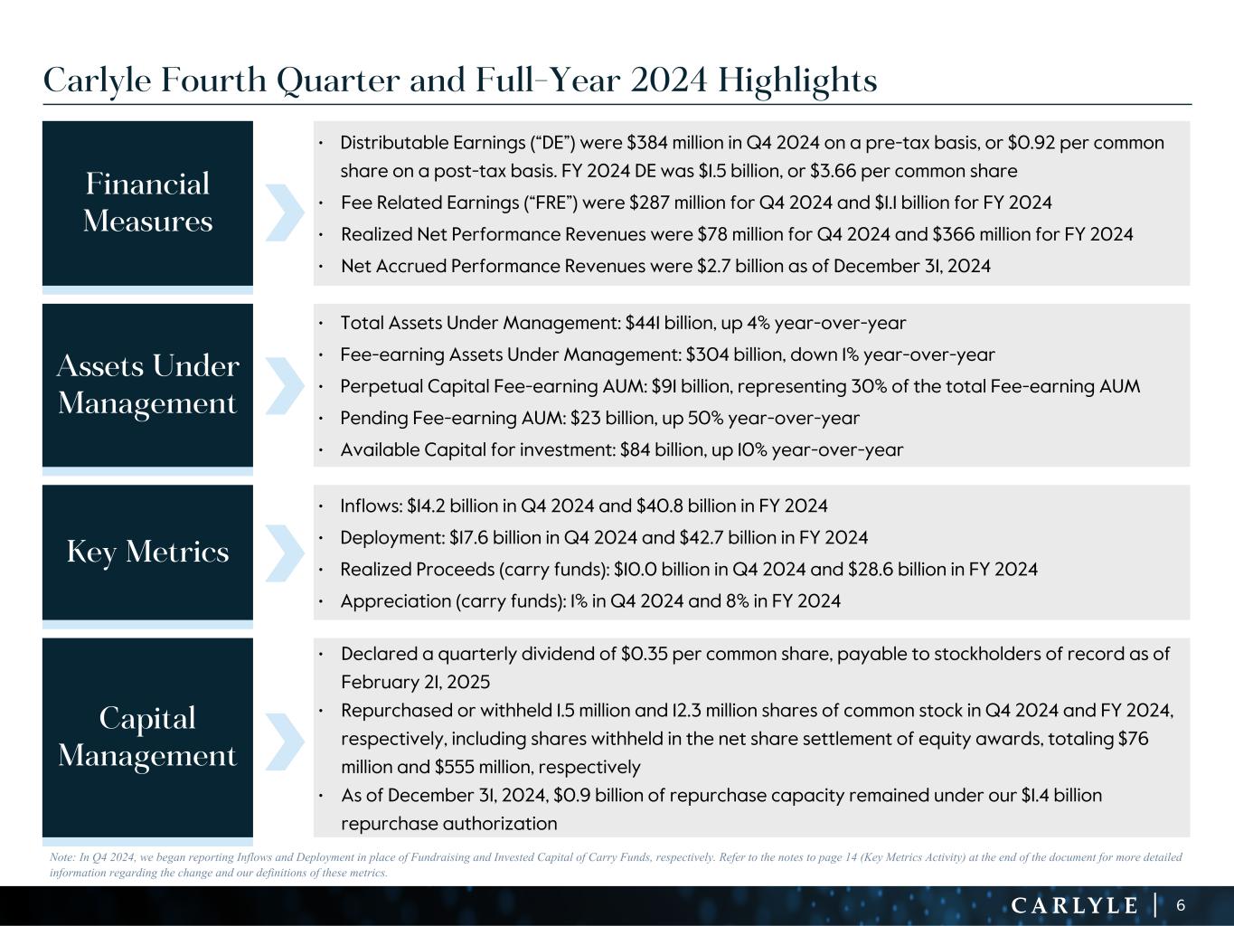 R-14 7 G-19 5 B-19 7 R-88 G-15 9 B-16 5 R-13 6 G-18 0 B-83 R-16 3 G-14 3 B-18 7 R-0 G-74 B-13 6 R-18 5 G-21 1 B-15 3 R-11 8 G-92 B-15 0 R-22 0 G-22 1 B-23 2 R-14 0 G-14 1 B-15 2R-12 0 G-16 9 B-22 2 Old Colors R-88 G-89 B-91 58595B R-23 G-234 B-234 EAEAEA R-208 G-232 B-247 D0E8F7 R-65 G-64 B-66 414042 R-8 G-51 B-94 08335E R-167 G-169 B-171 A7A9AB R-9 G-102 B-112 096670 R-220 G-221 B-222 DCDDDE R-97 G-161 B-224 61A1E0 R-237 G-217 B-157 EDD99D R-147 G-195 B-197 93C3C5 Financial Measures • Distributable Earnings (“DE”) were $384 million in Q4 2024 on a pre-tax basis, or $0.92 per common share on a post-tax basis. FY 2024 DE was $1.5 billion, or $3.66 per common share • Fee Related Earnings (“FRE”) were $287 million for Q4 2024 and $1.1 billion for FY 2024 • Realized Net Performance Revenues were $78 million for Q4 2024 and $366 million for FY 2024 • Net Accrued Performance Revenues were $2.7 billion as of December 31, 2024 Assets Under Management • Total Assets Under Management: $441 billion, up 4% year-over-year • Fee-earning Assets Under Management: $304 billion, down 1% year-over-year • Perpetual Capital Fee-earning AUM: $91 billion, representing 30% of the total Fee-earning AUM • Pending Fee-earning AUM: $23 billion, up 50% year-over-year • Available Capital for investment: $84 billion, up 10% year-over-year Key Metrics • Inflows: $14.2 billion in Q4 2024 and $40.8 billion in FY 2024 • Deployment: $17.6 billion in Q4 2024 and $42.7 billion in FY 2024 • Realized Proceeds (carry funds): $10.0 billion in Q4 2024 and $28.6 billion in FY 2024 • Appreciation (carry funds): 1% in Q4 2024 and 8% in FY 2024 Capital Management • Declared a quarterly dividend of $0.35 per common share, payable to stockholders of record as of February 21, 2025 • Repurchased or withheld 1.5 million and 12.3 million shares of common stock in Q4 2024 and FY 2024, respectively, including shares withheld in the net share settlement of equity awards, totaling $76 million and $555 million, respectively • As of December 31, 2024, $0.9 billion of repurchase capacity remained under our $1.4 billion repurchase authorization Carlyle Fourth Quarter and Full-Year 2024 Highlights 6 Note: In Q4 2024, we began reporting Inflows and Deployment in place of Fundraising and Invested Capital of Carry Funds, respectively. Refer to the notes to page 14 (Key Metrics Activity) at the end of the document for more detailed information regarding the change and our definitions of these metrics.