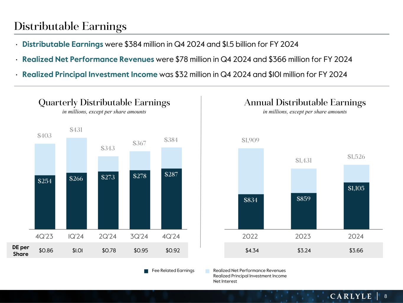 R-14 7 G-19 5 B-19 7 R-88 G-15 9 B-16 5 R-13 6 G-18 0 B-83 R-16 3 G-14 3 B-18 7 R-0 G-74 B-13 6 R-18 5 G-21 1 B-15 3 R-11 8 G-92 B-15 0 R-22 0 G-22 1 B-23 2 R-14 0 G-14 1 B-15 2R-12 0 G-16 9 B-22 2 Old Colors R-88 G-89 B-91 58595B R-23 G-234 B-234 EAEAEA R-208 G-232 B-247 D0E8F7 R-65 G-64 B-66 414042 R-8 G-51 B-94 08335E R-167 G-169 B-171 A7A9AB R-9 G-102 B-112 096670 R-220 G-221 B-222 DCDDDE R-97 G-161 B-224 61A1E0 R-237 G-217 B-157 EDD99D R-147 G-195 B-197 93C3C5 Carlyle Fourth Quarter and Full-Year 2024 Total Segment Operating Results (1) Fee related performance revenues are the realized portion of performance revenues that are measured and received on a recurring basis, are not dependent on the disposition of investments, and which are not at risk of giveback. The related compensation expense is included in cash-based compensation and benefits. (2) A reconciliation of Distributable Earnings to After-tax Distributable Earnings per common share is provided on page 28. (3) The Board of Directors has declared a quarterly dividend of $0.35 per common share to holders of record at the close of business on February 21, 2025, payable on February 28, 2025. See Notes at the end of the document for our Dividend Policy. (Dollars in millions, except per share amounts) 4Q'23 4Q'24 FY'23 FY'24 SEGMENT REVENUES Fund management fees $ 525.1 $ 539.9 $ 2,064.4 $ 2,107.5 Transaction and portfolio advisory fees, net and other 34.6 80.6 80.4 163.6 Fee related performance revenues1 35.6 34.2 161.0 132.7 Total segment fee revenues 595.3 654.7 2,305.8 2,403.8 Realized performance revenues 257.7 245.7 938.3 1,075.9 Realized principal investment income 19.5 31.6 88.8 101.0 Interest income 23.9 16.5 72.2 74.7 Total Segment Revenues $ 896.4 $ 948.5 $ 3,405.1 $ 3,655.4 SEGMENT EXPENSES Compensation and benefits Cash-based compensation and benefits $ 226.6 $ 234.5 $ 1,031.9 $ 861.7 Realized performance revenues related compensation 121.3 167.9 407.3 709.8 Total compensation and benefits 347.9 402.4 1,439.2 1,571.5 General, administrative and other expenses 105.7 120.2 376.5 390.7 Depreciation and amortization expense 9.0 12.6 38.0 46.8 Interest expense 31.1 29.4 120.9 120.9 Total Segment Expenses $ 493.7 $ 564.6 $ 1,974.6 $ 2,129.9 Total Segment Revenues $ 896.4 $ 948.5 $ 3,405.1 $ 3,655.4 Total Segment Expenses 493.7 564.6 1,974.6 2,129.9 (=) Distributable Earnings $ 402.7 $ 383.9 $ 1,430.5 $ 1,525.5 (-) Realized Net Performance Revenues 136.4 77.8 531.0 366.1 (-) Realized Principal Investment Income 19.5 31.6 88.8 101.0 (+) Net Interest 7.2 12.9 48.7 46.2 (=) Fee Related Earnings $ 254.0 $ 287.4 $ 859.4 $ 1,104.6 After-tax Distributable Earnings, per common share2 $ 0.86 $ 0.92 $ 3.24 $ 3.66 Dividend per common share3 $ 0.35 $ 0.35 $ 1.40 $ 1.40 7