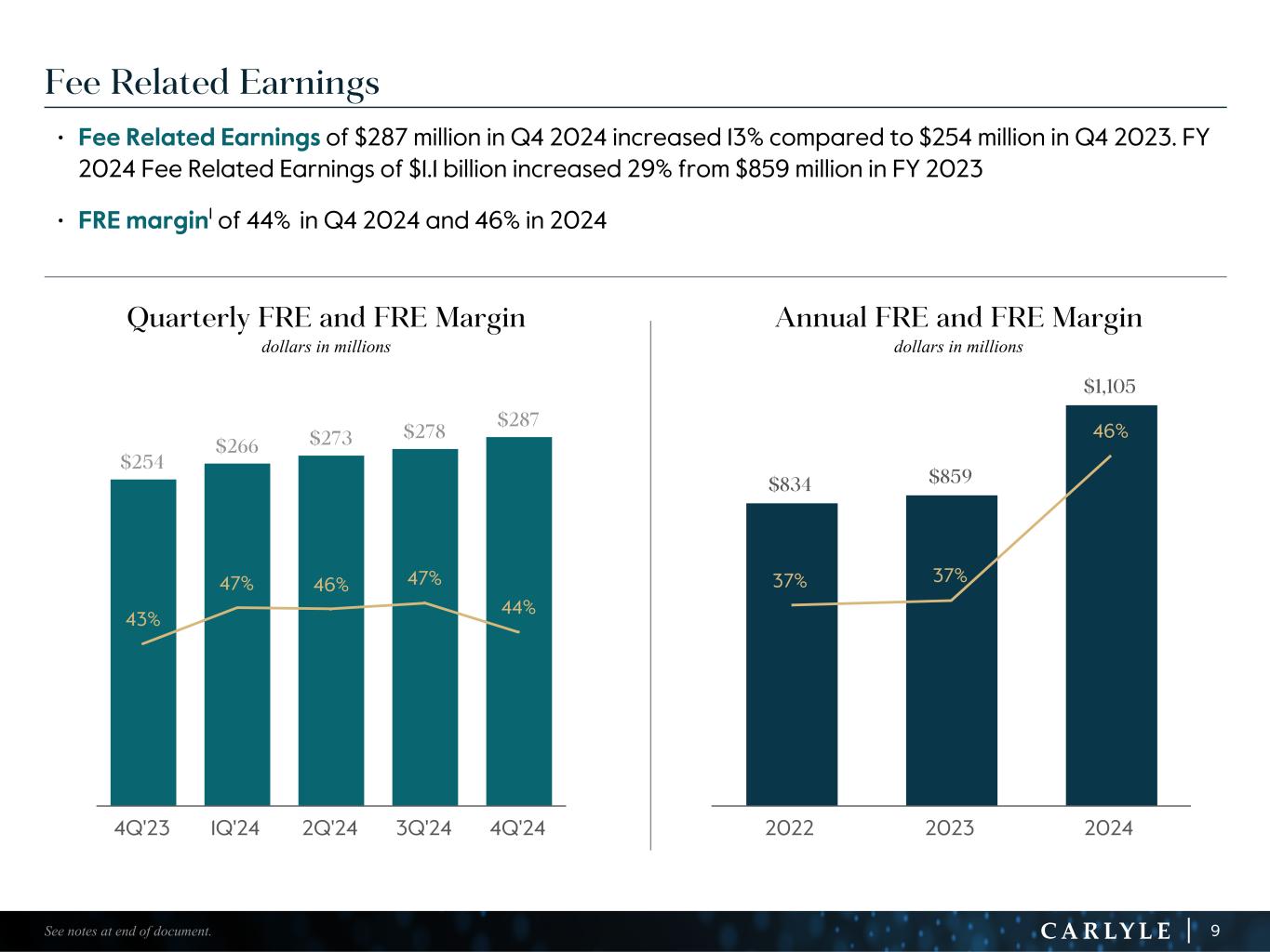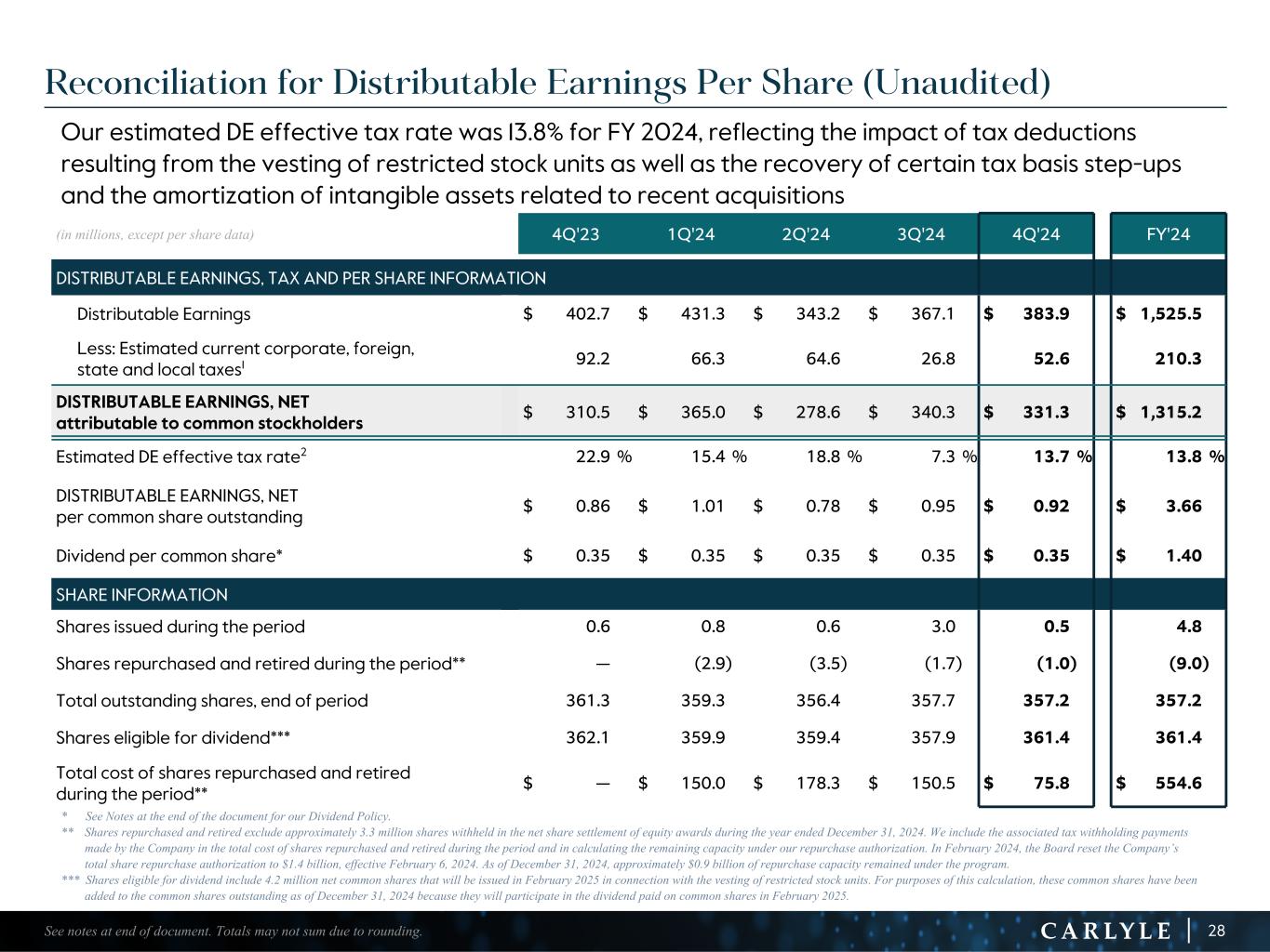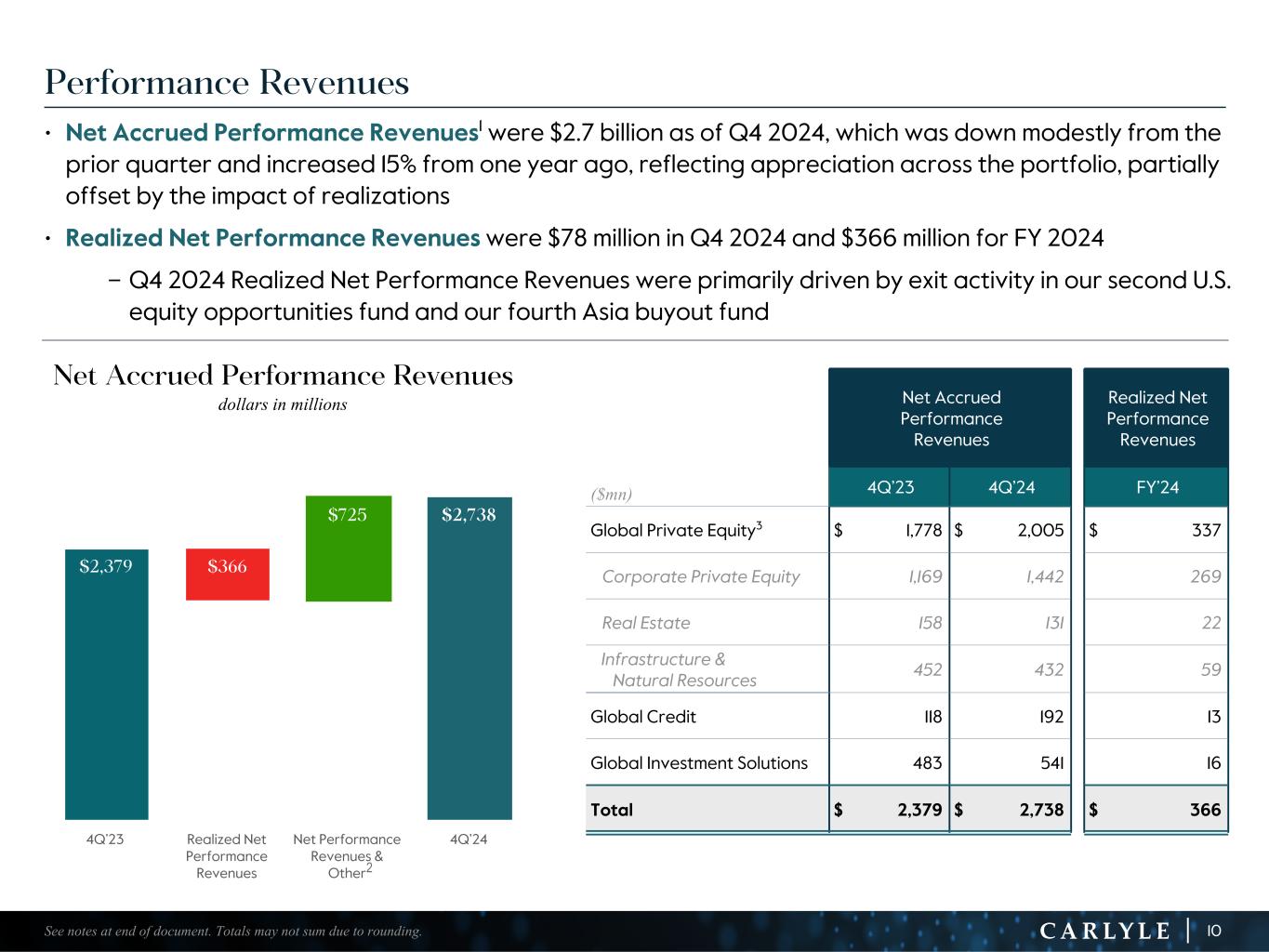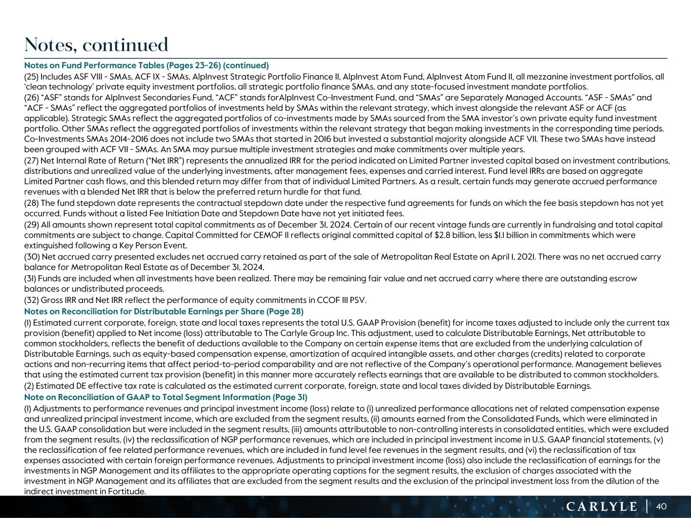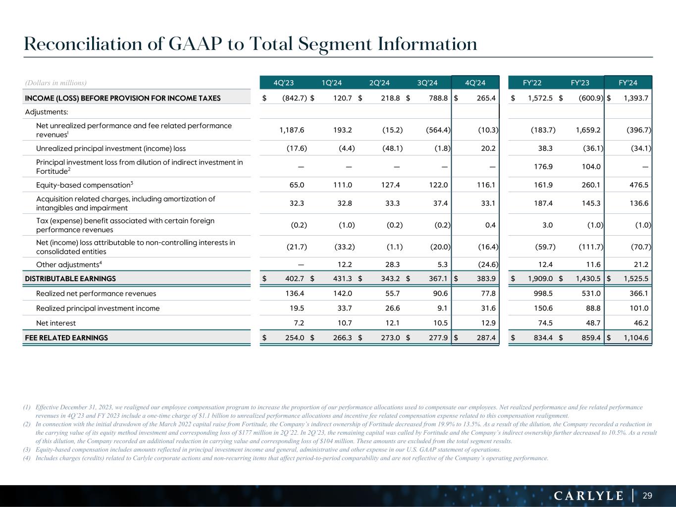 R-14 7 G-19 5 B-19 7 R-88 G-15 9 B-16 5 R-13 6 G-18 0 B-83 R-16 3 G-14 3 B-18 7 R-0 G-74 B-13 6 R-18 5 G-21 1 B-15 3 R-11 8 G-92 B-15 0 R-22 0 G-22 1 B-23 2 R-14 0 G-14 1 B-15 2R-12 0 G-16 9 B-22 2 Old Colors R-88 G-89 B-91 58595B R-23 G-234 B-234 EAEAEA R-208 G-232 B-247 D0E8F7 R-65 G-64 B-66 414042 R-8 G-51 B-94 08335E R-167 G-169 B-171 A7A9AB R-9 G-102 B-112 096670 R-220 G-221 B-222 DCDDDE R-97 G-161 B-224 61A1E0 R-237 G-217 B-157 EDD99D R-147 G-195 B-197 93C3C5 Reconciliation of GAAP to Total Segment Information (1) Effective December 31, 2023, we realigned our employee compensation program to increase the proportion of our performance allocations used to compensate our employees. Net realized performance and fee related performance revenues in 4Q’23 and FY 2023 include a one-time charge of $1.1 billion to unrealized performance allocations and incentive fee related compensation expense related to this compensation realignment. (2) In connection with the initial drawdown of the March 2022 capital raise from Fortitude, the Company’s indirect ownership of Fortitude decreased from 19.9% to 13.5%. As a result of the dilution, the Company recorded a reduction in the carrying value of its equity method investment and corresponding loss of $177 million in 2Q’22. In 2Q’23, the remaining capital was called by Fortitude and the Company’s indirect ownership further decreased to 10.5%. As a result of this dilution, the Company recorded an additional reduction in carrying value and corresponding loss of $104 million. These amounts are excluded from the total segment results. (3) Equity-based compensation includes amounts reflected in principal investment income and general, administrative and other expense in our U.S. GAAP statement of operations. (4) Includes charges (credits) related to Carlyle corporate actions and non-recurring items that affect period-to-period comparability and are not reflective of the Company’s operating performance. (Dollars in millions) 4Q'23 1Q'24 2Q'24 3Q'24 4Q'24 FY'22 FY'23 FY'24 INCOME (LOSS) BEFORE PROVISION FOR INCOME TAXES $ (842.7) $ 120.7 $ 218.8 $ 788.8 $ 265.4 $ 1,572.5 $ (600.9) $ 1,393.7 Adjustments: Net unrealized performance and fee related performance revenues1 1,187.6 193.2 (15.2) (564.4) (10.3) (183.7) 1,659.2 (396.7) Unrealized principal investment (income) loss (17.6) (4.4) (48.1) (1.8) 20.2 38.3 (36.1) (34.1) Principal investment loss from dilution of indirect investment in Fortitude2 — — — — — 176.9 104.0 — Equity-based compensation3 65.0 111.0 127.4 122.0 116.1 161.9 260.1 476.5 Acquisition related charges, including amortization of intangibles and impairment 32.3 32.8 33.3 37.4 33.1 187.4 145.3 136.6 Tax (expense) benefit associated with certain foreign performance revenues (0.2) (1.0) (0.2) (0.2) 0.4 3.0 (1.0) (1.0) Net (income) loss attributable to non-controlling interests in consolidated entities (21.7) (33.2) (1.1) (20.0) (16.4) (59.7) (111.7) (70.7) Other adjustments4 — 12.2 28.3 5.3 (24.6) 12.4 11.6 21.2 DISTRIBUTABLE EARNINGS $ 402.7 $ 431.3 $ 343.2 $ 367.1 $ 383.9 $ 1,909.0 $ 1,430.5 $ 1,525.5 Realized net performance revenues 136.4 142.0 55.7 90.6 77.8 998.5 531.0 366.1 Realized principal investment income 19.5 33.7 26.6 9.1 31.6 150.6 88.8 101.0 Net interest 7.2 10.7 12.1 10.5 12.9 74.5 48.7 46.2 FEE RELATED EARNINGS $ 254.0 $ 266.3 $ 273.0 $ 277.9 $ 287.4 $ 834.4 $ 859.4 $ 1,104.6 29