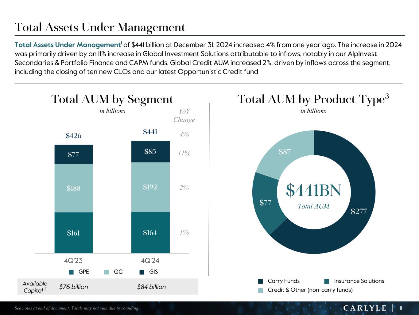 R-14 7 G-19 5 B-19 7 R-88 G-15 9 B-16 5 R-13 6 G-18 0 B-83 R-16 3 G-14 3 B-18 7 R-0 G-74 B-13 6 R-18 5 G-21 1 B-15 3 R-11 8 G-92 B-15 0 R-22 0 G-22 1 B-23 2 R-14 0 G-14 1 B-15 2R-12 0 G-16 9 B-22 2 Old Colors R-88 G-89 B-91 58595B R-23 G-234 B-234 EAEAEA R-208 G-232 B-247 D0E8F7 R-65 G-64 B-66 414042 R-8 G-51 B-94 08335E R-167 G-169 B-171 A7A9AB R-9 G-102 B-112 096670 R-220 G-221 B-222 DCDDDE R-97 G-161 B-224 61A1E0 R-237 G-217 B-157 EDD99D R-147 G-195 B-197 93C3C5 $277 $77 $87 $161 $164 $188 $192 $77 $85 $426 $441 4Q'23 4Q'24 Total Assets Under Management Total Assets Under Management1 of $441 billion at December 31, 2024 increased 4% from one year ago. The increase in 2024 was primarily driven by an 11% increase in Global Investment Solutions attributable to inflows, notably in our AlpInvest Secondaries & Portfolio Finance and CAPM funds. Global Credit AUM increased 2%, driven by inflows across the segment, including the closing of ten new CLOs and our latest Opportunistic Credit fund $441BN Total AUM 11See notes at end of document. Totals may not sum due to rounding. n Carry Funds n Insurance Solutions n Credit & Other (non-carry funds) Total AUM by Segment in billions Total AUM by Product Type3 in billions Available Capital 2 $76 billion $84 billion n GPE n GC n GIS YoY Change 4% 11% 2% 1%