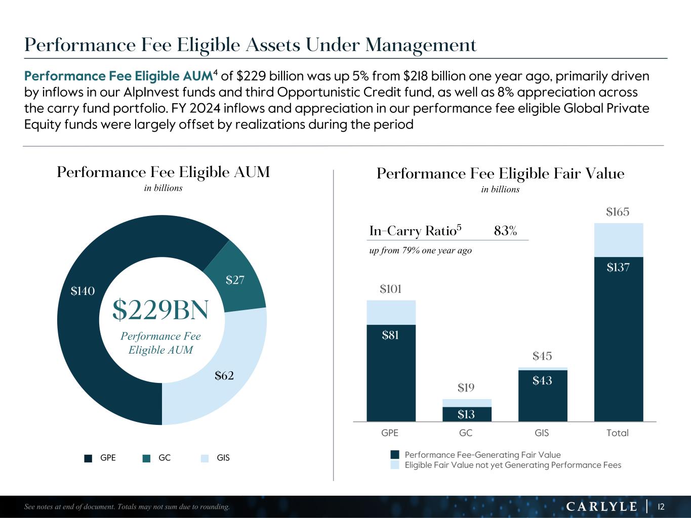 R-14 7 G-19 5 B-19 7 R-88 G-15 9 B-16 5 R-13 6 G-18 0 B-83 R-16 3 G-14 3 B-18 7 R-0 G-74 B-13 6 R-18 5 G-21 1 B-15 3 R-11 8 G-92 B-15 0 R-22 0 G-22 1 B-23 2 R-14 0 G-14 1 B-15 2R-12 0 G-16 9 B-22 2 Old Colors R-88 G-89 B-91 58595B R-23 G-234 B-234 EAEAEA R-208 G-232 B-247 D0E8F7 R-65 G-64 B-66 414042 R-8 G-51 B-94 08335E R-167 G-169 B-171 A7A9AB R-9 G-102 B-112 096670 R-220 G-221 B-222 DCDDDE R-97 G-161 B-224 61A1E0 R-237 G-217 B-157 EDD99D R-147 G-195 B-197 93C3C5 $101 $19 $45 $165 $81 $13 $43 $137 Performance Fee-Generating Fair Value Eligible Fair Value not yet Generating Performance Fees GPE GC GIS Total Performance Fee Eligible Assets Under Management Performance Fee Eligible AUM4 of $229 billion was up 5% from $218 billion one year ago, primarily driven by inflows in our AlpInvest funds and third Opportunistic Credit fund, as well as 8% appreciation across the carry fund portfolio. FY 2024 inflows and appreciation in our performance fee eligible Global Private Equity funds were largely offset by realizations during the period $140 $27 $62 $229BN Performance Fee Eligible AUM 12See notes at end of document. Totals may not sum due to rounding. Performance Fee Eligible Fair Value in billions Performance Fee Eligible AUM in billions In-Carry Ratio5 83% up from 79% one year ago n GPE n GC n GIS