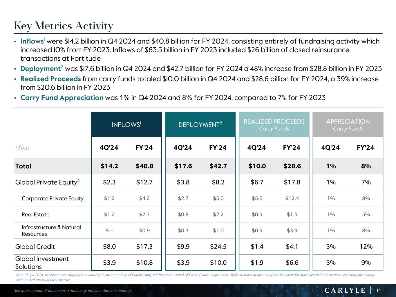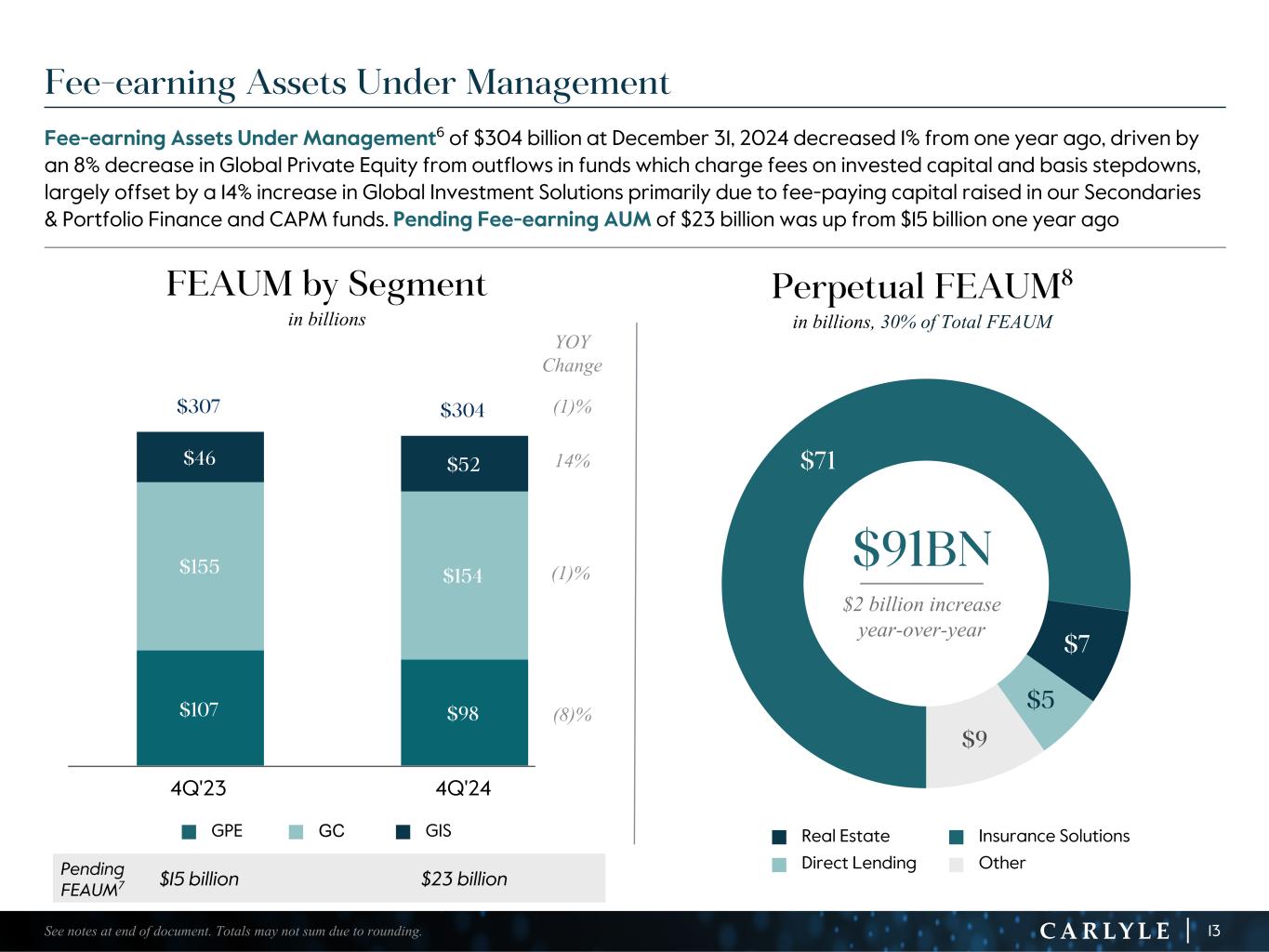 R-14 7 G-19 5 B-19 7 R-88 G-15 9 B-16 5 R-13 6 G-18 0 B-83 R-16 3 G-14 3 B-18 7 R-0 G-74 B-13 6 R-18 5 G-21 1 B-15 3 R-11 8 G-92 B-15 0 R-22 0 G-22 1 B-23 2 R-14 0 G-14 1 B-15 2R-12 0 G-16 9 B-22 2 Old Colors R-88 G-89 B-91 58595B R-23 G-234 B-234 EAEAEA R-208 G-232 B-247 D0E8F7 R-65 G-64 B-66 414042 R-8 G-51 B-94 08335E R-167 G-169 B-171 A7A9AB R-9 G-102 B-112 096670 R-220 G-221 B-222 DCDDDE R-97 G-161 B-224 61A1E0 R-237 G-217 B-157 EDD99D R-147 G-195 B-197 93C3C5 $71 $7 $5 $9 $107 $98 $155 $154 $46 $52 $307 $304 4Q'23 4Q'24 Fee-earning Assets Under Management Fee-earning Assets Under Management6 of $304 billion at December 31, 2024 decreased 1% from one year ago, driven by an 8% decrease in Global Private Equity from outflows in funds which charge fees on invested capital and basis stepdowns, largely offset by a 14% increase in Global Investment Solutions primarily due to fee-paying capital raised in our Secondaries & Portfolio Finance and CAPM funds. Pending Fee-earning AUM of $23 billion was up from $15 billion one year ago 13See notes at end of document. Totals may not sum due to rounding. Pending FEAUM7 $15 billion $23 billion FEAUM by Segment in billions Perpetual FEAUM8 in billions, 30% of Total FEAUM n Real Estate n Insurance Solutions n Direct Lending n Other YOY Change (1)% 14% (1)% (8)% $2 billion increase year-over-year $91BN n GPE n GC n GIS