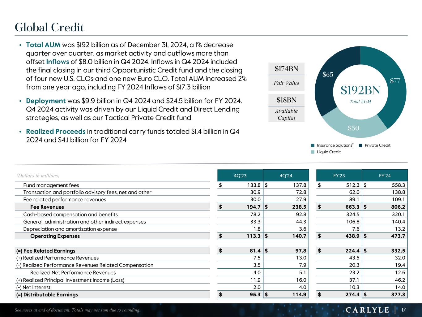 R-14 7 G-19 5 B-19 7 R-88 G-15 9 B-16 5 R-13 6 G-18 0 B-83 R-16 3 G-14 3 B-18 7 R-0 G-74 B-13 6 R-18 5 G-21 1 B-15 3 R-11 8 G-92 B-15 0 R-22 0 G-22 1 B-23 2 R-14 0 G-14 1 B-15 2R-12 0 G-16 9 B-22 2 Old Colors R-88 G-89 B-91 58595B R-23 G-234 B-234 EAEAEA R-208 G-232 B-247 D0E8F7 R-65 G-64 B-66 414042 R-8 G-51 B-94 08335E R-167 G-169 B-171 A7A9AB R-9 G-102 B-112 096670 R-220 G-221 B-222 DCDDDE R-97 G-161 B-224 61A1E0 R-237 G-217 B-157 EDD99D R-147 G-195 B-197 93C3C5 Global Private Equity • Total AUM was $164 billion as of December 31, 2024, down 3% from the prior quarter as realizations in Q4 2024 more than offset Inflows of $2.3 billion. Inflows in Q4 2024 included additional commitments raised in our tenth U.S. real estate fund. Total AUM increased 1% from the prior year, including FY 2024 inflows of $12.7 billion • Deployment was $3.8 billion in Q4 2024 and $8.2 billion for FY 2024. Q4 2024 activity was driven by our U.S. buyout and U.S. real estate funds • Realized Proceeds totaled $6.7 billion in Q4 2024 and $17.8 billion for FY 2024. Q4 2024 activity was driven by realizations in our U.S. buyout and U.S. equity opportunities funds $105 $34 $24 $164BN Total AUM (Dollars in millions) 4Q'23 4Q'24 FY'23 FY'24 Fund management fees $ 322.6 $ 303.6 $ 1,309.8 $ 1,212.0 Transaction and portfolio advisory fees, net and other 3.7 7.8 18.4 24.6 Fee related performance revenues 5.2 — 68.3 6.9 Fee Revenues $ 331.5 $ 311.4 $ 1,396.5 $ 1,243.5 Cash-based compensation and benefits 119.2 108.5 583.8 422.8 General, administration and other indirect expenses 59.7 57.9 221.9 195.2 Depreciation and amortization expense 6.3 7.2 26.0 26.8 Operating Expenses $ 185.2 $ 173.6 $ 831.7 $ 644.8 (=) Fee Related Earnings $ 146.3 $ 137.8 $ 564.8 $ 598.7 (+) Realized Performance Revenues 227.8 198.5 805.1 927.2 (-) Realized Performance Revenues Related Compensation 99.0 132.9 308.1 590.1 Realized Net Performance Revenues 128.8 65.6 497.0 337.1 (+) Realized Principal Investment Income (Loss) 5.8 14.0 45.3 49.7 (-) Net Interest 4.8 7.8 35.3 28.2 (=) Distributable Earnings $ 276.1 $ 209.6 $ 1,071.8 $ 957.3 16See notes at end of document. Totals may not sum due to rounding. $123BN Fair Value $41BN Available Capital 7% Publicly Traded 49% Aged 4+ Years1 n Corporate Private Equity n Infrastructure & Natural Resourcesn Real Estate