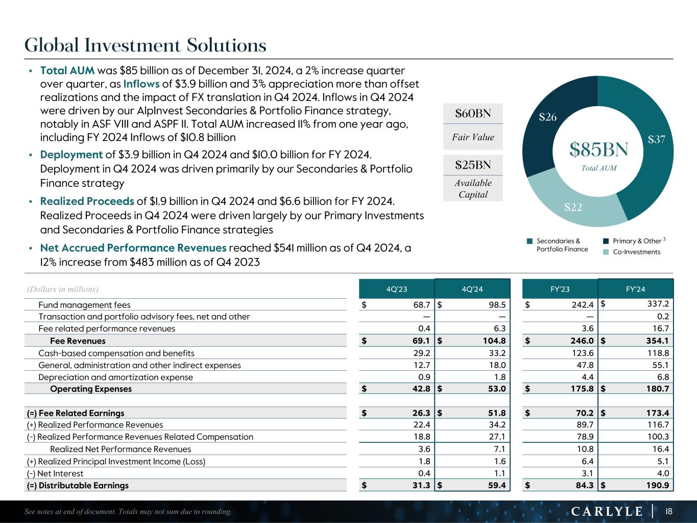 R-14 7 G-19 5 B-19 7 R-88 G-15 9 B-16 5 R-13 6 G-18 0 B-83 R-16 3 G-14 3 B-18 7 R-0 G-74 B-13 6 R-18 5 G-21 1 B-15 3 R-11 8 G-92 B-15 0 R-22 0 G-22 1 B-23 2 R-14 0 G-14 1 B-15 2R-12 0 G-16 9 B-22 2 Old Colors R-88 G-89 B-91 58595B R-23 G-234 B-234 EAEAEA R-208 G-232 B-247 D0E8F7 R-65 G-64 B-66 414042 R-8 G-51 B-94 08335E R-167 G-169 B-171 A7A9AB R-9 G-102 B-112 096670 R-220 G-221 B-222 DCDDDE R-97 G-161 B-224 61A1E0 R-237 G-217 B-157 EDD99D R-147 G-195 B-197 93C3C5 Global Investment Solutions • Total AUM was $85 billion as of December 31, 2024, a 2% increase quarter over quarter, as Inflows of $3.9 billion and 3% appreciation more than offset realizations and the impact of FX translation in Q4 2024. Inflows in Q4 2024 were driven by our AlpInvest Secondaries & Portfolio Finance strategy, notably in ASF VIII and ASPF II. Total AUM increased 11% from one year ago, including FY 2024 Inflows of $10.8 billion • Deployment of $3.9 billion in Q4 2024 and $10.0 billion for FY 2024. Deployment in Q4 2024 was driven primarily by our Secondaries & Portfolio Finance strategy • Realized Proceeds of $1.9 billion in Q4 2024 and $6.6 billion for FY 2024. Realized Proceeds in Q4 2024 were driven largely by our Primary Investments and Secondaries & Portfolio Finance strategies • Net Accrued Performance Revenues reached $541 million as of Q4 2024, a 12% increase from $483 million as of Q4 2023 (Dollars in millions) 4Q'23 4Q'24 FY'23 FY'24 Fund management fees $ 68.7 $ 98.5 $ 242.4 $ 337.2 Transaction and portfolio advisory fees, net and other — — — 0.2 Fee related performance revenues 0.4 6.3 3.6 16.7 Fee Revenues $ 69.1 $ 104.8 $ 246.0 $ 354.1 Cash-based compensation and benefits 29.2 33.2 123.6 118.8 General, administration and other indirect expenses 12.7 18.0 47.8 55.1 Depreciation and amortization expense 0.9 1.8 4.4 6.8 Operating Expenses $ 42.8 $ 53.0 $ 175.8 $ 180.7 (=) Fee Related Earnings $ 26.3 $ 51.8 $ 70.2 $ 173.4 (+) Realized Performance Revenues 22.4 34.2 89.7 116.7 (-) Realized Performance Revenues Related Compensation 18.8 27.1 78.9 100.3 Realized Net Performance Revenues 3.6 7.1 10.8 16.4 (+) Realized Principal Investment Income (Loss) 1.8 1.6 6.4 5.1 (-) Net Interest 0.4 1.1 3.1 4.0 (=) Distributable Earnings $ 31.3 $ 59.4 $ 84.3 $ 190.9 $37 $22 $26 $85BN Total AUM 18See notes at end of document. Totals may not sum due to rounding. $60BN Fair Value $25BN Available Capital n Secondaries & Portfolio Finance n Primary & Other 3 n Co-Investments