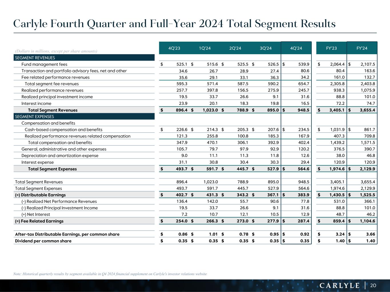 R-14 7 G-19 5 B-19 7 R-88 G-15 9 B-16 5 R-13 6 G-18 0 B-83 R-16 3 G-14 3 B-18 7 R-0 G-74 B-13 6 R-18 5 G-21 1 B-15 3 R-11 8 G-92 B-15 0 R-22 0 G-22 1 B-23 2 R-14 0 G-14 1 B-15 2R-12 0 G-16 9 B-22 2 Old Colors R-88 G-89 B-91 58595B R-23 G-234 B-234 EAEAEA R-208 G-232 B-247 D0E8F7 R-65 G-64 B-66 414042 R-8 G-51 B-94 08335E R-167 G-169 B-171 A7A9AB R-9 G-102 B-112 096670 R-220 G-221 B-222 DCDDDE R-97 G-161 B-224 61A1E0 R-237 G-217 B-157 EDD99D R-147 G-195 B-197 93C3C5 (Dollars in millions, except per share amounts) 4Q'23 1Q'24 2Q'24 3Q'24 4Q'24 FY'23 FY'24 SEGMENT REVENUES Fund management fees $ 525.1 $ 515.6 $ 525.5 $ 526.5 $ 539.9 $ 2,064.4 $ 2,107.5 Transaction and portfolio advisory fees, net and other 34.6 26.7 28.9 27.4 80.6 80.4 163.6 Fee related performance revenues 35.6 29.1 33.1 36.3 34.2 161.0 132.7 Total segment fee revenues 595.3 571.4 587.5 590.2 654.7 2,305.8 2,403.8 Realized performance revenues 257.7 397.8 156.5 275.9 245.7 938.3 1,075.9 Realized principal investment income 19.5 33.7 26.6 9.1 31.6 88.8 101.0 Interest income 23.9 20.1 18.3 19.8 16.5 72.2 74.7 Total Segment Revenues $ 896.4 $ 1,023.0 $ 788.9 $ 895.0 $ 948.5 $ 3,405.1 $ 3,655.4 SEGMENT EXPENSES Compensation and benefits Cash-based compensation and benefits $ 226.6 $ 214.3 $ 205.3 $ 207.6 $ 234.5 $ 1,031.9 $ 861.7 Realized performance revenues related compensation 121.3 255.8 100.8 185.3 167.9 407.3 709.8 Total compensation and benefits 347.9 470.1 306.1 392.9 402.4 1,439.2 1,571.5 General, administrative and other expenses 105.7 79.7 97.9 92.9 120.2 376.5 390.7 Depreciation and amortization expense 9.0 11.1 11.3 11.8 12.6 38.0 46.8 Interest expense 31.1 30.8 30.4 30.3 29.4 120.9 120.9 Total Segment Expenses $ 493.7 $ 591.7 $ 445.7 $ 527.9 $ 564.6 $ 1,974.6 $ 2,129.9 Total Segment Revenues 896.4 1,023.0 788.9 895.0 948.5 3,405.1 3,655.4 Total Segment Expenses 493.7 591.7 445.7 527.9 564.6 1,974.6 2,129.9 (=) Distributable Earnings $ 402.7 $ 431.3 $ 343.2 $ 367.1 $ 383.9 $ 1,430.5 $ 1,525.5 (-) Realized Net Performance Revenues 136.4 142.0 55.7 90.6 77.8 531.0 366.1 (-) Realized Principal Investment Income 19.5 33.7 26.6 9.1 31.6 88.8 101.0 (+) Net Interest 7.2 10.7 12.1 10.5 12.9 48.7 46.2 (=) Fee Related Earnings $ 254.0 $ 266.3 $ 273.0 $ 277.9 $ 287.4 $ 859.4 $ 1,104.6 After-tax Distributable Earnings, per common share $ 0.86 $ 1.01 $ 0.78 $ 0.95 $ 0.92 $ 3.24 $ 3.66 Dividend per common share $ 0.35 $ 0.35 $ 0.35 $ 0.35 $ 0.35 $ 1.40 $ 1.40 Note: Historical quarterly results by segment available in Q4 2024 financial supplement on Carlyle's investor relations website Carlyle Fourth Quarter and Full-Year 2024 Total Segment Results 20