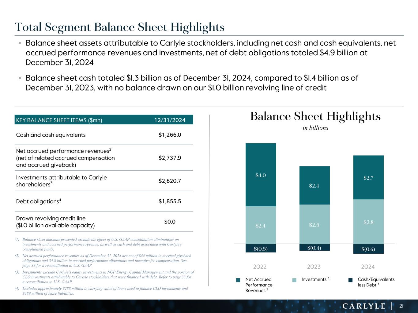 R-14 7 G-19 5 B-19 7 R-88 G-15 9 B-16 5 R-13 6 G-18 0 B-83 R-16 3 G-14 3 B-18 7 R-0 G-74 B-13 6 R-18 5 G-21 1 B-15 3 R-11 8 G-92 B-15 0 R-22 0 G-22 1 B-23 2 R-14 0 G-14 1 B-15 2R-12 0 G-16 9 B-22 2 Old Colors R-88 G-89 B-91 58595B R-23 G-234 B-234 EAEAEA R-208 G-232 B-247 D0E8F7 R-65 G-64 B-66 414042 R-8 G-51 B-94 08335E R-167 G-169 B-171 A7A9AB R-9 G-102 B-112 096670 R-220 G-221 B-222 DCDDDE R-97 G-161 B-224 61A1E0 R-237 G-217 B-157 EDD99D R-147 G-195 B-197 93C3C5 Total Segment Balance Sheet Highlights • Balance sheet assets attributable to Carlyle stockholders, including net cash and cash equivalents, net accrued performance revenues and investments, net of debt obligations totaled $4.9 billion at December 31, 2024 • Balance sheet cash totaled $1.3 billion as of December 31, 2024, compared to $1.4 billion as of December 31, 2023, with no balance drawn on our $1.0 billion revolving line of credit KEY BALANCE SHEET ITEMS1 ($mn) 12/31/2024 Cash and cash equivalents $1,266.0 Net accrued performance revenues2 (net of related accrued compensation and accrued giveback) $2,737.9 Investments attributable to Carlyle shareholders3 $2,820.7 Debt obligations4 $1,855.5 Drawn revolving credit line ($1.0 billion available capacity) $0.0 (1) Balance sheet amounts presented exclude the effect of U.S. GAAP consolidation eliminations on investments and accrued performance revenue, as well as cash and debt associated with Carlyle's consolidated funds. (2) Net accrued performance revenues as of December 31, 2024 are net of $44 million in accrued giveback obligations and $4.8 billion in accrued performance allocations and incentive fee compensation. See page 33 for a reconciliation to U.S. GAAP. (3) Investments exclude Carlyle’s equity investments in NGP Energy Capital Management and the portion of CLO investments attributable to Carlyle stockholders that were financed with debt. Refer to page 33 for a reconciliation to U.S. GAAP. (4) Excludes approximately $288 million in carrying value of loans used to finance CLO investments and $489 million of lease liabilities. $(0.5) $(0.4) $(0.6) $2.4 $2.5 $2.8 $4.0 $2.4 $2.7 2022 2023 2024 21 Balance Sheet Highlights in billions n Net Accrued Performance Revenues 2 n Investments 3 n Cash/Equivalents less Debt 4