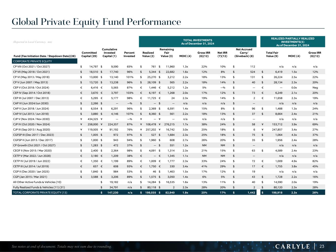 R-14 7 G-19 5 B-19 7 R-88 G-15 9 B-16 5 R-13 6 G-18 0 B-83 R-16 3 G-14 3 B-18 7 R-0 G-74 B-13 6 R-18 5 G-21 1 B-15 3 R-11 8 G-92 B-15 0 R-22 0 G-22 1 B-23 2 R-14 0 G-14 1 B-15 2R-12 0 G-16 9 B-22 2 Old Colors R-88 G-89 B-91 58595B R-23 G-234 B-234 EAEAEA R-208 G-232 B-247 D0E8F7 R-65 G-64 B-66 414042 R-8 G-51 B-94 08335E R-167 G-169 B-171 A7A9AB R-9 G-102 B-112 096670 R-220 G-221 B-222 DCDDDE R-97 G-161 B-224 61A1E0 R-237 G-217 B-157 EDD99D R-147 G-195 B-197 93C3C5 Global Private Equity Fund Performance (Reported in Local Currency, mn) TOTAL INVESTMENTS As of December 31, 2024 REALIZED/PARTIALLY REALIZED INVESTMENTS(5) As of December 31, 2024 Fund (Fee Initiation Date / Stepdown Date)(28) Committed Capital (29) Cumulative Invested Capital (1) Percent Invested Realized Value (2) Remaining Fair Value (3) MOIC (4) Gross IRR (6)(12) Net IRR (7)(12) Net Accrued Carry/ (Giveback) (8) Total Fair Value (9) MOIC (4) Gross IRR (6)(12) CORPORATE PRIVATE EQUITY CP VIII (Oct 2021 / Oct 2027) $ 14,797 $ 9,590 65% $ 761 $ 11,960 1.3x 22% 10% $ 112 n/a n/a n/a CP VII (May 2018 / Oct 2021) $ 18,510 $ 17,740 96% $ 5,344 $ 22,682 1.6x 12% 8% $ 524 $ 6,419 1.5x 12% CP VI (May 2013 / May 2018) $ 13,000 $ 13,140 101% $ 25,270 $ 3,212 2.2x 18% 13% $ 131 $ 26,224 2.5x 22% CP V (Jun 2007 / May 2013) $ 13,720 $ 13,238 96% $ 28,109 $ 565 2.2x 18% 14% $ 40 $ 28,134 2.3x 20% CEP V (Oct 2018 / Oct 2024) € 6,416 € 5,565 87% € 1,446 € 5,212 1.2x 5% —% $ — € — 0.0x Neg CEP IV (Sep 2014 / Oct 2018) € 3,670 € 3,797 103% € 6,197 € 1,268 2.0x 17% 12% $ 73 € 6,249 2.1x 20% CEP III (Jul 2007 / Dec 2013) € 5,295 € 5,177 98% € 11,725 € 24 2.3x 19% 14% $ 2 € 11,658 2.3x 19% CAP VI (Jun 2024/Jun 2030) $ 2,266 $ — —% $ — $ — n/a n/a n/a $ — n/a n/a n/a CAP V (Jun 2018 / Jun 2024) $ 6,554 $ 6,291 96% $ 2,369 $ 6,591 1.4x 15% 8% $ 96 $ 1,488 1.3x 24% CAP IV (Jul 2013 / Jun 2018) $ 3,880 $ 4,146 107% $ 8,360 $ 561 2.2x 18% 13% $ 37 $ 8,664 2.4x 21% CJP V (Nov 2024 / Nov 2030) ¥ 434,325 ¥ — —% ¥ — ¥ — n/a n/a n/a $ — n/a n/a n/a CJP IV (Oct 2020 / Nov 2024) ¥ 258,000 ¥ 224,357 87% ¥ 108,478 ¥ 276,215 1.7x 38% 24% $ 58 ¥ 153,712 3.9x 69% CJP III (Sep 2013 / Aug 2020) ¥ 119,505 ¥ 91,192 76% ¥ 257,202 ¥ 16,742 3.0x 25% 18% $ 6 ¥ 247,857 3.4x 27% CGFSP III (Dec 2017 / Dec 2023) $ 1,005 $ 972 97% $ 527 $ 1,684 2.3x 25% 18% $ 75 $ 1,064 4.3x 37% CGFSP II (Jun 2013 / Dec 2017) $ 1,000 $ 943 94% $ 1,960 $ 608 2.7x 26% 20% $ 35 $ 1,956 2.4x 28% CP Growth (Oct 2021 / Oct 2027) $ 1,283 $ 472 37% $ — $ 551 1.2x NM NM $ — n/a n/a n/a CEOF II (Nov 2015 / Mar 2020) $ 2,400 $ 2,364 98% $ 4,091 $ 1,314 2.3x 21% 15% $ 63 $ 4,589 2.4x 23% CETP V (Mar 2022 / Jun 2028) € 3,180 € 1,209 38% € — € 1,345 1.1x NM NM $ — n/a n/a n/a CETP IV (Jul 2019 / Jun 2022) € 1,350 € 1,199 89% € 1,009 € 1,777 2.3x 33% 24% $ 72 € 1,009 4.9x 82% CETP III (Jul 2014 / Jul 2019) € 657 € 608 93% € 1,750 € 330 3.4x 41% 29% $ 17 € 1,755 3.8x 45% CGP II (Dec 2020 / Jan 2025) $ 1,840 $ 984 53% $ 46 $ 1,463 1.5x 17% 12% $ 19 n/a n/a n/a CGP (Jan 2015 / Mar 2021) $ 3,588 $ 3,206 89% $ 1,575 $ 3,050 1.4x 6% 5% $ 43 $ 1,728 2.2x 16% All Other Active Funds & Vehicles (10) $ 19,182 n/a $ 14,284 $ 16,535 1.6x 13% 11% $ 40 $ 14,590 2.0x 19% Fully Realized Funds & Vehicles (11) (31) $ 34,791 n/a $ 80,118 $ 2 2.3x 28% 20% $ 2 $ 80,120 2.3x 28% TOTAL CORPORATE PRIVATE EQUITY (13) $ 147,230 n/a $ 198,035 $ 82,940 1.9x 25% 17% $ 1,442 $ 198,918 2.3x 26% 23See notes at end of document. Totals may not sum due to rounding.