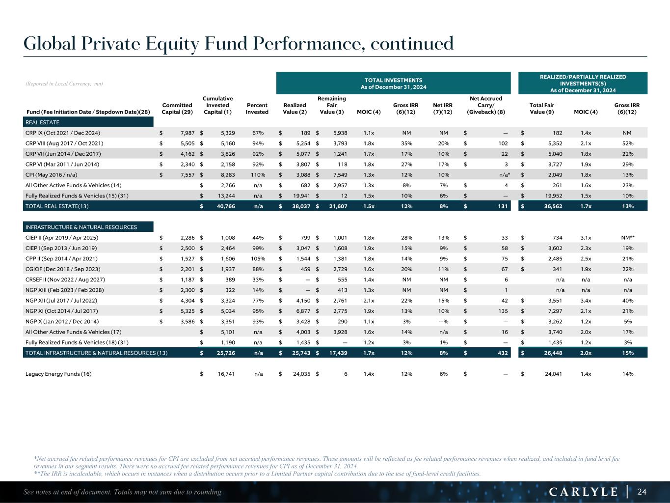 R-14 7 G-19 5 B-19 7 R-88 G-15 9 B-16 5 R-13 6 G-18 0 B-83 R-16 3 G-14 3 B-18 7 R-0 G-74 B-13 6 R-18 5 G-21 1 B-15 3 R-11 8 G-92 B-15 0 R-22 0 G-22 1 B-23 2 R-14 0 G-14 1 B-15 2R-12 0 G-16 9 B-22 2 Old Colors R-88 G-89 B-91 58595B R-23 G-234 B-234 EAEAEA R-208 G-232 B-247 D0E8F7 R-65 G-64 B-66 414042 R-8 G-51 B-94 08335E R-167 G-169 B-171 A7A9AB R-9 G-102 B-112 096670 R-220 G-221 B-222 DCDDDE R-97 G-161 B-224 61A1E0 R-237 G-217 B-157 EDD99D R-147 G-195 B-197 93C3C5 Global Private Equity Fund Performance, continued (Reported in Local Currency, mn) TOTAL INVESTMENTS As of December 31, 2024 REALIZED/PARTIALLY REALIZED INVESTMENTS(5) As of December 31, 2024 Fund (Fee Initiation Date / Stepdown Date)(28) Committed Capital (29) Cumulative Invested Capital (1) Percent Invested Realized Value (2) Remaining Fair Value (3) MOIC (4) Gross IRR (6)(12) Net IRR (7)(12) Net Accrued Carry/ (Giveback) (8) Total Fair Value (9) MOIC (4) Gross IRR (6)(12) REAL ESTATE CRP IX (Oct 2021 / Dec 2024) $ 7,987 $ 5,329 67% $ 189 $ 5,938 1.1x NM NM $ — $ 182 1.4x NM CRP VIII (Aug 2017 / Oct 2021) $ 5,505 $ 5,160 94% $ 5,254 $ 3,793 1.8x 35% 20% $ 102 $ 5,352 2.1x 52% CRP VII (Jun 2014 / Dec 2017) $ 4,162 $ 3,826 92% $ 5,077 $ 1,241 1.7x 17% 10% $ 22 $ 5,040 1.8x 22% CRP VI (Mar 2011 / Jun 2014) $ 2,340 $ 2,158 92% $ 3,807 $ 118 1.8x 27% 17% $ 3 $ 3,727 1.9x 29% CPI (May 2016 / n/a) $ 7,557 $ 8,283 110% $ 3,088 $ 7,549 1.3x 12% 10% n/a* $ 2,049 1.8x 13% All Other Active Funds & Vehicles (14) $ 2,766 n/a $ 682 $ 2,957 1.3x 8% 7% $ 4 $ 261 1.6x 23% Fully Realized Funds & Vehicles (15) (31) $ 13,244 n/a $ 19,941 $ 12 1.5x 10% 6% $ — $ 19,952 1.5x 10% TOTAL REAL ESTATE(13) $ 40,766 n/a $ 38,037 $ 21,607 1.5x 12% 8% $ 131 $ 36,562 1.7x 13% INFRASTRUCTURE & NATURAL RESOURCES CIEP II (Apr 2019 / Apr 2025) $ 2,286 $ 1,008 44% $ 799 $ 1,001 1.8x 28% 13% $ 33 $ 734 3.1x NM** CIEP I (Sep 2013 / Jun 2019) $ 2,500 $ 2,464 99% $ 3,047 $ 1,608 1.9x 15% 9% $ 58 $ 3,602 2.3x 19% CPP II (Sep 2014 / Apr 2021) $ 1,527 $ 1,606 105% $ 1,544 $ 1,381 1.8x 14% 9% $ 75 $ 2,485 2.5x 21% CGIOF (Dec 2018 / Sep 2023) $ 2,201 $ 1,937 88% $ 459 $ 2,729 1.6x 20% 11% $ 67 $ 341 1.9x 22% CRSEF II (Nov 2022 / Aug 2027) $ 1,187 $ 389 33% $ — $ 555 1.4x NM NM $ 6 n/a n/a n/a NGP XIII (Feb 2023 / Feb 2028) $ 2,300 $ 322 14% $ — $ 413 1.3x NM NM $ 1 n/a n/a n/a NGP XII (Jul 2017 / Jul 2022) $ 4,304 $ 3,324 77% $ 4,150 $ 2,761 2.1x 22% 15% $ 42 $ 3,551 3.4x 40% NGP XI (Oct 2014 / Jul 2017) $ 5,325 $ 5,034 95% $ 6,877 $ 2,775 1.9x 13% 10% $ 135 $ 7,297 2.1x 21% NGP X (Jan 2012 / Dec 2014) $ 3,586 $ 3,351 93% $ 3,428 $ 290 1.1x 3% —% $ — $ 3,262 1.2x 5% All Other Active Funds & Vehicles (17) $ 5,101 n/a $ 4,003 $ 3,928 1.6x 14% n/a $ 16 $ 3,740 2.0x 17% Fully Realized Funds & Vehicles (18) (31) $ 1,190 n/a $ 1,435 $ — 1.2x 3% 1% $ — $ 1,435 1.2x 3% TOTAL INFRASTRUCTURE & NATURAL RESOURCES (13) $ 25,726 n/a $ 25,743 $ 17,439 1.7x 12% 8% $ 432 $ 26,448 2.0x 15% Legacy Energy Funds (16) $ 16,741 n/a $ 24,035 $ 6 1.4x 12% 6% $ — $ 24,041 1.4x 14% 24See notes at end of document. Totals may not sum due to rounding. *Net accrued fee related performance revenues for CPI are excluded from net accrued performance revenues. These amounts will be reflected as fee related performance revenues when realized, and included in fund level fee revenues in our segment results. There were no accrued fee related performance revenues for CPI as of December 31, 2024. **The IRR is incalculable, which occurs in instances when a distribution occurs prior to a Limited Partner capital contribution due to the use of fund-level credit facilities.