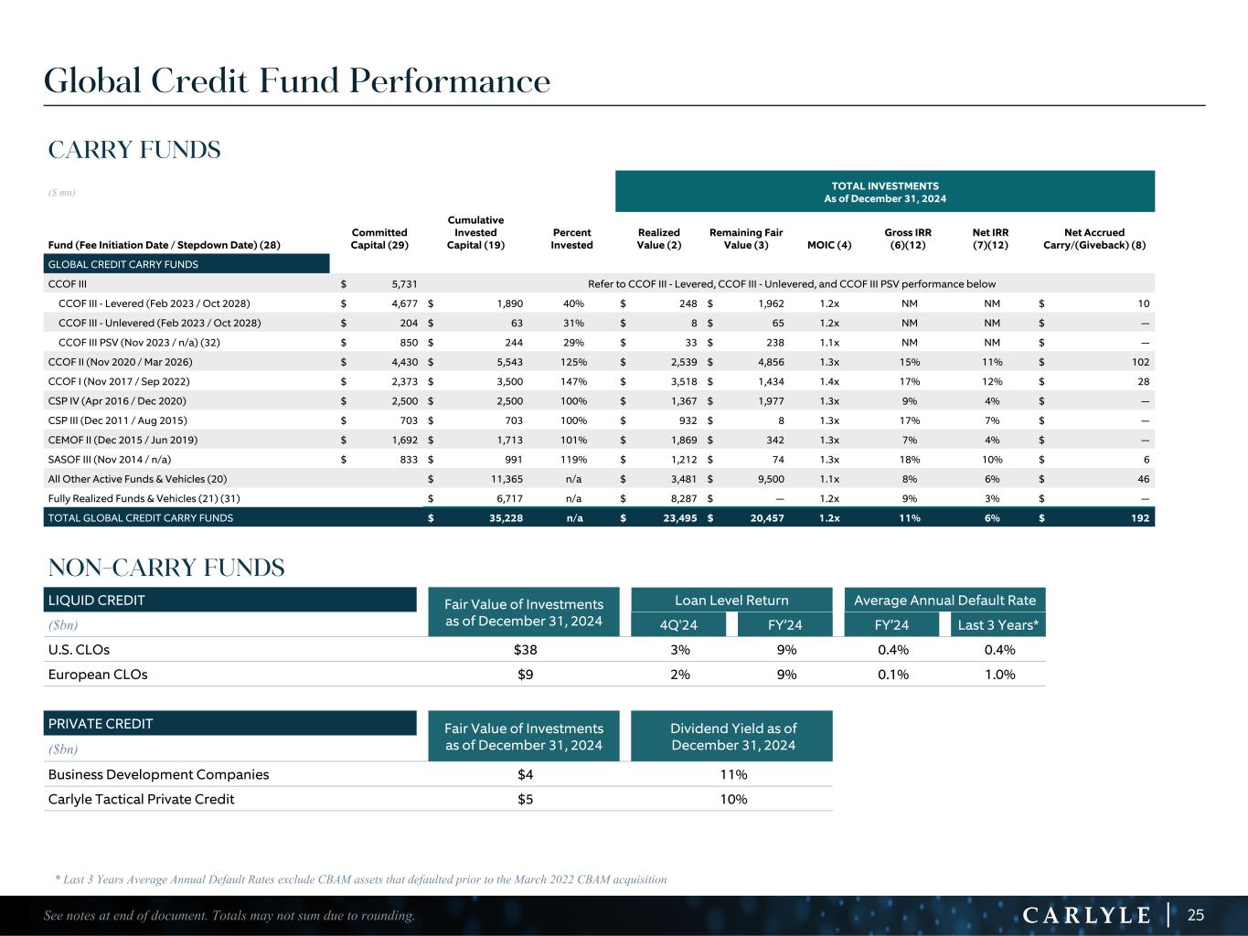 R-14 7 G-19 5 B-19 7 R-88 G-15 9 B-16 5 R-13 6 G-18 0 B-83 R-16 3 G-14 3 B-18 7 R-0 G-74 B-13 6 R-18 5 G-21 1 B-15 3 R-11 8 G-92 B-15 0 R-22 0 G-22 1 B-23 2 R-14 0 G-14 1 B-15 2R-12 0 G-16 9 B-22 2 Old Colors R-88 G-89 B-91 58595B R-23 G-234 B-234 EAEAEA R-208 G-232 B-247 D0E8F7 R-65 G-64 B-66 414042 R-8 G-51 B-94 08335E R-167 G-169 B-171 A7A9AB R-9 G-102 B-112 096670 R-220 G-221 B-222 DCDDDE R-97 G-161 B-224 61A1E0 R-237 G-217 B-157 EDD99D R-147 G-195 B-197 93C3C5 Global Credit Fund Performance 25 CARRY FUNDS ($ mn) TOTAL INVESTMENTS As of December 31, 2024 Fund (Fee Initiation Date / Stepdown Date) (28) Committed Capital (29) Cumulative Invested Capital (19) Percent Invested Realized Value (2) Remaining Fair Value (3) MOIC (4) Gross IRR (6)(12) Net IRR (7)(12) Net Accrued Carry/(Giveback) (8) GLOBAL CREDIT CARRY FUNDS CCOF III $ 5,731 Refer to CCOF III - Levered, CCOF III - Unlevered, and CCOF III PSV performance below CCOF III - Levered (Feb 2023 / Oct 2028) $ 4,677 $ 1,890 40% $ 248 $ 1,962 1.2x NM NM $ 10 CCOF III - Unlevered (Feb 2023 / Oct 2028) $ 204 $ 63 31% $ 8 $ 65 1.2x NM NM $ — CCOF III PSV (Nov 2023 / n/a) (32) $ 850 $ 244 29% $ 33 $ 238 1.1x NM NM $ — CCOF II (Nov 2020 / Mar 2026) $ 4,430 $ 5,543 125% $ 2,539 $ 4,856 1.3x 15% 11% $ 102 CCOF I (Nov 2017 / Sep 2022) $ 2,373 $ 3,500 147% $ 3,518 $ 1,434 1.4x 17% 12% $ 28 CSP IV (Apr 2016 / Dec 2020) $ 2,500 $ 2,500 100% $ 1,367 $ 1,977 1.3x 9% 4% $ — CSP III (Dec 2011 / Aug 2015) $ 703 $ 703 100% $ 932 $ 8 1.3x 17% 7% $ — CEMOF II (Dec 2015 / Jun 2019) $ 1,692 $ 1,713 101% $ 1,869 $ 342 1.3x 7% 4% $ — SASOF III (Nov 2014 / n/a) $ 833 $ 991 119% $ 1,212 $ 74 1.3x 18% 10% $ 6 All Other Active Funds & Vehicles (20) $ 11,365 n/a $ 3,481 $ 9,500 1.1x 8% 6% $ 46 Fully Realized Funds & Vehicles (21) (31) $ 6,717 n/a $ 8,287 $ — 1.2x 9% 3% $ — TOTAL GLOBAL CREDIT CARRY FUNDS $ 35,228 n/a $ 23,495 $ 20,457 1.2x 11% 6% $ 192 See notes at end of document. Totals may not sum due to rounding. NON-CARRY FUNDS LIQUID CREDIT Fair Value of Investments as of December 31, 2024 Loan Level Return Average Annual Default Rate ($bn) 4Q'24 FY’24 FY’24 Last 3 Years* U.S. CLOs $38 3% 9% 0.4% 0.4% European CLOs $9 2% 9% 0.1% 1.0% PRIVATE CREDIT Fair Value of Investments as of December 31, 2024 Dividend Yield as of December 31, 2024($bn) Business Development Companies $4 11% Carlyle Tactical Private Credit $5 10% * Last 3 Years Average Annual Default Rates exclude CBAM assets that defaulted prior to the March 2022 CBAM acquisition