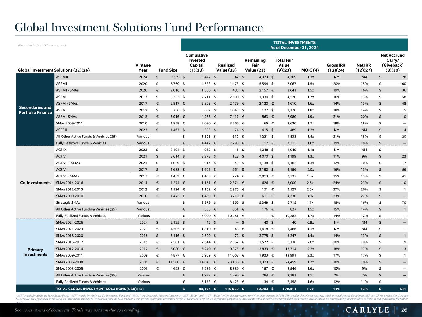 R-14 7 G-19 5 B-19 7 R-88 G-15 9 B-16 5 R-13 6 G-18 0 B-83 R-16 3 G-14 3 B-18 7 R-0 G-74 B-13 6 R-18 5 G-21 1 B-15 3 R-11 8 G-92 B-15 0 R-22 0 G-22 1 B-23 2 R-14 0 G-14 1 B-15 2R-12 0 G-16 9 B-22 2 Old Colors R-88 G-89 B-91 58595B R-23 G-234 B-234 EAEAEA R-208 G-232 B-247 D0E8F7 R-65 G-64 B-66 414042 R-8 G-51 B-94 08335E R-167 G-169 B-171 A7A9AB R-9 G-102 B-112 096670 R-220 G-221 B-222 DCDDDE R-97 G-161 B-224 61A1E0 R-237 G-217 B-157 EDD99D R-147 G-195 B-197 93C3C5 Global Investment Solutions Fund Performance (Reported in Local Currency, mn) TOTAL INVESTMENTS As of December 31, 2024 Global Investment Solutions (22)(26) Vintage Year Fund Size Cumulative Invested Capital (1)(23) Realized Value (23) Remaining Fair Value (23) Total Fair Value (9)(23) MOIC (4) Gross IRR (12)(24) Net IRR (12)(27) Net Accrued Carry/ (Giveback) (8)(30) Secondaries and Portfolio Finance ASF VIII 2024 $ 9,359 $ 3,472 $ 47 $ 4,323 $ 4,369 1.3x NM NM $ 28 ASF VII 2020 $ 6,769 $ 4,583 $ 1,473 $ 5,594 $ 7,067 1.5x 20% 15% $ 100 ASF VII - SMAs 2020 € 2,016 € 1,806 € 483 € 2,157 € 2,641 1.5x 19% 16% $ 36 ASF VI 2017 $ 3,333 $ 2,711 $ 2,590 $ 1,930 $ 4,520 1.7x 16% 13% $ 58 ASF VI - SMAs 2017 € 2,817 € 2,863 € 2,479 € 2,130 € 4,610 1.6x 14% 13% $ 48 ASF V 2012 $ 756 $ 652 $ 1,043 $ 127 $ 1,170 1.8x 18% 14% $ 5 ASF V - SMAs 2012 € 3,916 € 4,278 € 7,417 € 563 € 7,980 1.9x 21% 20% $ 10 SMAs 2009-2011 2010 € 1,859 € 2,080 € 3,566 € 65 € 3,630 1.7x 19% 18% $ — ASPF II 2023 $ 1,467 $ 393 $ 74 $ 415 $ 489 1.2x NM NM $ 4 All Other Active Funds & Vehicles (25) Various $ 1,305 $ 612 $ 1,221 $ 1,833 1.4x 21% 18% $ 20 Fully Realized Funds & Vehicles Various € 4,442 € 7,298 € 17 € 7,315 1.6x 19% 18% $ — Co-Investments ACF IX 2023 $ 3,494 $ 962 $ 1 $ 1,048 $ 1,049 1.1x NM NM $ — ACF VIII 2021 $ 3,614 $ 3,278 $ 128 $ 4,070 $ 4,199 1.3x 11% 9% $ 22 ACF VIII - SMAs 2021 $ 1,069 $ 914 $ 45 $ 1,138 $ 1,182 1.3x 12% 10% $ 7 ACF VII 2017 $ 1,688 $ 1,605 $ 964 $ 2,192 $ 3,156 2.0x 16% 13% $ 56 ACF VII - SMAs 2017 € 1,452 € 1,489 € 724 € 2,013 € 2,737 1.8x 15% 13% $ 41 SMAs 2014-2016 2014 € 1,274 € 1,151 € 2,374 € 626 € 3,000 2.6x 24% 23% $ 10 SMAs 2012-2013 2012 € 1,124 € 1,102 € 2,975 € 151 € 3,127 2.8x 27% 26% $ 1 SMAs 2009-2010 2010 € 1,475 € 1,439 € 3,719 € 611 € 4,330 3.0x 23% 22% $ — Strategic SMAs Various $ 3,979 $ 1,366 $ 5,349 $ 6,715 1.7x 18% 16% $ 70 All Other Active Funds & Vehicles (25) Various € 558 € 651 € 176 € 827 1.5x 15% 14% $ 1 Fully Realized Funds & Vehicles Various € 6,000 € 10,281 € 1 € 10,282 1.7x 14% 12% $ — Primary Investments SMAs 2024-2026 2024 $ 2,125 $ 45 $ — $ 40 $ 40 0.9x NM NM $ — SMAs 2021-2023 2021 € 4,505 € 1,310 € 48 € 1,418 € 1,466 1.1x NM NM $ — SMAs 2018-2020 2018 $ 3,116 $ 2,309 $ 472 $ 2,775 $ 3,247 1.4x 14% 13% $ 1 SMAs 2015-2017 2015 € 2,501 € 2,614 € 2,567 € 2,572 € 5,138 2.0x 20% 19% $ 9 SMAs 2012-2014 2012 € 5,080 € 6,240 € 9,875 € 3,839 € 13,714 2.2x 18% 17% $ 13 SMAs 2009-2011 2009 € 4,877 € 5,959 € 11,068 € 1,923 € 12,991 2.2x 17% 17% $ 1 SMAs 2006-2008 2005 € 11,500 € 14,043 € 23,136 € 1,323 € 24,459 1.7x 10% 10% $ — SMAs 2003-2005 2003 € 4,628 € 5,286 € 8,389 € 157 € 8,546 1.6x 10% 9% $ — All Other Active Funds & Vehicles (25) Various € 1,932 € 1,896 € 284 € 2,181 1.1x 2% 2% $ — Fully Realized Funds & Vehicles Various € 5,173 € 8,423 € 34 € 8,458 1.6x 12% 11% $ — TOTAL GLOBAL INVESTMENT SOLUTIONS (USD)(13) $ 98,404 $ 119,930 $ 50,983 $ 170,914 1.7x 14% 13% $ 541 26See notes at end of document. Totals may not sum due to rounding. “ASF” stands for AlpInvest Secondaries Fund, “ACF” stands for AlpInvest Co-Investment Fund, and “SMAs” are Separately Managed Accounts. “ASF - SMAs” and “ACF - SMAs” reflect the aggregated portfolios of investments held by SMAs within the relevant strategy, which invest alongside the relevant ASF or ACF (as applicable). Strategic SMAs reflect the aggregated portfolios of co-investments made by SMAs sourced from the SMA investor’s own private equity fund investment portfolio. Other SMAs reflect the aggregated portfolios of investments within the relevant strategy that began making investments in the corresponding time periods. See Notes at end of document for further detail.