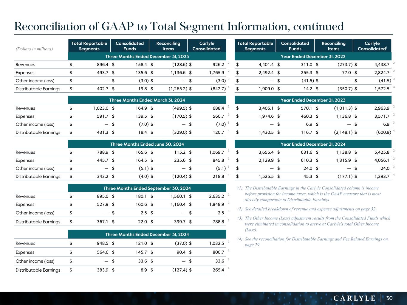 R-14 7 G-19 5 B-19 7 R-88 G-15 9 B-16 5 R-13 6 G-18 0 B-83 R-16 3 G-14 3 B-18 7 R-0 G-74 B-13 6 R-18 5 G-21 1 B-15 3 R-11 8 G-92 B-15 0 R-22 0 G-22 1 B-23 2 R-14 0 G-14 1 B-15 2R-12 0 G-16 9 B-22 2 Old Colors R-88 G-89 B-91 58595B R-23 G-234 B-234 EAEAEA R-208 G-232 B-247 D0E8F7 R-65 G-64 B-66 414042 R-8 G-51 B-94 08335E R-167 G-169 B-171 A7A9AB R-9 G-102 B-112 096670 R-220 G-221 B-222 DCDDDE R-97 G-161 B-224 61A1E0 R-237 G-217 B-157 EDD99D R-147 G-195 B-197 93C3C5 Reconciliation of GAAP to Total Segment Information, continued (Dollars in millions) Total Reportable Segments Consolidated Funds Reconciling Items Carlyle Consolidated1 Total Reportable Segments Consolidated Funds Reconciling Items Carlyle Consolidated1 Three Months Ended December 31, 2023 Year Ended December 31, 2022 Revenues $ 896.4 $ 158.4 $ (128.6) $ 926.2 2 $ 4,401.4 $ 311.0 $ (273.7) $ 4,438.7 2 Expenses $ 493.7 $ 135.6 $ 1,136.6 $ 1,765.9 2 $ 2,492.4 $ 255.3 $ 77.0 $ 2,824.7 2 Other income (loss) $ — $ (3.0) $ — $ (3.0) 3 $ — $ (41.5) $ — $ (41.5) 3 Distributable Earnings $ 402.7 $ 19.8 $ (1,265.2) $ (842.7) 4 $ 1,909.0 $ 14.2 $ (350.7) $ 1,572.5 4 Three Months Ended March 31, 2024 Year Ended December 31, 2023 Revenues $ 1,023.0 $ 164.9 $ (499.5) $ 688.4 2 $ 3,405.1 $ 570.1 $ (1,011.3) $ 2,963.9 2 Expenses $ 591.7 $ 139.5 $ (170.5) $ 560.7 2 $ 1,974.6 $ 460.3 $ 1,136.8 $ 3,571.7 2 Other income (loss) $ — $ (7.0) $ — $ (7.0) 3 $ — $ 6.9 $ — $ 6.9 3 Distributable Earnings $ 431.3 $ 18.4 $ (329.0) $ 120.7 4 $ 1,430.5 $ 116.7 $ (2,148.1) $ (600.9) 4 Three Months Ended June 30, 2024 Year Ended December 31, 2024 Revenues $ 788.9 $ 165.6 $ 115.2 $ 1,069.7 2 $ 3,655.4 $ 631.6 $ 1,138.8 $ 5,425.8 2 Expenses $ 445.7 $ 164.5 $ 235.6 $ 845.8 2 $ 2,129.9 $ 610.3 $ 1,315.9 $ 4,056.1 2 Other income (loss) $ — $ (5.1) $ — $ (5.1) 3 $ — $ 24.0 $ — $ 24.0 3 Distributable Earnings $ 343.2 $ (4.0) $ (120.4) $ 218.8 4 $ 1,525.5 $ 45.3 $ (177.1) $ 1,393.7 4 Three Months Ended September 30, 2024 Revenues $ 895.0 $ 180.1 $ 1,560.1 $ 2,635.2 2 Expenses $ 527.9 $ 160.6 $ 1,160.4 $ 1,848.9 2 Other income (loss) $ — $ 2.5 $ — $ 2.5 3 Distributable Earnings $ 367.1 $ 22.0 $ 399.7 $ 788.8 4 Three Months Ended December 31, 2024 Revenues $ 948.5 $ 121.0 $ (37.0) $ 1,032.5 2 Expenses $ 564.6 $ 145.7 $ 90.4 $ 800.7 2 Other income (loss) $ — $ 33.6 $ — $ 33.6 3 Distributable Earnings $ 383.9 $ 8.9 $ (127.4) $ 265.4 4 (1) The Distributable Earnings in the Carlyle Consolidated column is income before provision for income taxes, which is the GAAP measure that is most directly comparable to Distributable Earnings. (2) See detailed breakdown of revenue and expense adjustments on page 32. (3) The Other Income (Loss) adjustment results from the Consolidated Funds which were eliminated in consolidation to arrive at Carlyle's total Other Income (Loss). (4) See the reconciliation for Distributable Earnings and Fee Related Earnings on page 29. 30