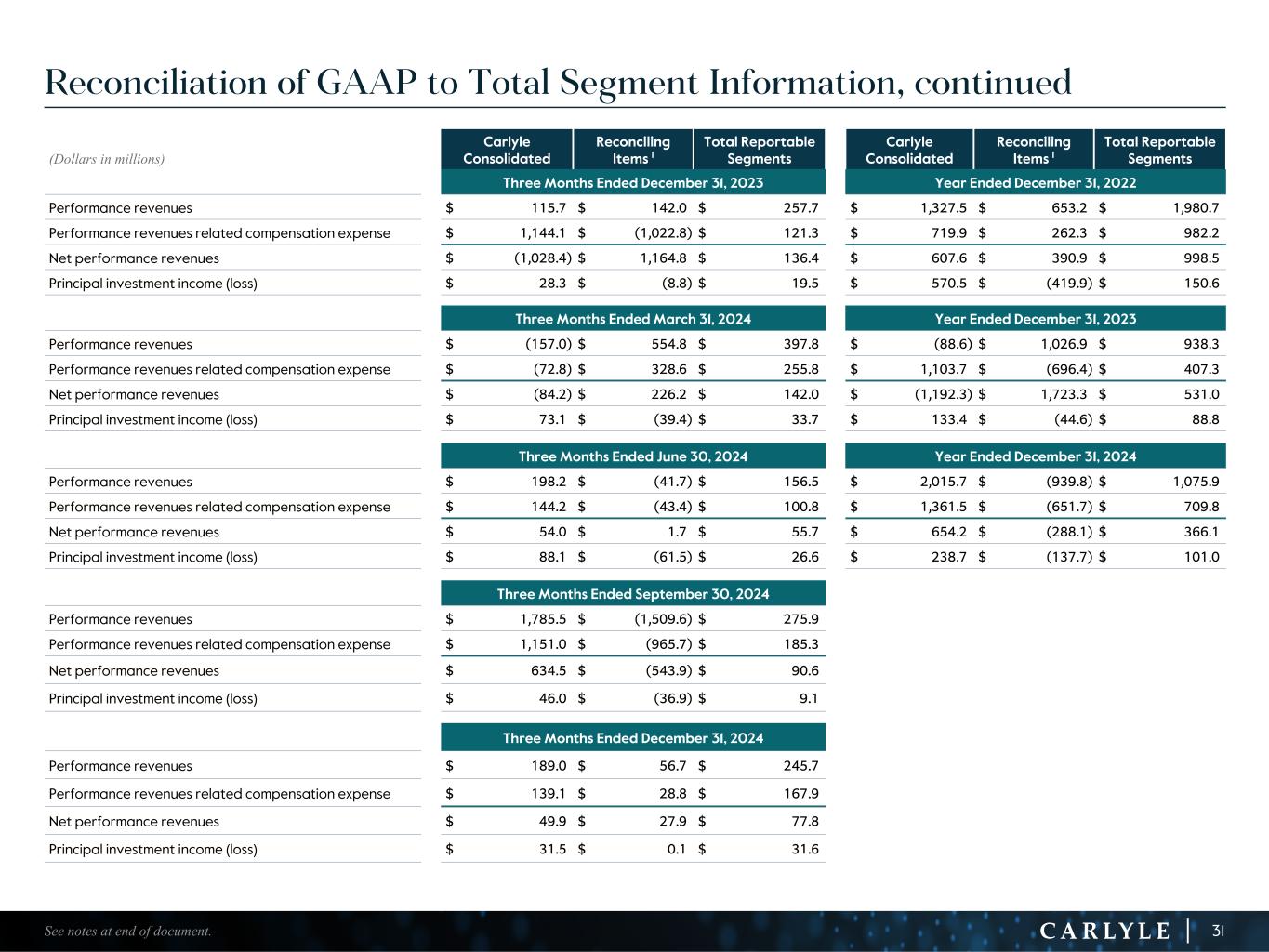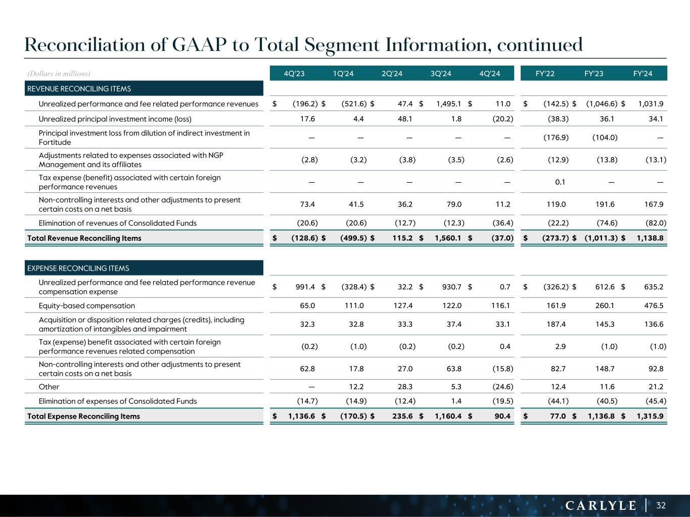 R-14 7 G-19 5 B-19 7 R-88 G-15 9 B-16 5 R-13 6 G-18 0 B-83 R-16 3 G-14 3 B-18 7 R-0 G-74 B-13 6 R-18 5 G-21 1 B-15 3 R-11 8 G-92 B-15 0 R-22 0 G-22 1 B-23 2 R-14 0 G-14 1 B-15 2R-12 0 G-16 9 B-22 2 Old Colors R-88 G-89 B-91 58595B R-23 G-234 B-234 EAEAEA R-208 G-232 B-247 D0E8F7 R-65 G-64 B-66 414042 R-8 G-51 B-94 08335E R-167 G-169 B-171 A7A9AB R-9 G-102 B-112 096670 R-220 G-221 B-222 DCDDDE R-97 G-161 B-224 61A1E0 R-237 G-217 B-157 EDD99D R-147 G-195 B-197 93C3C5 Reconciliation of GAAP to Total Segment Information, continued 31 (Dollars in millions) Carlyle Consolidated Reconciling Items 1 Total Reportable Segments Carlyle Consolidated Reconciling Items 1 Total Reportable Segments Three Months Ended December 31, 2023 Year Ended December 31, 2022 Performance revenues $ 115.7 $ 142.0 $ 257.7 $ 1,327.5 $ 653.2 $ 1,980.7 Performance revenues related compensation expense $ 1,144.1 $ (1,022.8) $ 121.3 $ 719.9 $ 262.3 $ 982.2 Net performance revenues $ (1,028.4) $ 1,164.8 $ 136.4 $ 607.6 $ 390.9 $ 998.5 Principal investment income (loss) $ 28.3 $ (8.8) $ 19.5 $ 570.5 $ (419.9) $ 150.6 Three Months Ended March 31, 2024 Year Ended December 31, 2023 Performance revenues $ (157.0) $ 554.8 $ 397.8 $ (88.6) $ 1,026.9 $ 938.3 Performance revenues related compensation expense $ (72.8) $ 328.6 $ 255.8 $ 1,103.7 $ (696.4) $ 407.3 Net performance revenues $ (84.2) $ 226.2 $ 142.0 $ (1,192.3) $ 1,723.3 $ 531.0 Principal investment income (loss) $ 73.1 $ (39.4) $ 33.7 $ 133.4 $ (44.6) $ 88.8 Three Months Ended June 30, 2024 Year Ended December 31, 2024 Performance revenues $ 198.2 $ (41.7) $ 156.5 $ 2,015.7 $ (939.8) $ 1,075.9 Performance revenues related compensation expense $ 144.2 $ (43.4) $ 100.8 $ 1,361.5 $ (651.7) $ 709.8 Net performance revenues $ 54.0 $ 1.7 $ 55.7 $ 654.2 $ (288.1) $ 366.1 Principal investment income (loss) $ 88.1 $ (61.5) $ 26.6 $ 238.7 $ (137.7) $ 101.0 Three Months Ended September 30, 2024 Performance revenues $ 1,785.5 $ (1,509.6) $ 275.9 Performance revenues related compensation expense $ 1,151.0 $ (965.7) $ 185.3 Net performance revenues $ 634.5 $ (543.9) $ 90.6 Principal investment income (loss) $ 46.0 $ (36.9) $ 9.1 Three Months Ended December 31, 2024 Performance revenues $ 189.0 $ 56.7 $ 245.7 Performance revenues related compensation expense $ 139.1 $ 28.8 $ 167.9 Net performance revenues $ 49.9 $ 27.9 $ 77.8 Principal investment income (loss) $ 31.5 $ 0.1 $ 31.6 See notes at end of document.