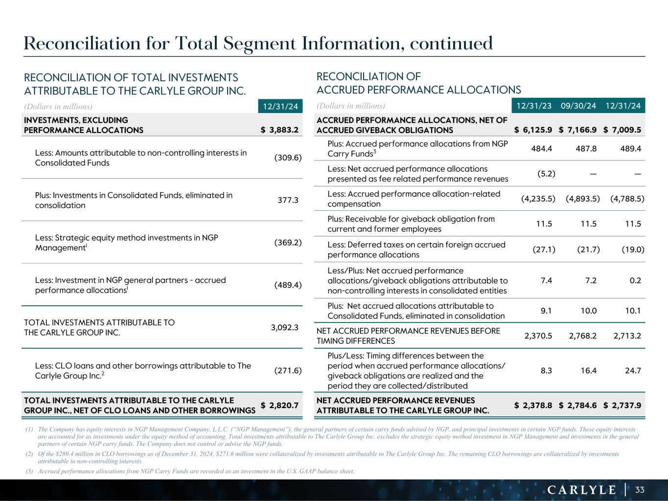 R-14 7 G-19 5 B-19 7 R-88 G-15 9 B-16 5 R-13 6 G-18 0 B-83 R-16 3 G-14 3 B-18 7 R-0 G-74 B-13 6 R-18 5 G-21 1 B-15 3 R-11 8 G-92 B-15 0 R-22 0 G-22 1 B-23 2 R-14 0 G-14 1 B-15 2R-12 0 G-16 9 B-22 2 Old Colors R-88 G-89 B-91 58595B R-23 G-234 B-234 EAEAEA R-208 G-232 B-247 D0E8F7 R-65 G-64 B-66 414042 R-8 G-51 B-94 08335E R-167 G-169 B-171 A7A9AB R-9 G-102 B-112 096670 R-220 G-221 B-222 DCDDDE R-97 G-161 B-224 61A1E0 R-237 G-217 B-157 EDD99D R-147 G-195 B-197 93C3C5 Reconciliation for Total Segment Information, continued (1) The Company has equity interests in NGP Management Company, L.L.C. (“NGP Management”), the general partners of certain carry funds advised by NGP, and principal investments in certain NGP funds. These equity interests are accounted for as investments under the equity method of accounting. Total investments attributable to The Carlyle Group Inc. excludes the strategic equity method investment in NGP Management and investments in the general partners of certain NGP carry funds. The Company does not control or advise the NGP funds. (2) Of the $289.4 million in CLO borrowings as of December 31, 2024, $271.6 million were collateralized by investments attributable to The Carlyle Group Inc. The remaining CLO borrowings are collateralized by investments attributable to non-controlling interests. (3) Accrued performance allocations from NGP Carry Funds are recorded as an investment in the U.S. GAAP balance sheet. RECONCILIATION OF TOTAL INVESTMENTS ATTRIBUTABLE TO THE CARLYLE GROUP INC. (Dollars in millions) 12/31/24 INVESTMENTS, EXCLUDING PERFORMANCE ALLOCATIONS $ 3,883.2 Less: Amounts attributable to non-controlling interests in Consolidated Funds (309.6) Plus: Investments in Consolidated Funds, eliminated in consolidation 377.3 Less: Strategic equity method investments in NGP Management1 (369.2) Less: Investment in NGP general partners - accrued performance allocations1 (489.4) TOTAL INVESTMENTS ATTRIBUTABLE TO THE CARLYLE GROUP INC. 3,092.3 Less: CLO loans and other borrowings attributable to The Carlyle Group Inc.2 (271.6) TOTAL INVESTMENTS ATTRIBUTABLE TO THE CARLYLE GROUP INC., NET OF CLO LOANS AND OTHER BORROWINGS $ 2,820.7 RECONCILIATION OF ACCRUED PERFORMANCE ALLOCATIONS (Dollars in millions) 12/31/23 09/30/24 12/31/24 ACCRUED PERFORMANCE ALLOCATIONS, NET OF ACCRUED GIVEBACK OBLIGATIONS $ 6,125.9 $ 7,166.9 $ 7,009.5 Plus: Accrued performance allocations from NGP Carry Funds3 484.4 487.8 489.4 Less: Net accrued performance allocations presented as fee related performance revenues (5.2) — — Less: Accrued performance allocation-related compensation (4,235.5) (4,893.5) (4,788.5) Plus: Receivable for giveback obligation from current and former employees 11.5 11.5 11.5 Less: Deferred taxes on certain foreign accrued performance allocations (27.1) (21.7) (19.0) Less/Plus: Net accrued performance allocations/giveback obligations attributable to non-controlling interests in consolidated entities 7.4 7.2 0.2 Plus: Net accrued allocations attributable to Consolidated Funds, eliminated in consolidation 9.1 10.0 10.1 NET ACCRUED PERFORMANCE REVENUES BEFORE TIMING DIFFERENCES 2,370.5 2,768.2 2,713.2 Plus/Less: Timing differences between the period when accrued performance allocations/ giveback obligations are realized and the period they are collected/distributed 8.3 16.4 24.7 NET ACCRUED PERFORMANCE REVENUES ATTRIBUTABLE TO THE CARLYLE GROUP INC. $ 2,378.8 $ 2,784.6 $ 2,737.9 33