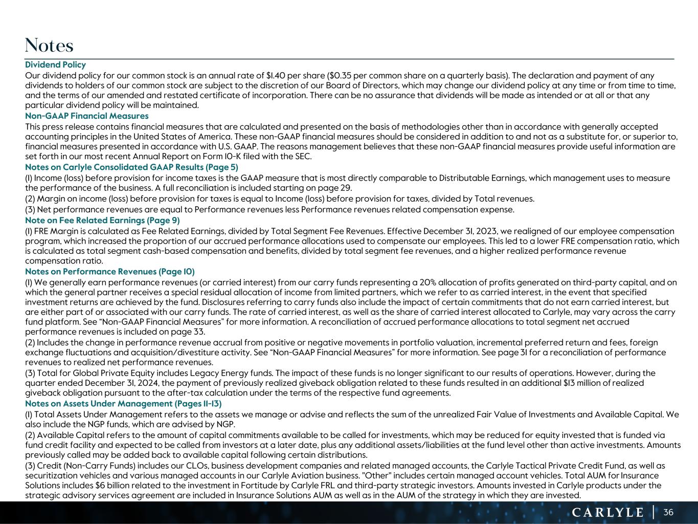 R-14 7 G-19 5 B-19 7 R-88 G-15 9 B-16 5 R-13 6 G-18 0 B-83 R-16 3 G-14 3 B-18 7 R-0 G-74 B-13 6 R-18 5 G-21 1 B-15 3 R-11 8 G-92 B-15 0 R-22 0 G-22 1 B-23 2 R-14 0 G-14 1 B-15 2R-12 0 G-16 9 B-22 2 Old Colors R-88 G-89 B-91 58595B R-23 G-234 B-234 EAEAEA R-208 G-232 B-247 D0E8F7 R-65 G-64 B-66 414042 R-8 G-51 B-94 08335E R-167 G-169 B-171 A7A9AB R-9 G-102 B-112 096670 R-220 G-221 B-222 DCDDDE R-97 G-161 B-224 61A1E0 R-237 G-217 B-157 EDD99D R-147 G-195 B-197 93C3C5 Notes Dividend Policy Our dividend policy for our common stock is an annual rate of $1.40 per share ($0.35 per common share on a quarterly basis). The declaration and payment of any dividends to holders of our common stock are subject to the discretion of our Board of Directors, which may change our dividend policy at any time or from time to time, and the terms of our amended and restated certificate of incorporation. There can be no assurance that dividends will be made as intended or at all or that any particular dividend policy will be maintained. Non-GAAP Financial Measures This press release contains financial measures that are calculated and presented on the basis of methodologies other than in accordance with generally accepted accounting principles in the United States of America. These non-GAAP financial measures should be considered in addition to and not as a substitute for, or superior to, financial measures presented in accordance with U.S. GAAP. The reasons management believes that these non-GAAP financial measures provide useful information are set forth in our most recent Annual Report on Form 10-K filed with the SEC. Notes on Carlyle Consolidated GAAP Results (Page 5) (1) Income (loss) before provision for income taxes is the GAAP measure that is most directly comparable to Distributable Earnings, which management uses to measure the performance of the business. A full reconciliation is included starting on page 29. (2) Margin on income (loss) before provision for taxes is equal to Income (loss) before provision for taxes, divided by Total revenues. (3) Net performance revenues are equal to Performance revenues less Performance revenues related compensation expense. Note on Fee Related Earnings (Page 9) (1) FRE Margin is calculated as Fee Related Earnings, divided by Total Segment Fee Revenues. Effective December 31, 2023, we realigned of our employee compensation program, which increased the proportion of our accrued performance allocations used to compensate our employees. This led to a lower FRE compensation ratio, which is calculated as total segment cash-based compensation and benefits, divided by total segment fee revenues, and a higher realized performance revenue compensation ratio. Notes on Performance Revenues (Page 10) (1) We generally earn performance revenues (or carried interest) from our carry funds representing a 20% allocation of profits generated on third-party capital, and on which the general partner receives a special residual allocation of income from limited partners, which we refer to as carried interest, in the event that specified investment returns are achieved by the fund. Disclosures referring to carry funds also include the impact of certain commitments that do not earn carried interest, but are either part of or associated with our carry funds. The rate of carried interest, as well as the share of carried interest allocated to Carlyle, may vary across the carry fund platform. See “Non-GAAP Financial Measures” for more information. A reconciliation of accrued performance allocations to total segment net accrued performance revenues is included on page 33. (2) Includes the change in performance revenue accrual from positive or negative movements in portfolio valuation, incremental preferred return and fees, foreign exchange fluctuations and acquisition/divestiture activity. See “Non-GAAP Financial Measures” for more information. See page 31 for a reconciliation of performance revenues to realized net performance revenues. (3) Total for Global Private Equity includes Legacy Energy funds. The impact of these funds is no longer significant to our results of operations. However, during the quarter ended December 31, 2024, the payment of previously realized giveback obligation related to these funds resulted in an additional $13 million of realized giveback obligation pursuant to the after-tax calculation under the terms of the respective fund agreements. Notes on Assets Under Management (Pages 11-13) (1) Total Assets Under Management refers to the assets we manage or advise and reflects the sum of the unrealized Fair Value of Investments and Available Capital. We also include the NGP funds, which are advised by NGP. (2) Available Capital refers to the amount of capital commitments available to be called for investments, which may be reduced for equity invested that is funded via fund credit facility and expected to be called from investors at a later date, plus any additional assets/liabilities at the fund level other than active investments. Amounts previously called may be added back to available capital following certain distributions. (3) Credit (Non-Carry Funds) includes our CLOs, business development companies and related managed accounts, the Carlyle Tactical Private Credit Fund, as well as securitization vehicles and various managed accounts in our Carlyle Aviation business. "Other" includes certain managed account vehicles. Total AUM for Insurance Solutions includes $6 billion related to the investment in Fortitude by Carlyle FRL and third-party strategic investors. Amounts invested in Carlyle products under the strategic advisory services agreement are included in Insurance Solutions AUM as well as in the AUM of the strategy in which they are invested. 36