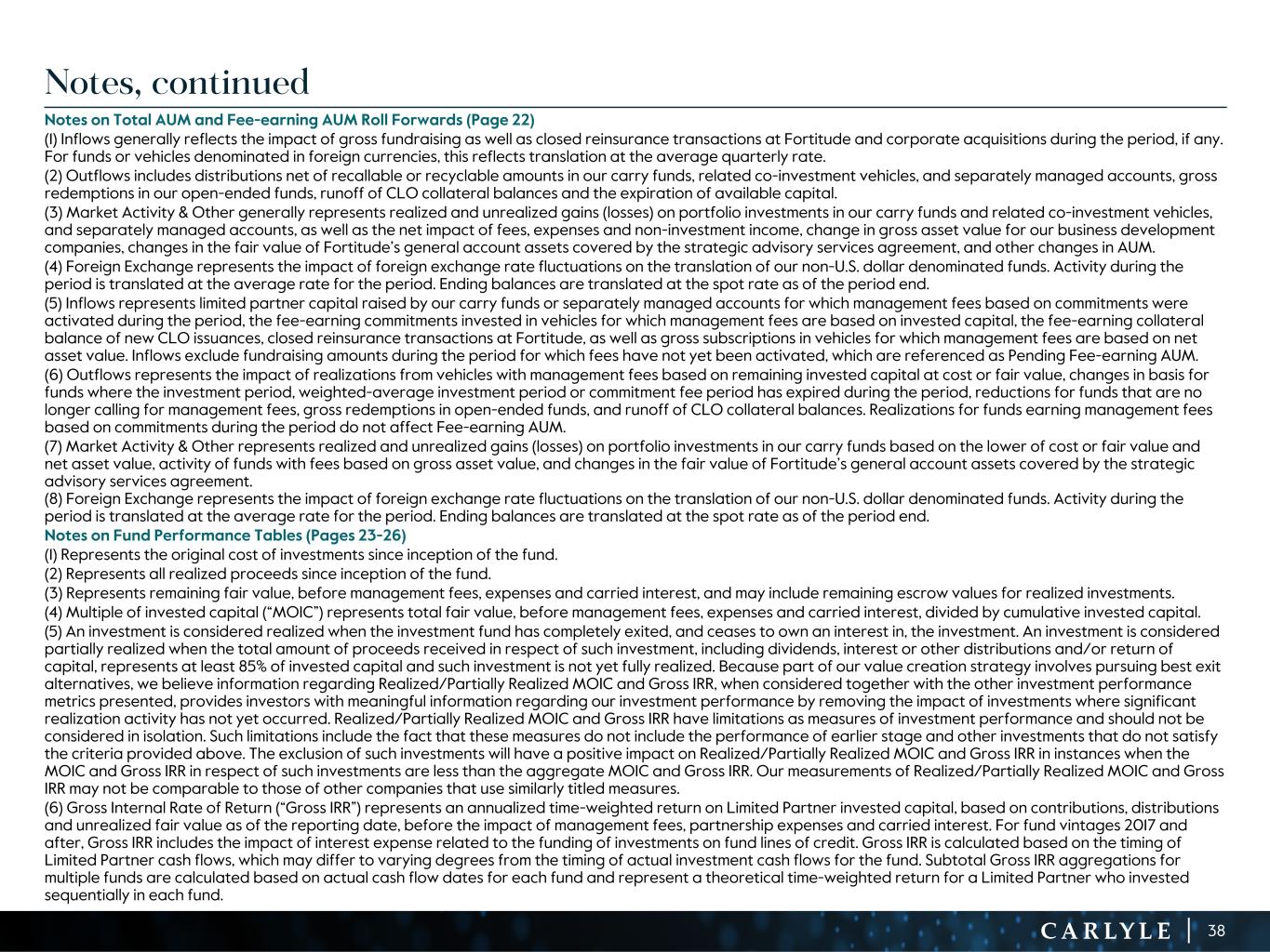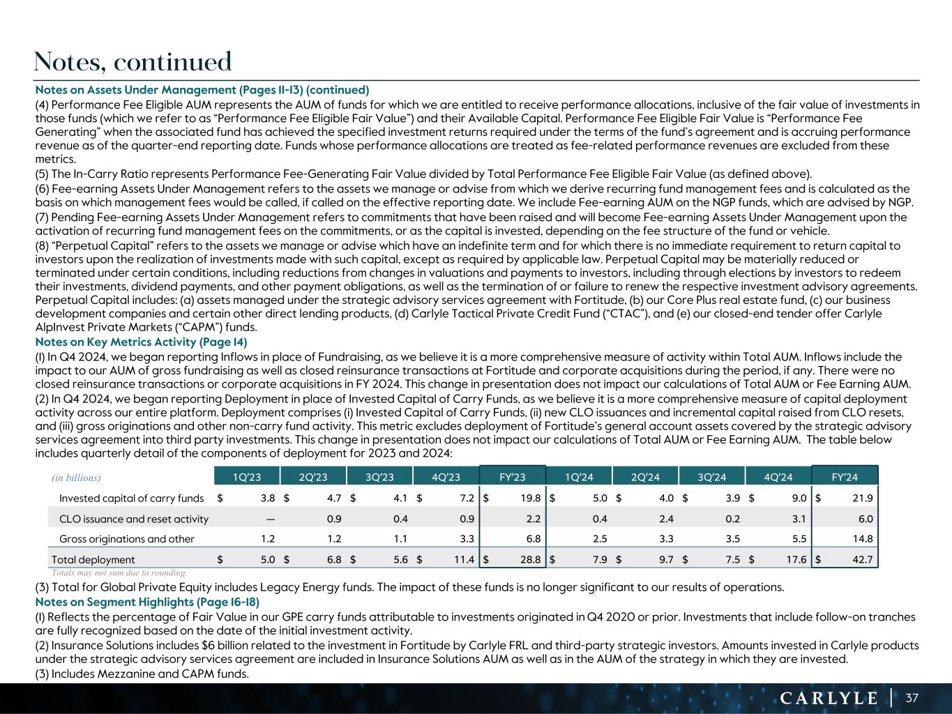 R-14 7 G-19 5 B-19 7 R-88 G-15 9 B-16 5 R-13 6 G-18 0 B-83 R-16 3 G-14 3 B-18 7 R-0 G-74 B-13 6 R-18 5 G-21 1 B-15 3 R-11 8 G-92 B-15 0 R-22 0 G-22 1 B-23 2 R-14 0 G-14 1 B-15 2R-12 0 G-16 9 B-22 2 Old Colors R-88 G-89 B-91 58595B R-23 G-234 B-234 EAEAEA R-208 G-232 B-247 D0E8F7 R-65 G-64 B-66 414042 R-8 G-51 B-94 08335E R-167 G-169 B-171 A7A9AB R-9 G-102 B-112 096670 R-220 G-221 B-222 DCDDDE R-97 G-161 B-224 61A1E0 R-237 G-217 B-157 EDD99D R-147 G-195 B-197 93C3C5 Notes on Assets Under Management (Pages 11-13) (continued) (4) Performance Fee Eligible AUM represents the AUM of funds for which we are entitled to receive performance allocations, inclusive of the fair value of investments in those funds (which we refer to as “Performance Fee Eligible Fair Value”) and their Available Capital. Performance Fee Eligible Fair Value is “Performance Fee Generating” when the associated fund has achieved the specified investment returns required under the terms of the fund’s agreement and is accruing performance revenue as of the quarter-end reporting date. Funds whose performance allocations are treated as fee-related performance revenues are excluded from these metrics. (5) The In-Carry Ratio represents Performance Fee-Generating Fair Value divided by Total Performance Fee Eligible Fair Value (as defined above). (6) Fee-earning Assets Under Management refers to the assets we manage or advise from which we derive recurring fund management fees and is calculated as the basis on which management fees would be called, if called on the effective reporting date. We include Fee-earning AUM on the NGP funds, which are advised by NGP. (7) Pending Fee-earning Assets Under Management refers to commitments that have been raised and will become Fee-earning Assets Under Management upon the activation of recurring fund management fees on the commitments, or as the capital is invested, depending on the fee structure of the fund or vehicle. (8) “Perpetual Capital” refers to the assets we manage or advise which have an indefinite term and for which there is no immediate requirement to return capital to investors upon the realization of investments made with such capital, except as required by applicable law. Perpetual Capital may be materially reduced or terminated under certain conditions, including reductions from changes in valuations and payments to investors, including through elections by investors to redeem their investments, dividend payments, and other payment obligations, as well as the termination of or failure to renew the respective investment advisory agreements. Perpetual Capital includes: (a) assets managed under the strategic advisory services agreement with Fortitude, (b) our Core Plus real estate fund, (c) our business development companies and certain other direct lending products, (d) Carlyle Tactical Private Credit Fund (“CTAC”), and (e) our closed-end tender offer Carlyle AlpInvest Private Markets (“CAPM”) funds. Notes on Key Metrics Activity (Page 14) (1) In Q4 2024, we began reporting Inflows in place of Fundraising, as we believe it is a more comprehensive measure of activity within Total AUM. Inflows include the impact to our AUM of gross fundraising as well as closed reinsurance transactions at Fortitude and corporate acquisitions during the period, if any. There were no closed reinsurance transactions or corporate acquisitions in FY 2024. This change in presentation does not impact our calculations of Total AUM or Fee Earning AUM. (2) In Q4 2024, we began reporting Deployment in place of Invested Capital of Carry Funds, as we believe it is a more comprehensive measure of capital deployment activity across our entire platform. Deployment comprises (i) Invested Capital of Carry Funds, (ii) new CLO issuances and incremental capital raised from CLO resets, and (iii) gross originations and other non-carry fund activity. This metric excludes deployment of Fortitude’s general account assets covered by the strategic advisory services agreement into third party investments. This change in presentation does not impact our calculations of Total AUM or Fee Earning AUM. The table below includes quarterly detail of the components of deployment for 2023 and 2024: (3) Total for Global Private Equity includes Legacy Energy funds. The impact of these funds is no longer significant to our results of operations. Notes on Segment Highlights (Page 16-18) (1) Reflects the percentage of Fair Value in our GPE carry funds attributable to investments originated in Q4 2020 or prior. Investments that include follow-on tranches are fully recognized based on the date of the initial investment activity. (2) Insurance Solutions includes $6 billion related to the investment in Fortitude by Carlyle FRL and third-party strategic investors. Amounts invested in Carlyle products under the strategic advisory services agreement are included in Insurance Solutions AUM as well as in the AUM of the strategy in which they are invested. (3) Includes Mezzanine and CAPM funds. Notes, continued 37 (in billions) 1Q’23 2Q’23 3Q’23 4Q’23 FY’23 1Q’24 2Q’24 3Q’24 4Q’24 FY’24 Invested capital of carry funds $ 3.8 $ 4.7 $ 4.1 $ 7.2 $ 19.8 $ 5.0 $ 4.0 $ 3.9 $ 9.0 $ 21.9 CLO issuance and reset activity — 0.9 0.4 0.9 2.2 0.4 2.4 0.2 3.1 6.0 Gross originations and other 1.2 1.2 1.1 3.3 6.8 2.5 3.3 3.5 5.5 14.8 Total deployment $ 5.0 $ 6.8 $ 5.6 $ 11.4 $ 28.8 $ 7.9 $ 9.7 $ 7.5 $ 17.6 $ 42.7 Totals may not sum due to rounding.