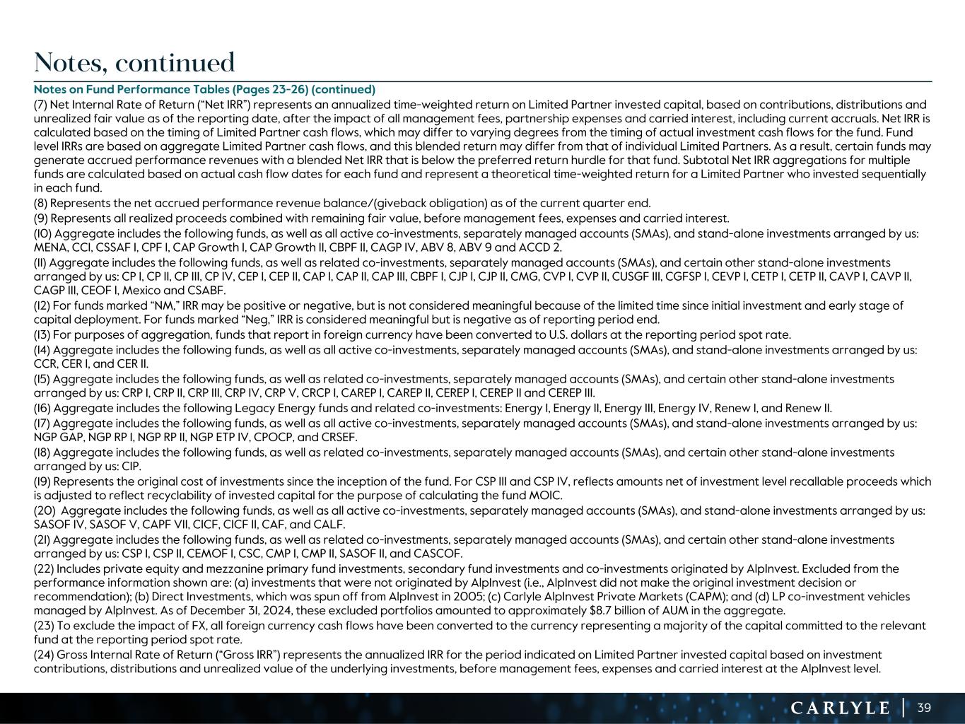 R-14 7 G-19 5 B-19 7 R-88 G-15 9 B-16 5 R-13 6 G-18 0 B-83 R-16 3 G-14 3 B-18 7 R-0 G-74 B-13 6 R-18 5 G-21 1 B-15 3 R-11 8 G-92 B-15 0 R-22 0 G-22 1 B-23 2 R-14 0 G-14 1 B-15 2R-12 0 G-16 9 B-22 2 Old Colors R-88 G-89 B-91 58595B R-23 G-234 B-234 EAEAEA R-208 G-232 B-247 D0E8F7 R-65 G-64 B-66 414042 R-8 G-51 B-94 08335E R-167 G-169 B-171 A7A9AB R-9 G-102 B-112 096670 R-220 G-221 B-222 DCDDDE R-97 G-161 B-224 61A1E0 R-237 G-217 B-157 EDD99D R-147 G-195 B-197 93C3C5 Notes, continued Notes on Fund Performance Tables (Pages 23-26) (continued) (7) Net Internal Rate of Return (“Net IRR”) represents an annualized time-weighted return on Limited Partner invested capital, based on contributions, distributions and unrealized fair value as of the reporting date, after the impact of all management fees, partnership expenses and carried interest, including current accruals. Net IRR is calculated based on the timing of Limited Partner cash flows, which may differ to varying degrees from the timing of actual investment cash flows for the fund. Fund level IRRs are based on aggregate Limited Partner cash flows, and this blended return may differ from that of individual Limited Partners. As a result, certain funds may generate accrued performance revenues with a blended Net IRR that is below the preferred return hurdle for that fund. Subtotal Net IRR aggregations for multiple funds are calculated based on actual cash flow dates for each fund and represent a theoretical time-weighted return for a Limited Partner who invested sequentially in each fund. (8) Represents the net accrued performance revenue balance/(giveback obligation) as of the current quarter end. (9) Represents all realized proceeds combined with remaining fair value, before management fees, expenses and carried interest. (10) Aggregate includes the following funds, as well as all active co-investments, separately managed accounts (SMAs), and stand-alone investments arranged by us: MENA, CCI, CSSAF I, CPF I, CAP Growth I, CAP Growth II, CBPF II, CAGP IV, ABV 8, ABV 9 and ACCD 2. (11) Aggregate includes the following funds, as well as related co-investments, separately managed accounts (SMAs), and certain other stand-alone investments arranged by us: CP I, CP II, CP III, CP IV, CEP I, CEP II, CAP I, CAP II, CAP III, CBPF I, CJP I, CJP II, CMG, CVP I, CVP II, CUSGF III, CGFSP I, CEVP I, CETP I, CETP II, CAVP I, CAVP II, CAGP III, CEOF I, Mexico and CSABF. (12) For funds marked “NM,” IRR may be positive or negative, but is not considered meaningful because of the limited time since initial investment and early stage of capital deployment. For funds marked “Neg,” IRR is considered meaningful but is negative as of reporting period end. (13) For purposes of aggregation, funds that report in foreign currency have been converted to U.S. dollars at the reporting period spot rate. (14) Aggregate includes the following funds, as well as all active co-investments, separately managed accounts (SMAs), and stand-alone investments arranged by us: CCR, CER I, and CER II. (15) Aggregate includes the following funds, as well as related co-investments, separately managed accounts (SMAs), and certain other stand-alone investments arranged by us: CRP I, CRP II, CRP III, CRP IV, CRP V, CRCP I, CAREP I, CAREP II, CEREP I, CEREP II and CEREP III. (16) Aggregate includes the following Legacy Energy funds and related co-investments: Energy I, Energy II, Energy III, Energy IV, Renew I, and Renew II. (17) Aggregate includes the following funds, as well as all active co-investments, separately managed accounts (SMAs), and stand-alone investments arranged by us: NGP GAP, NGP RP I, NGP RP II, NGP ETP IV, CPOCP, and CRSEF. (18) Aggregate includes the following funds, as well as related co-investments, separately managed accounts (SMAs), and certain other stand-alone investments arranged by us: CIP. (19) Represents the original cost of investments since the inception of the fund. For CSP III and CSP IV, reflects amounts net of investment level recallable proceeds which is adjusted to reflect recyclability of invested capital for the purpose of calculating the fund MOIC. (20) Aggregate includes the following funds, as well as all active co-investments, separately managed accounts (SMAs), and stand-alone investments arranged by us: SASOF IV, SASOF V, CAPF VII, CICF, CICF II, CAF, and CALF. (21) Aggregate includes the following funds, as well as related co-investments, separately managed accounts (SMAs), and certain other stand-alone investments arranged by us: CSP I, CSP II, CEMOF I, CSC, CMP I, CMP II, SASOF II, and CASCOF. (22) Includes private equity and mezzanine primary fund investments, secondary fund investments and co-investments originated by AlpInvest. Excluded from the performance information shown are: (a) investments that were not originated by AlpInvest (i.e., AlpInvest did not make the original investment decision or recommendation); (b) Direct Investments, which was spun off from AlpInvest in 2005; (c) Carlyle AlpInvest Private Markets (CAPM); and (d) LP co-investment vehicles managed by AlpInvest. As of December 31, 2024, these excluded portfolios amounted to approximately $8.7 billion of AUM in the aggregate. (23) To exclude the impact of FX, all foreign currency cash flows have been converted to the currency representing a majority of the capital committed to the relevant fund at the reporting period spot rate. (24) Gross Internal Rate of Return (“Gross IRR”) represents the annualized IRR for the period indicated on Limited Partner invested capital based on investment contributions, distributions and unrealized value of the underlying investments, before management fees, expenses and carried interest at the AlpInvest level. 39