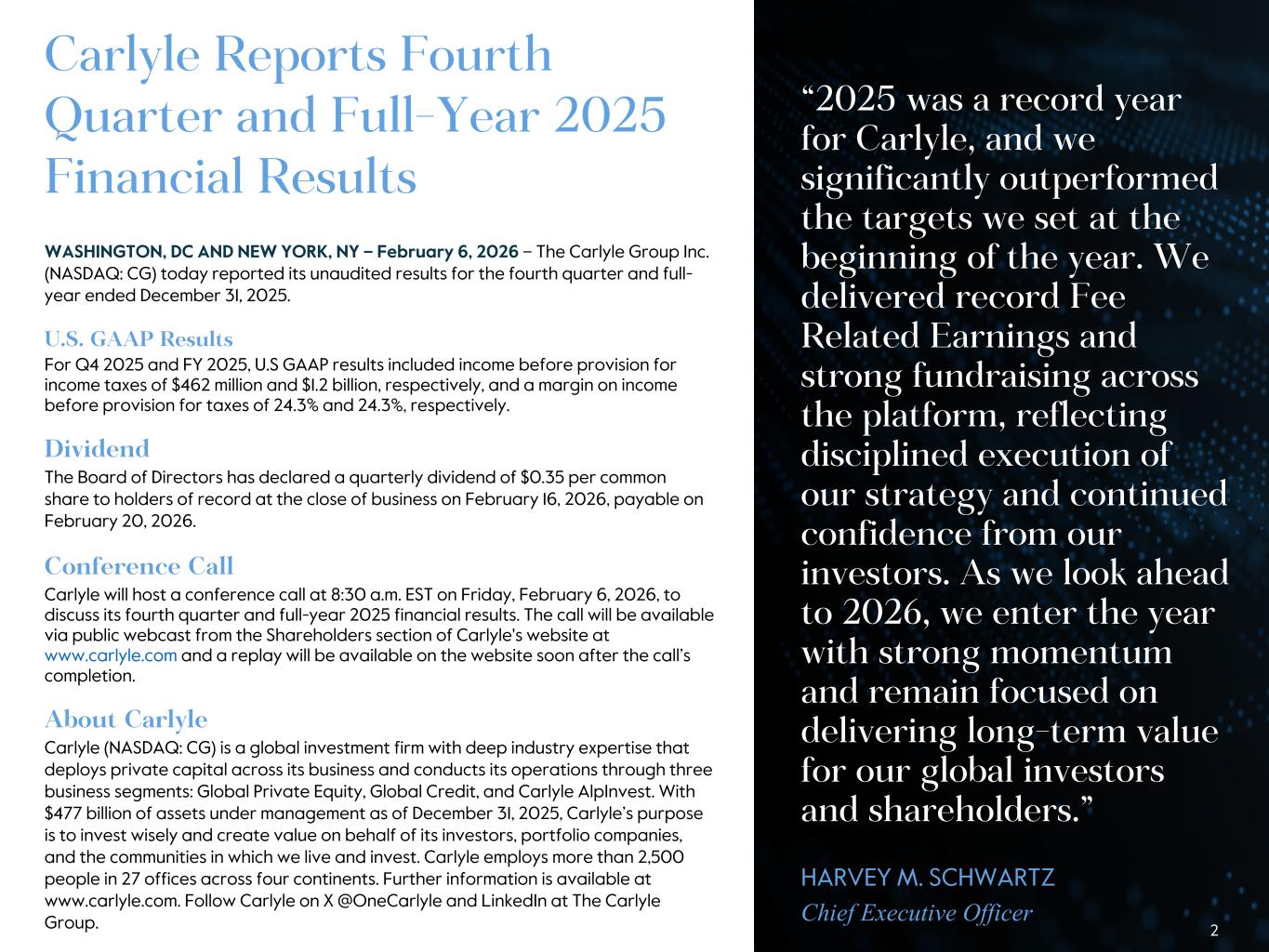 Carlyle Reports Fourth Quarter and Full-Year 2025 Financial Results WASHINGTON, DC AND NEW YORK, NY – February 6, 2026 – The Carlyle Group Inc. (NASDAQ: CG) today reported its unaudited results for the fourth quarter and full- year ended December 31, 2025. U.S. GAAP Results For Q4 2025 and FY 2025, U.S GAAP results included income before provision for income taxes of $462 million and $1.2 billion, respectively, and a margin on income before provision for taxes of 24.3% and 24.3%, respectively. Dividend The Board of Directors has declared a quarterly dividend of $0.35 per common share to holders of record at the close of business on February 16, 2026, payable on February 20, 2026. Conference Call Carlyle will host a conference call at 8:30 a.m. EST on Friday, February 6, 2026, to discuss its fourth quarter and full-year 2025 financial results. The call will be available via public webcast from the Shareholders section of Carlyle's website at www.carlyle.com and a replay will be available on the website soon after the call’s completion. About Carlyle Carlyle (NASDAQ: CG) is a global investment firm with deep industry expertise that deploys private capital across its business and conducts its operations through three business segments: Global Private Equity, Global Credit, and Carlyle AlpInvest. With $477 billion of assets under management as of December 31, 2025, Carlyle’s purpose is to invest wisely and create value on behalf of its investors, portfolio companies, and the communities in which we live and invest. Carlyle employs more than 2,500 people in 27 offices across four continents. Further information is available at www.carlyle.com. Follow Carlyle on X @OneCarlyle and LinkedIn at The Carlyle Group. 2 “2025 was a record year for Carlyle, and we significantly outperformed the targets we set at the beginning of the year. We delivered record Fee Related Earnings and strong fundraising across the platform, reflecting disciplined execution of our strategy and continued confidence from our investors. As we look ahead to 2026, we enter the year with strong momentum and remain focused on delivering long-term value for our global investors and shareholders.” HARVEY M. SCHWARTZ Chief Executive Officer