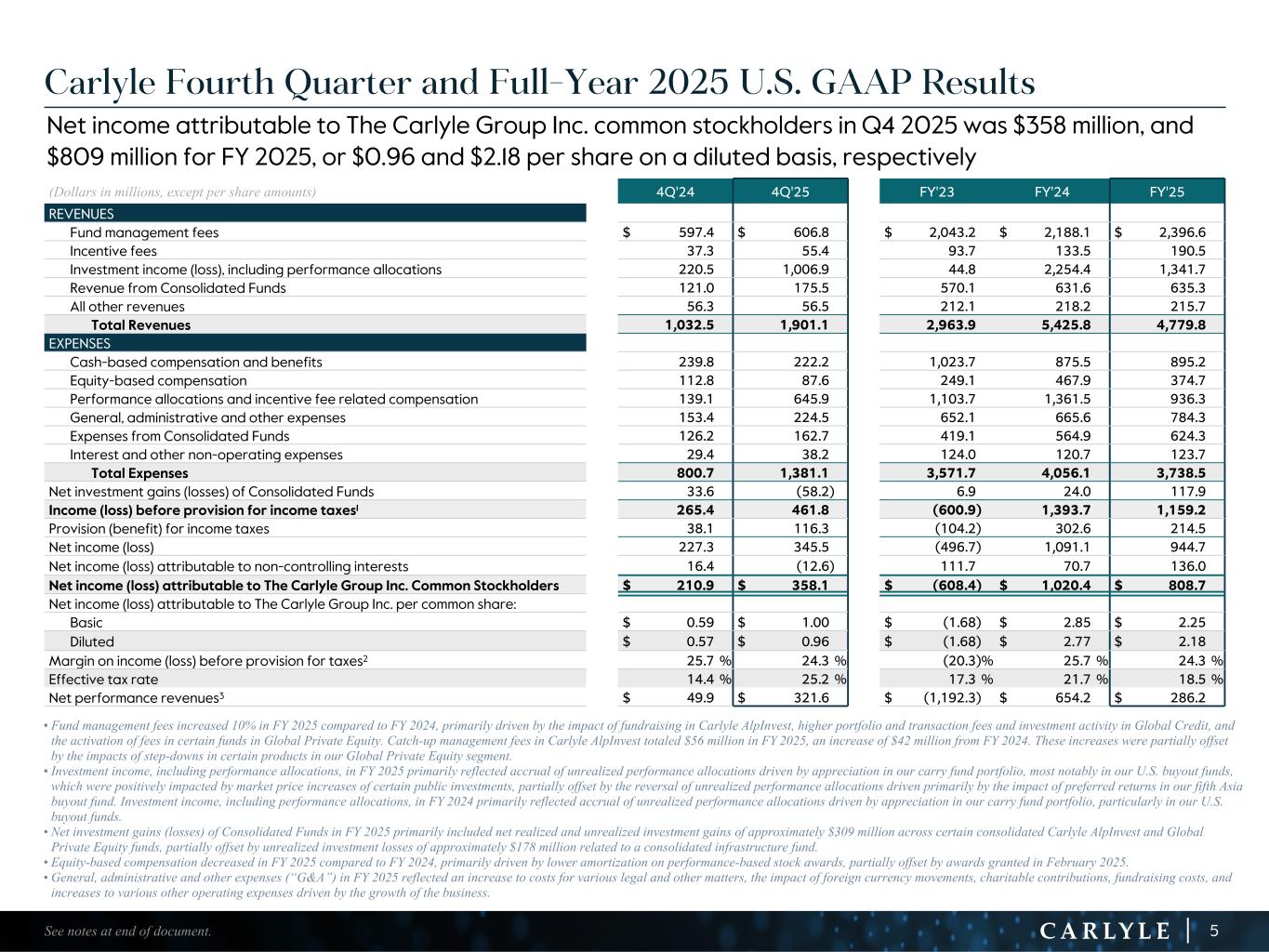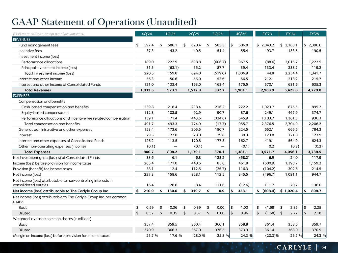R-14 7 G-19 5 B-19 7 R-88 G-15 9 B-16 5 R-13 6 G-18 0 B-83 R-16 3 G-14 3 B-18 7 R-0 G-74 B-13 6 R-18 5 G-21 1 B-15 3 R-11 8 G-92 B-15 0 R-22 0 G-22 1 B-23 2 R-14 0 G-14 1 B-15 2R-12 0 G-16 9 B-22 2 Old Colors R-88 G-89 B-91 58595B R-23 G-234 B-234 EAEAEA R-208 G-232 B-247 D0E8F7 R-65 G-64 B-66 414042 R-8 G-51 B-94 08335E R-167 G-169 B-171 A7A9AB R-9 G-102 B-112 096670 R-220 G-221 B-222 DCDDDE R-97 G-161 B-224 61A1E0 R-237 G-217 B-157 EDD99D R-147 G-195 B-197 93C3C5 GAAP Statement of Operations (Unaudited) (Dollars in millions, except per share amounts) 4Q'24 1Q’25 2Q’25 3Q’25 4Q'25 FY'23 FY'24 FY'25 REVENUES Fund management fees $ 597.4 $ 586.1 $ 620.4 $ 583.3 $ 606.8 $ 2,043.2 $ 2,188.1 $ 2,396.6 Incentive fees 37.3 43.2 40.5 51.4 55.4 93.7 133.5 190.5 Investment income (loss) Performance allocations 189.0 222.9 638.8 (606.7) 967.5 (88.6) 2,015.7 1,222.5 Principal investment income (loss) 31.5 (63.1) 55.2 87.7 39.4 133.4 238.7 119.2 Total investment income (loss) 220.5 159.8 694.0 (519.0) 1,006.9 44.8 2,254.4 1,341.7 Interest and other income 56.3 50.6 55.0 53.6 56.5 212.1 218.2 215.7 Interest and other income of Consolidated Funds 121.0 133.4 163.0 163.4 175.5 570.1 631.6 635.3 Total Revenues 1,032.5 973.1 1,572.9 332.7 1,901.1 2,963.9 5,425.8 4,779.8 EXPENSES Compensation and benefits Cash-based compensation and benefits 239.8 218.4 238.4 216.2 222.2 1,023.7 875.5 895.2 Equity-based compensation 112.8 103.5 92.9 90.7 87.6 249.1 467.9 374.7 Performance allocations and incentive fee related compensation 139.1 171.4 443.6 (324.6) 645.9 1,103.7 1,361.5 936.3 Total compensation and benefits 491.7 493.3 774.9 (17.7) 955.7 2,376.5 2,704.9 2,206.2 General, administrative and other expenses 153.4 173.6 205.5 180.7 224.5 652.1 665.6 784.3 Interest 29.5 27.8 28.0 29.8 38.3 123.8 121.0 123.9 Interest and other expenses of Consolidated Funds 126.2 113.5 170.8 177.3 162.7 419.1 564.9 624.3 Other non-operating expenses (income) (0.1) — (0.1) — (0.1) 0.2 (0.3) (0.2) Total Expenses 800.7 808.2 1,179.1 370.1 1,381.1 3,571.7 4,056.1 3,738.5 Net investment gains (losses) of Consolidated Funds 33.6 6.1 46.8 123.2 (58.2) 6.9 24.0 117.9 Income (loss) before provision for income taxes 265.4 171.0 440.6 85.8 461.8 (600.9) 1,393.7 1,159.2 Provision (benefit) for income taxes 38.1 12.4 112.5 (26.7) 116.3 (104.2) 302.6 214.5 Net income (loss) 227.3 158.6 328.1 112.5 345.5 (496.7) 1,091.1 944.7 Net income (loss) attributable to non-controlling interests in consolidated entities 16.4 28.6 8.4 111.6 (12.6) 111.7 70.7 136.0 Net income (loss) attributable to The Carlyle Group Inc. $ 210.9 $ 130.0 $ 319.7 $ 0.9 $ 358.1 $ (608.4) $ 1,020.4 $ 808.7 Net income (loss) attributable to The Carlyle Group Inc. per common share Basic $ 0.59 $ 0.36 $ 0.89 $ 0.00 $ 1.00 $ (1.68) $ 2.85 $ 2.25 Diluted $ 0.57 $ 0.35 $ 0.87 $ 0.00 $ 0.96 $ (1.68) $ 2.77 $ 2.18 Weighted-average common shares (in millions) Basic 357.4 359.5 360.4 360.1 358.8 361.4 358.6 359.7 Diluted 370.9 366.3 367.0 376.5 373.9 361.4 368.0 370.9 Margin on income (loss) before provision for income taxes 25.7 % 17.6 % 28.0 % 25.8 % 24.3 % (20.3) % 25.7 % 24.3 % 34
