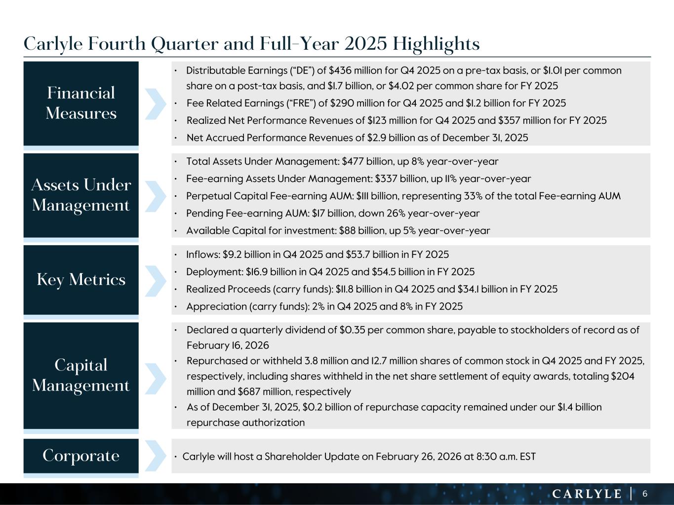 R-14 7 G-19 5 B-19 7 R-88 G-15 9 B-16 5 R-13 6 G-18 0 B-83 R-16 3 G-14 3 B-18 7 R-0 G-74 B-13 6 R-18 5 G-21 1 B-15 3 R-11 8 G-92 B-15 0 R-22 0 G-22 1 B-23 2 R-14 0 G-14 1 B-15 2R-12 0 G-16 9 B-22 2 Old Colors R-88 G-89 B-91 58595B R-23 G-234 B-234 EAEAEA R-208 G-232 B-247 D0E8F7 R-65 G-64 B-66 414042 R-8 G-51 B-94 08335E R-167 G-169 B-171 A7A9AB R-9 G-102 B-112 096670 R-220 G-221 B-222 DCDDDE R-97 G-161 B-224 61A1E0 R-237 G-217 B-157 EDD99D R-147 G-195 B-197 93C3C5 Financial Measures • Distributable Earnings (“DE”) of $436 million for Q4 2025 on a pre-tax basis, or $1.01 per common share on a post-tax basis, and $1.7 billion, or $4.02 per common share for FY 2025 • Fee Related Earnings (“FRE”) of $290 million for Q4 2025 and $1.2 billion for FY 2025 • Realized Net Performance Revenues of $123 million for Q4 2025 and $357 million for FY 2025 • Net Accrued Performance Revenues of $2.9 billion as of December 31, 2025 Assets Under Management • Total Assets Under Management: $477 billion, up 8% year-over-year • Fee-earning Assets Under Management: $337 billion, up 11% year-over-year • Perpetual Capital Fee-earning AUM: $111 billion, representing 33% of the total Fee-earning AUM • Pending Fee-earning AUM: $17 billion, down 26% year-over-year • Available Capital for investment: $88 billion, up 5% year-over-year Key Metrics • Inflows: $9.2 billion in Q4 2025 and $53.7 billion in FY 2025 • Deployment: $16.9 billion in Q4 2025 and $54.5 billion in FY 2025 • Realized Proceeds (carry funds): $11.8 billion in Q4 2025 and $34.1 billion in FY 2025 • Appreciation (carry funds): 2% in Q4 2025 and 8% in FY 2025 Capital Management • Declared a quarterly dividend of $0.35 per common share, payable to stockholders of record as of February 16, 2026 • Repurchased or withheld 3.8 million and 12.7 million shares of common stock in Q4 2025 and FY 2025, respectively, including shares withheld in the net share settlement of equity awards, totaling $204 million and $687 million, respectively • As of December 31, 2025, $0.2 billion of repurchase capacity remained under our $1.4 billion repurchase authorization Corporate • Carlyle will host a Shareholder Update on February 26, 2026 at 8:30 a.m. EST Carlyle Fourth Quarter and Full-Year 2025 Highlights 6