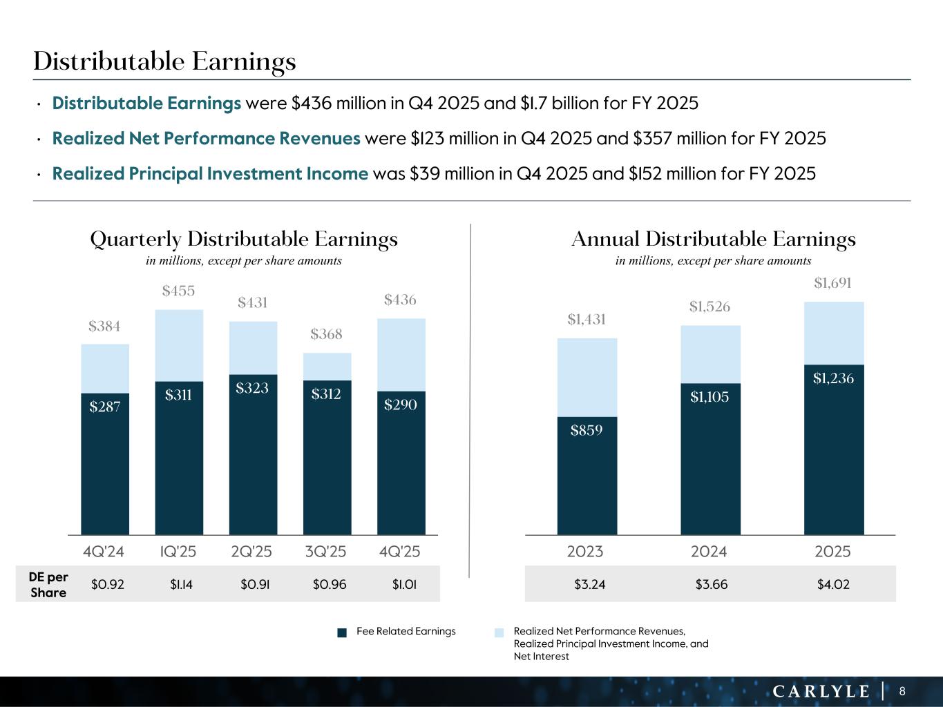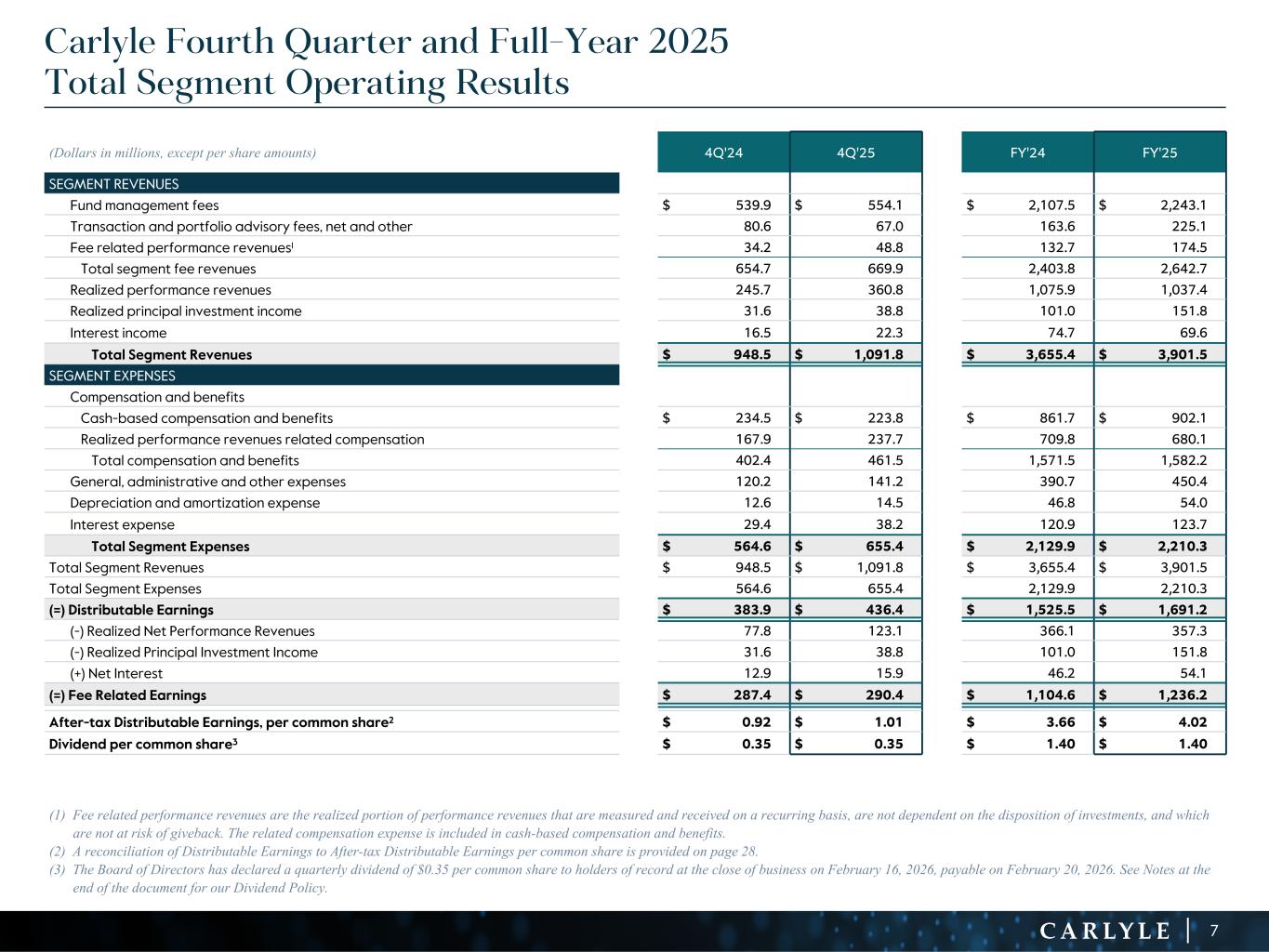 R-14 7 G-19 5 B-19 7 R-88 G-15 9 B-16 5 R-13 6 G-18 0 B-83 R-16 3 G-14 3 B-18 7 R-0 G-74 B-13 6 R-18 5 G-21 1 B-15 3 R-11 8 G-92 B-15 0 R-22 0 G-22 1 B-23 2 R-14 0 G-14 1 B-15 2R-12 0 G-16 9 B-22 2 Old Colors R-88 G-89 B-91 58595B R-23 G-234 B-234 EAEAEA R-208 G-232 B-247 D0E8F7 R-65 G-64 B-66 414042 R-8 G-51 B-94 08335E R-167 G-169 B-171 A7A9AB R-9 G-102 B-112 096670 R-220 G-221 B-222 DCDDDE R-97 G-161 B-224 61A1E0 R-237 G-217 B-157 EDD99D R-147 G-195 B-197 93C3C5 Carlyle Fourth Quarter and Full-Year 2025 Total Segment Operating Results (1) Fee related performance revenues are the realized portion of performance revenues that are measured and received on a recurring basis, are not dependent on the disposition of investments, and which are not at risk of giveback. The related compensation expense is included in cash-based compensation and benefits. (2) A reconciliation of Distributable Earnings to After-tax Distributable Earnings per common share is provided on page 28. (3) The Board of Directors has declared a quarterly dividend of $0.35 per common share to holders of record at the close of business on February 16, 2026, payable on February 20, 2026. See Notes at the end of the document for our Dividend Policy. (Dollars in millions, except per share amounts) 4Q'24 4Q'25 FY'24 FY'25 SEGMENT REVENUES Fund management fees $ 539.9 $ 554.1 $ 2,107.5 $ 2,243.1 Transaction and portfolio advisory fees, net and other 80.6 67.0 163.6 225.1 Fee related performance revenues1 34.2 48.8 132.7 174.5 Total segment fee revenues 654.7 669.9 2,403.8 2,642.7 Realized performance revenues 245.7 360.8 1,075.9 1,037.4 Realized principal investment income 31.6 38.8 101.0 151.8 Interest income 16.5 22.3 74.7 69.6 Total Segment Revenues $ 948.5 $ 1,091.8 $ 3,655.4 $ 3,901.5 SEGMENT EXPENSES Compensation and benefits Cash-based compensation and benefits $ 234.5 $ 223.8 $ 861.7 $ 902.1 Realized performance revenues related compensation 167.9 237.7 709.8 680.1 Total compensation and benefits 402.4 461.5 1,571.5 1,582.2 General, administrative and other expenses 120.2 141.2 390.7 450.4 Depreciation and amortization expense 12.6 14.5 46.8 54.0 Interest expense 29.4 38.2 120.9 123.7 Total Segment Expenses $ 564.6 $ 655.4 $ 2,129.9 $ 2,210.3 Total Segment Revenues $ 948.5 $ 1,091.8 $ 3,655.4 $ 3,901.5 Total Segment Expenses 564.6 655.4 2,129.9 2,210.3 (=) Distributable Earnings $ 383.9 $ 436.4 $ 1,525.5 $ 1,691.2 (-) Realized Net Performance Revenues 77.8 123.1 366.1 357.3 (-) Realized Principal Investment Income 31.6 38.8 101.0 151.8 (+) Net Interest 12.9 15.9 46.2 54.1 (=) Fee Related Earnings $ 287.4 $ 290.4 $ 1,104.6 $ 1,236.2 After-tax Distributable Earnings, per common share2 $ 0.92 $ 1.01 $ 3.66 $ 4.02 Dividend per common share3 $ 0.35 $ 0.35 $ 1.40 $ 1.40 7