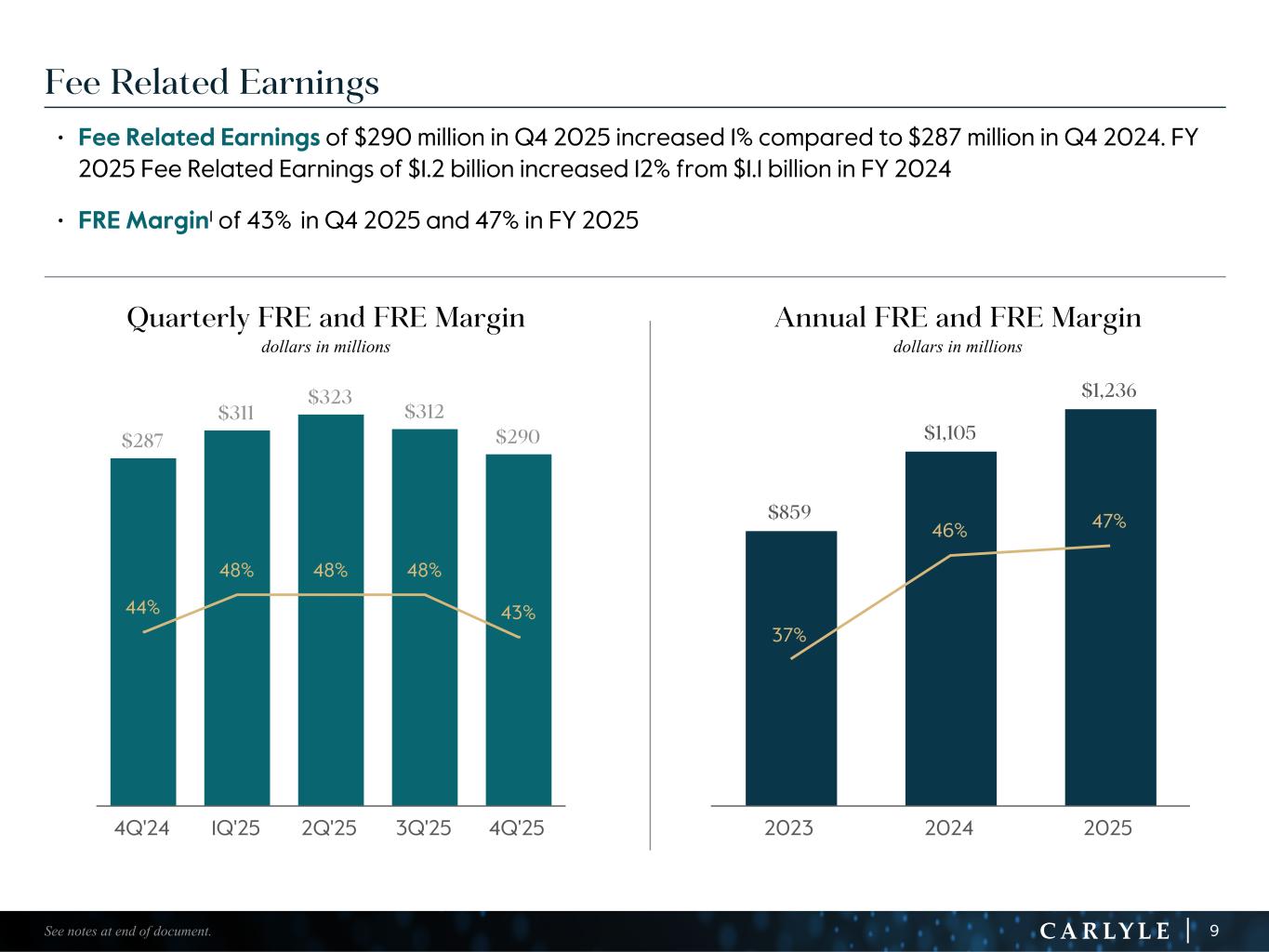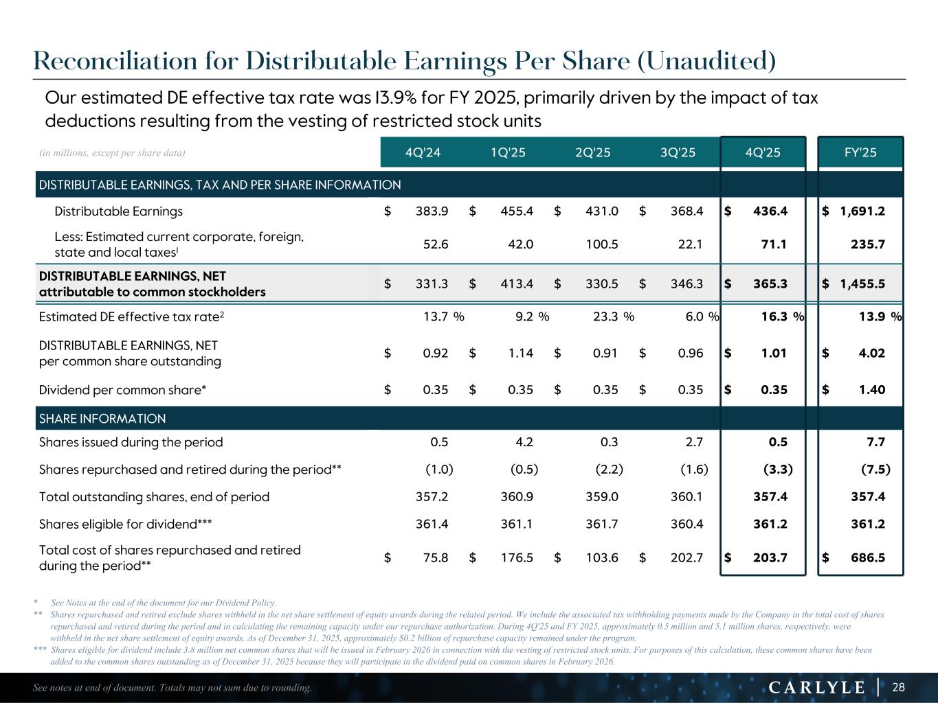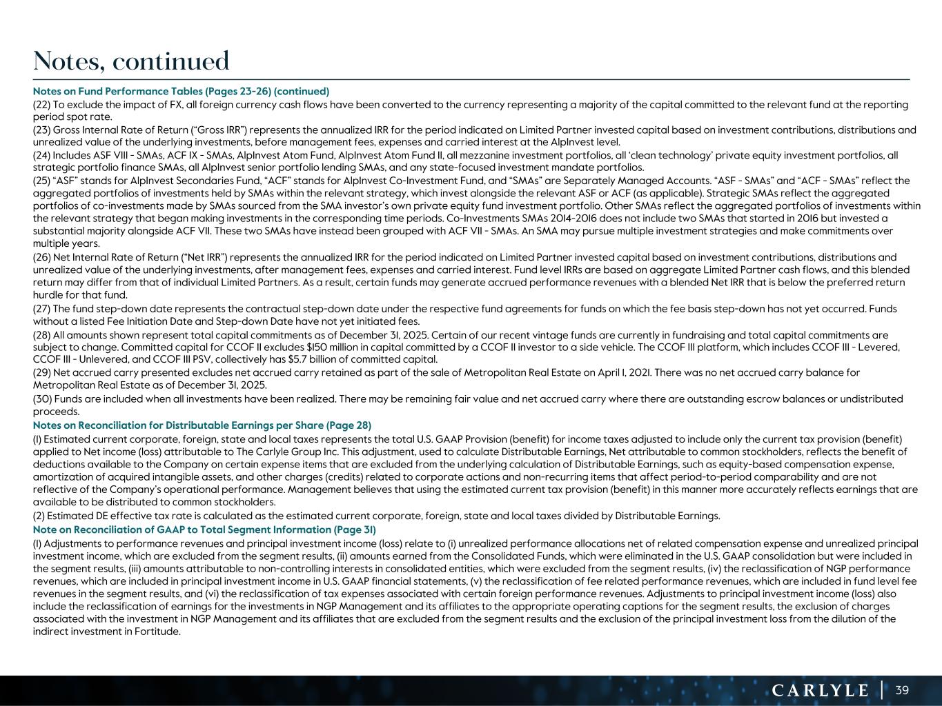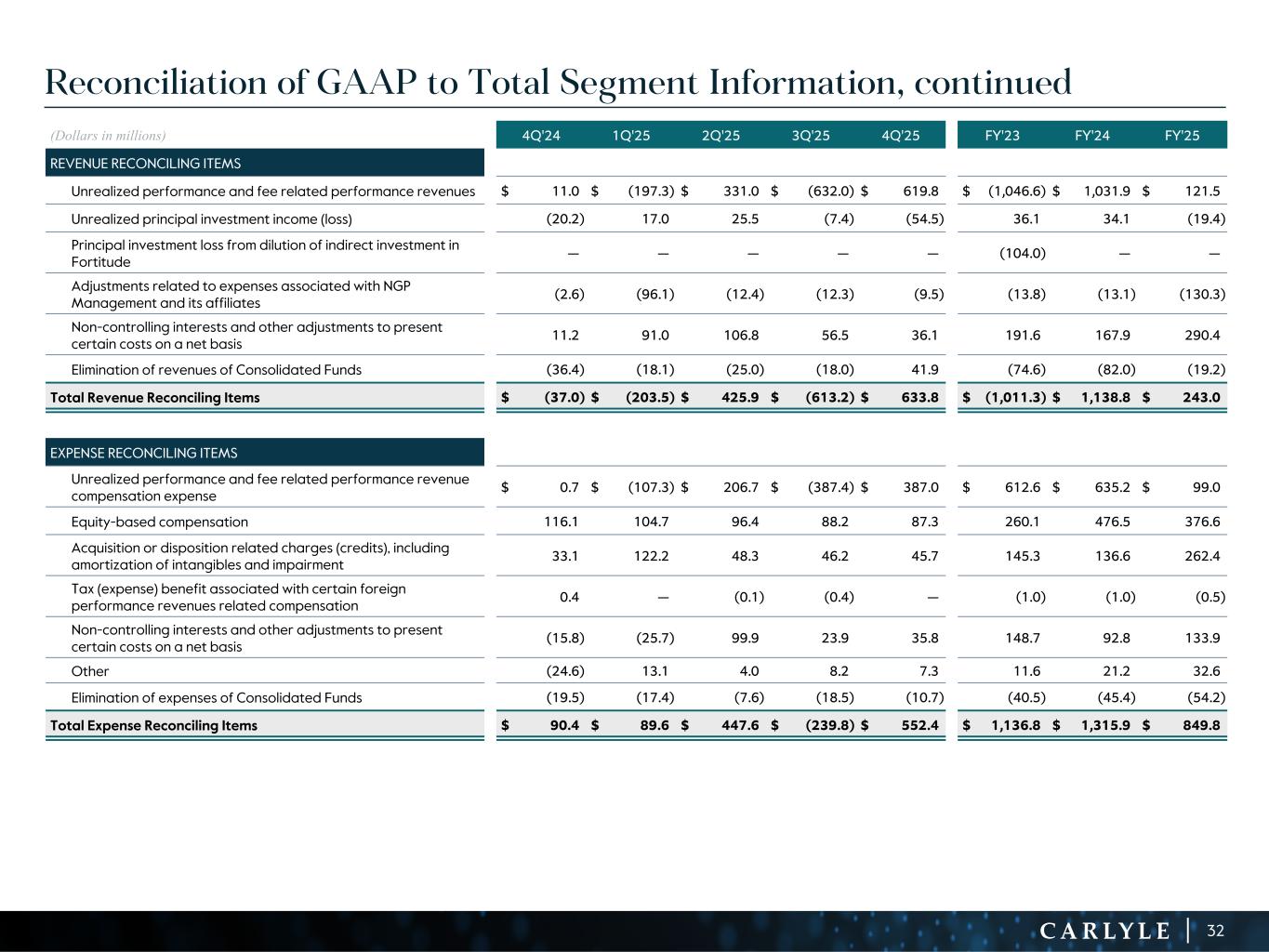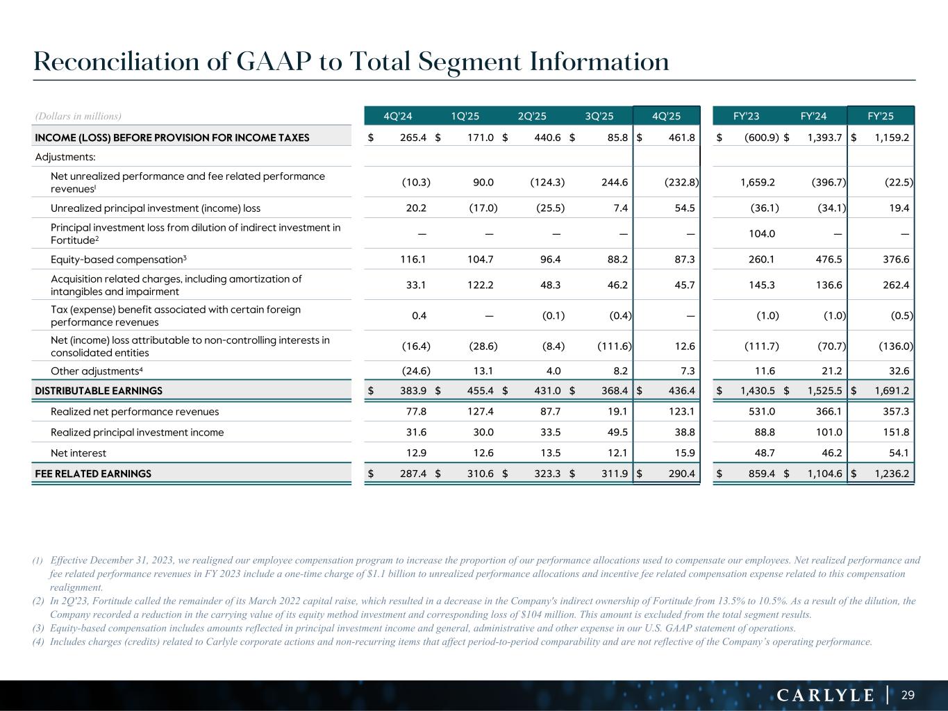 R-14 7 G-19 5 B-19 7 R-88 G-15 9 B-16 5 R-13 6 G-18 0 B-83 R-16 3 G-14 3 B-18 7 R-0 G-74 B-13 6 R-18 5 G-21 1 B-15 3 R-11 8 G-92 B-15 0 R-22 0 G-22 1 B-23 2 R-14 0 G-14 1 B-15 2R-12 0 G-16 9 B-22 2 Old Colors R-88 G-89 B-91 58595B R-23 G-234 B-234 EAEAEA R-208 G-232 B-247 D0E8F7 R-65 G-64 B-66 414042 R-8 G-51 B-94 08335E R-167 G-169 B-171 A7A9AB R-9 G-102 B-112 096670 R-220 G-221 B-222 DCDDDE R-97 G-161 B-224 61A1E0 R-237 G-217 B-157 EDD99D R-147 G-195 B-197 93C3C5 Reconciliation of GAAP to Total Segment Information (1) Effective December 31, 2023, we realigned our employee compensation program to increase the proportion of our performance allocations used to compensate our employees. Net realized performance and fee related performance revenues in FY 2023 include a one-time charge of $1.1 billion to unrealized performance allocations and incentive fee related compensation expense related to this compensation realignment. (2) In 2Q'23, Fortitude called the remainder of its March 2022 capital raise, which resulted in a decrease in the Company's indirect ownership of Fortitude from 13.5% to 10.5%. As a result of the dilution, the Company recorded a reduction in the carrying value of its equity method investment and corresponding loss of $104 million. This amount is excluded from the total segment results. (3) Equity-based compensation includes amounts reflected in principal investment income and general, administrative and other expense in our U.S. GAAP statement of operations. (4) Includes charges (credits) related to Carlyle corporate actions and non-recurring items that affect period-to-period comparability and are not reflective of the Company’s operating performance. (Dollars in millions) 4Q'24 1Q'25 2Q'25 3Q'25 4Q'25 FY'23 FY'24 FY'25 INCOME (LOSS) BEFORE PROVISION FOR INCOME TAXES $ 265.4 $ 171.0 $ 440.6 $ 85.8 $ 461.8 $ (600.9) $ 1,393.7 $ 1,159.2 Adjustments: Net unrealized performance and fee related performance revenues1 (10.3) 90.0 (124.3) 244.6 (232.8) 1,659.2 (396.7) (22.5) Unrealized principal investment (income) loss 20.2 (17.0) (25.5) 7.4 54.5 (36.1) (34.1) 19.4 Principal investment loss from dilution of indirect investment in Fortitude2 — — — — — 104.0 — — Equity-based compensation3 116.1 104.7 96.4 88.2 87.3 260.1 476.5 376.6 Acquisition related charges, including amortization of intangibles and impairment 33.1 122.2 48.3 46.2 45.7 145.3 136.6 262.4 Tax (expense) benefit associated with certain foreign performance revenues 0.4 — (0.1) (0.4) — (1.0) (1.0) (0.5) Net (income) loss attributable to non-controlling interests in consolidated entities (16.4) (28.6) (8.4) (111.6) 12.6 (111.7) (70.7) (136.0) Other adjustments4 (24.6) 13.1 4.0 8.2 7.3 11.6 21.2 32.6 DISTRIBUTABLE EARNINGS $ 383.9 $ 455.4 $ 431.0 $ 368.4 $ 436.4 $ 1,430.5 $ 1,525.5 $ 1,691.2 Realized net performance revenues 77.8 127.4 87.7 19.1 123.1 531.0 366.1 357.3 Realized principal investment income 31.6 30.0 33.5 49.5 38.8 88.8 101.0 151.8 Net interest 12.9 12.6 13.5 12.1 15.9 48.7 46.2 54.1 FEE RELATED EARNINGS $ 287.4 $ 310.6 $ 323.3 $ 311.9 $ 290.4 $ 859.4 $ 1,104.6 $ 1,236.2 29