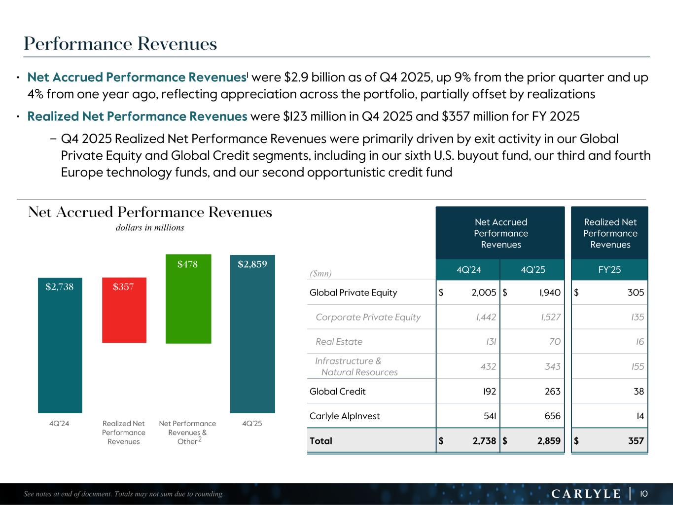 R-14 7 G-19 5 B-19 7 R-88 G-15 9 B-16 5 R-13 6 G-18 0 B-83 R-16 3 G-14 3 B-18 7 R-0 G-74 B-13 6 R-18 5 G-21 1 B-15 3 R-11 8 G-92 B-15 0 R-22 0 G-22 1 B-23 2 R-14 0 G-14 1 B-15 2R-12 0 G-16 9 B-22 2 Old Colors R-88 G-89 B-91 58595B R-23 G-234 B-234 EAEAEA R-208 G-232 B-247 D0E8F7 R-65 G-64 B-66 414042 R-8 G-51 B-94 08335E R-167 G-169 B-171 A7A9AB R-9 G-102 B-112 096670 R-220 G-221 B-222 DCDDDE R-97 G-161 B-224 61A1E0 R-237 G-217 B-157 EDD99D R-147 G-195 B-197 93C3C5 • Net Accrued Performance Revenues1 were $2.9 billion as of Q4 2025, up 9% from the prior quarter and up 4% from one year ago, reflecting appreciation across the portfolio, partially offset by realizations • Realized Net Performance Revenues were $123 million in Q4 2025 and $357 million for FY 2025 – Q4 2025 Realized Net Performance Revenues were primarily driven by exit activity in our Global Private Equity and Global Credit segments, including in our sixth U.S. buyout fund, our third and fourth Europe technology funds, and our second opportunistic credit fund $2,738 $2,381.0 $2,381.0 $2,859 $357 $478 4Q’24 Realized Net Performance Revenues Net Performance Revenues & Other 4Q’25 Performance Revenues 2 10 Net Accrued Performance Revenues Realized Net Performance Revenues ($mn) 4Q'24 4Q'25 FY’25 Global Private Equity $ 2,005 $ 1,940 $ 305 Corporate Private Equity 1,442 1,527 135 Real Estate 131 70 16 Infrastructure & Natural Resources 432 343 155 Global Credit 192 263 38 Carlyle AlpInvest 541 656 14 Total $ 2,738 $ 2,859 $ 357 See notes at end of document. Totals may not sum due to rounding. Net Accrued Performance Revenues dollars in millions