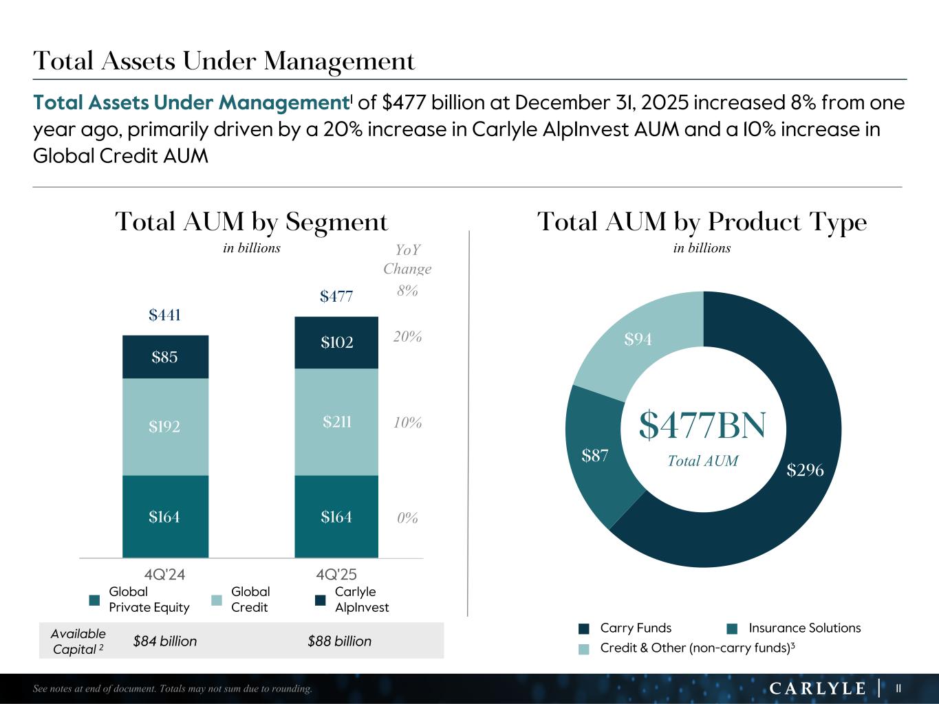 R-14 7 G-19 5 B-19 7 R-88 G-15 9 B-16 5 R-13 6 G-18 0 B-83 R-16 3 G-14 3 B-18 7 R-0 G-74 B-13 6 R-18 5 G-21 1 B-15 3 R-11 8 G-92 B-15 0 R-22 0 G-22 1 B-23 2 R-14 0 G-14 1 B-15 2R-12 0 G-16 9 B-22 2 Old Colors R-88 G-89 B-91 58595B R-23 G-234 B-234 EAEAEA R-208 G-232 B-247 D0E8F7 R-65 G-64 B-66 414042 R-8 G-51 B-94 08335E R-167 G-169 B-171 A7A9AB R-9 G-102 B-112 096670 R-220 G-221 B-222 DCDDDE R-97 G-161 B-224 61A1E0 R-237 G-217 B-157 EDD99D R-147 G-195 B-197 93C3C5 $296 $87 $94 $164 $164 $192 $211 $85 $102 $441 $477 4Q'24 4Q'25 Total Assets Under Management Total Assets Under Management1 of $477 billion at December 31, 2025 increased 8% from one year ago, primarily driven by a 20% increase in Carlyle AlpInvest AUM and a 10% increase in Global Credit AUM $477BN Total AUM 11See notes at end of document. Totals may not sum due to rounding. n Carry Funds n Insurance Solutions n Credit & Other (non-carry funds)3 Total AUM by Segment in billions Total AUM by Product Type in billions Available Capital 2 $84 billion $88 billion n Global Private Equity n Global Credit n Carlyle AlpInvest YoY Change 8% 20% 10% 0%