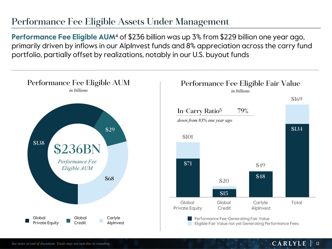 R-14 7 G-19 5 B-19 7 R-88 G-15 9 B-16 5 R-13 6 G-18 0 B-83 R-16 3 G-14 3 B-18 7 R-0 G-74 B-13 6 R-18 5 G-21 1 B-15 3 R-11 8 G-92 B-15 0 R-22 0 G-22 1 B-23 2 R-14 0 G-14 1 B-15 2R-12 0 G-16 9 B-22 2 Old Colors R-88 G-89 B-91 58595B R-23 G-234 B-234 EAEAEA R-208 G-232 B-247 D0E8F7 R-65 G-64 B-66 414042 R-8 G-51 B-94 08335E R-167 G-169 B-171 A7A9AB R-9 G-102 B-112 096670 R-220 G-221 B-222 DCDDDE R-97 G-161 B-224 61A1E0 R-237 G-217 B-157 EDD99D R-147 G-195 B-197 93C3C5 $101 $20 $49 $169 $71 $15 $48 $134 Performance Fee-Generating Fair Value Eligible Fair Value not yet Generating Performance Fees Global Private Equity Global Credit Carlyle AlpInvest Total Performance Fee Eligible Assets Under Management Performance Fee Eligible AUM4 of $236 billion was up 3% from $229 billion one year ago, primarily driven by inflows in our AlpInvest funds and 8% appreciation across the carry fund portfolio, partially offset by realizations, notably in our U.S. buyout funds $138 $29 $68 $236BN Performance Fee Eligible AUM 12See notes at end of document. Totals may not sum due to rounding. Performance Fee Eligible Fair Value in billions Performance Fee Eligible AUM in billions In-Carry Ratio5 79% down from 83% one year ago n Global Private Equity n Global Credit n Carlyle AlpInvest