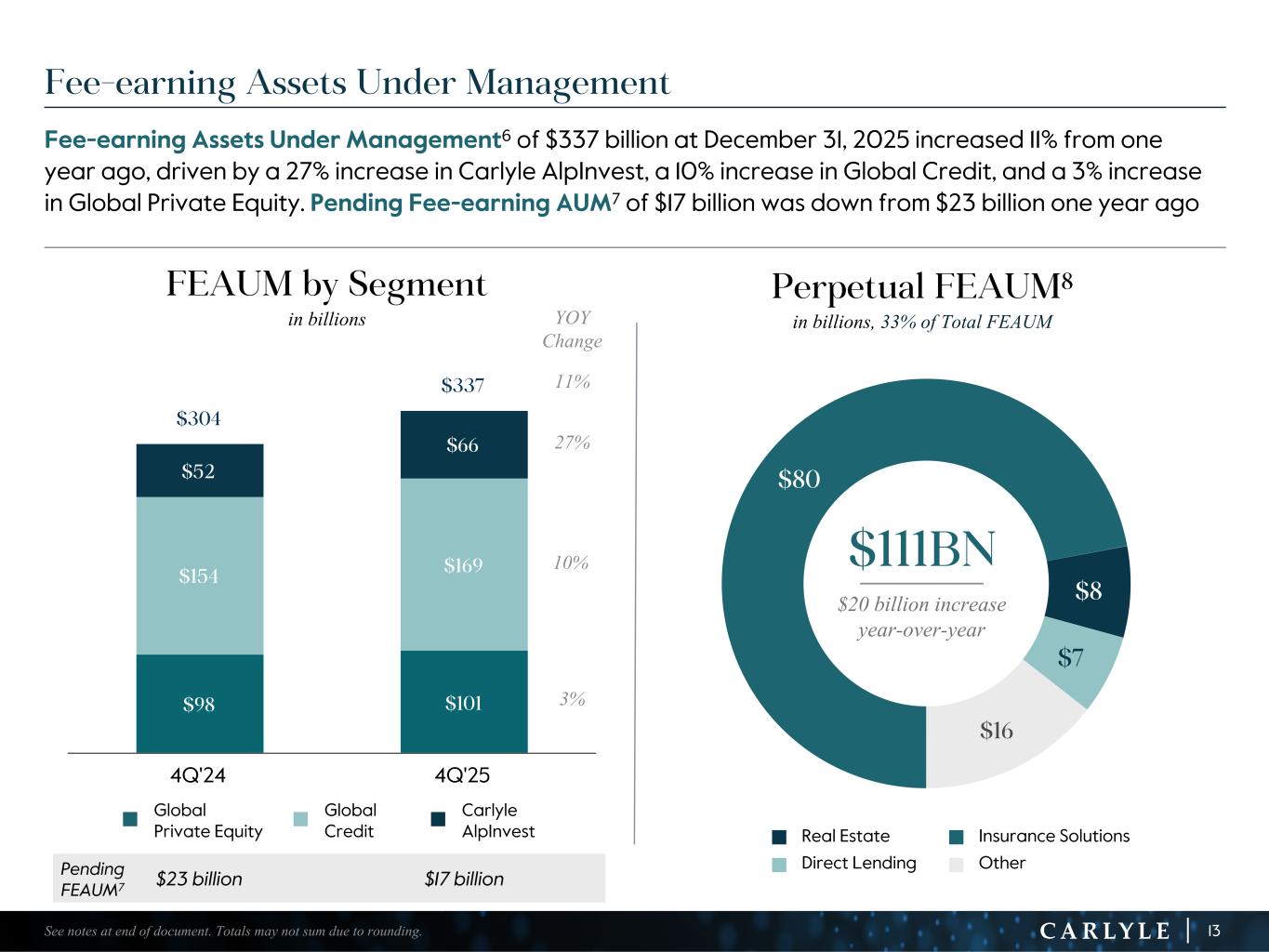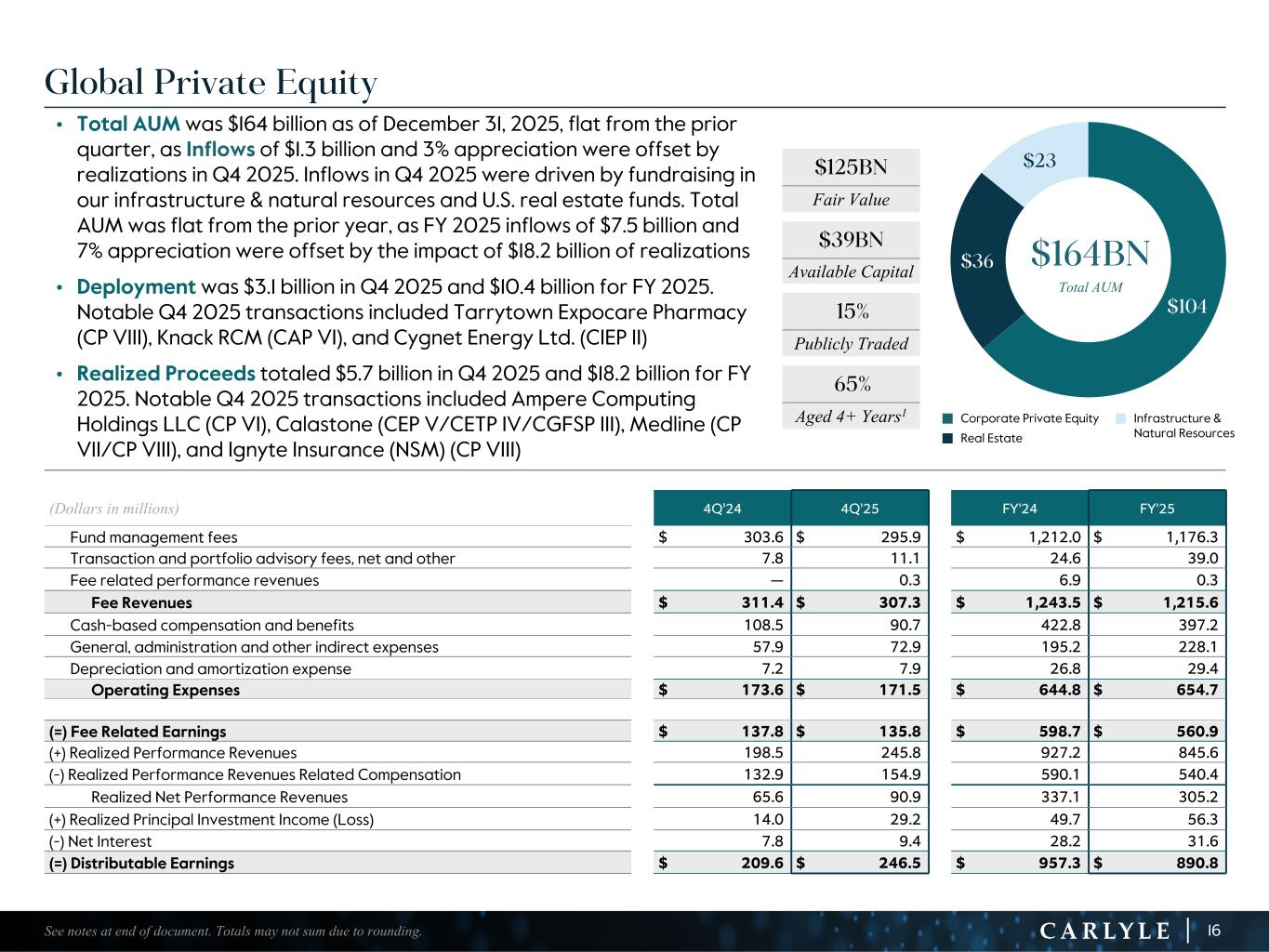 R-14 7 G-19 5 B-19 7 R-88 G-15 9 B-16 5 R-13 6 G-18 0 B-83 R-16 3 G-14 3 B-18 7 R-0 G-74 B-13 6 R-18 5 G-21 1 B-15 3 R-11 8 G-92 B-15 0 R-22 0 G-22 1 B-23 2 R-14 0 G-14 1 B-15 2R-12 0 G-16 9 B-22 2 Old Colors R-88 G-89 B-91 58595B R-23 G-234 B-234 EAEAEA R-208 G-232 B-247 D0E8F7 R-65 G-64 B-66 414042 R-8 G-51 B-94 08335E R-167 G-169 B-171 A7A9AB R-9 G-102 B-112 096670 R-220 G-221 B-222 DCDDDE R-97 G-161 B-224 61A1E0 R-237 G-217 B-157 EDD99D R-147 G-195 B-197 93C3C5 $80 $8 $7 $16 $98 $101 $154 $169 $52 $66 $304 $337 4Q'24 4Q'25 Fee-earning Assets Under Management Fee-earning Assets Under Management6 of $337 billion at December 31, 2025 increased 11% from one year ago, driven by a 27% increase in Carlyle AlpInvest, a 10% increase in Global Credit, and a 3% increase in Global Private Equity. Pending Fee-earning AUM7 of $17 billion was down from $23 billion one year ago 13See notes at end of document. Totals may not sum due to rounding. Pending FEAUM7 $23 billion $17 billion FEAUM by Segment in billions Perpetual FEAUM8 in billions, 33% of Total FEAUM n Real Estate n Insurance Solutions n Direct Lending n Other YOY Change 11% 27% 10% 3% $20 billion increase year-over-year $111BN n Global Private Equity n Global Credit n Carlyle AlpInvest
