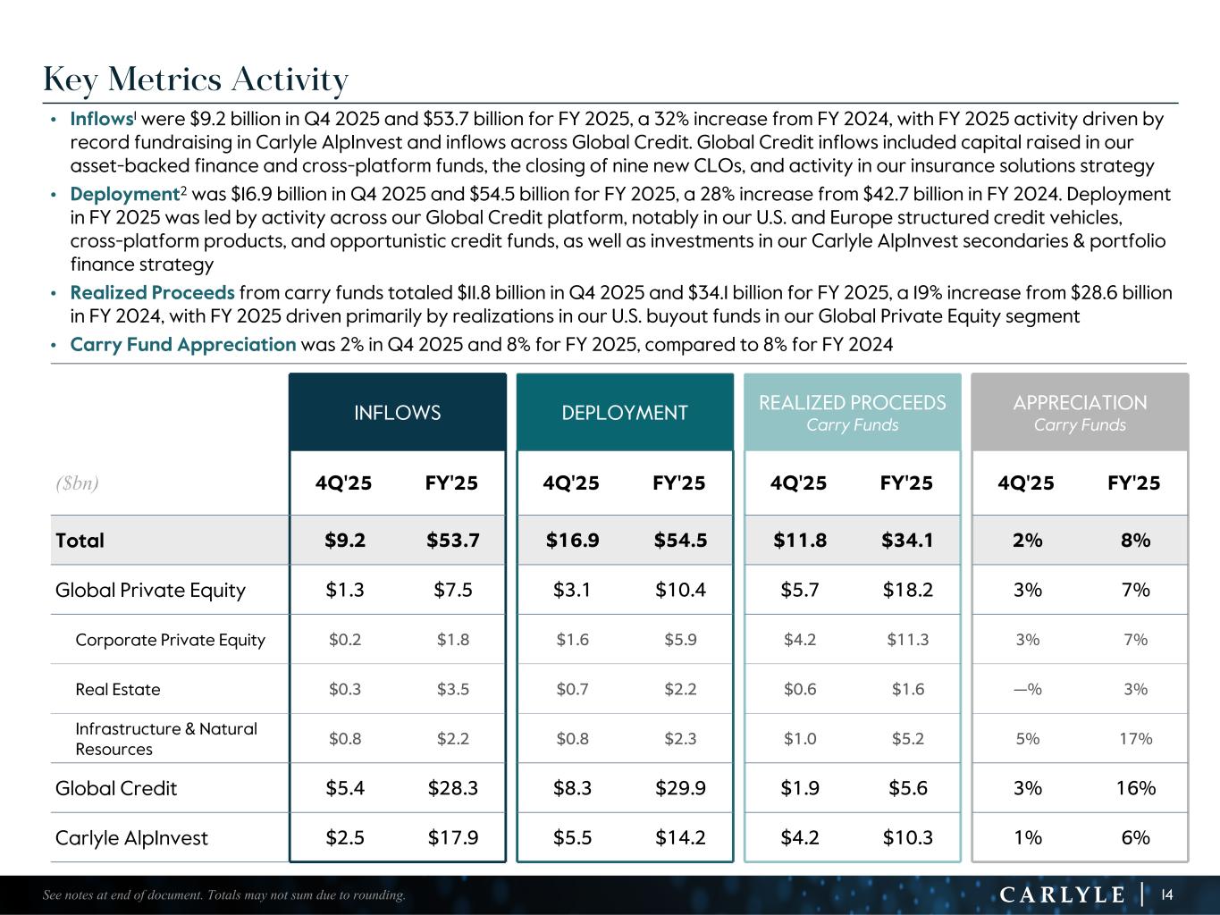 R-14 7 G-19 5 B-19 7 R-88 G-15 9 B-16 5 R-13 6 G-18 0 B-83 R-16 3 G-14 3 B-18 7 R-0 G-74 B-13 6 R-18 5 G-21 1 B-15 3 R-11 8 G-92 B-15 0 R-22 0 G-22 1 B-23 2 R-14 0 G-14 1 B-15 2R-12 0 G-16 9 B-22 2 Old Colors R-88 G-89 B-91 58595B R-23 G-234 B-234 EAEAEA R-208 G-232 B-247 D0E8F7 R-65 G-64 B-66 414042 R-8 G-51 B-94 08335E R-167 G-169 B-171 A7A9AB R-9 G-102 B-112 096670 R-220 G-221 B-222 DCDDDE R-97 G-161 B-224 61A1E0 R-237 G-217 B-157 EDD99D R-147 G-195 B-197 93C3C5 Key Metrics Activity • Inflows1 were $9.2 billion in Q4 2025 and $53.7 billion for FY 2025, a 32% increase from FY 2024, with FY 2025 activity driven by record fundraising in Carlyle AlpInvest and inflows across Global Credit. Global Credit inflows included capital raised in our asset-backed finance and cross-platform funds, the closing of nine new CLOs, and activity in our insurance solutions strategy • Deployment2 was $16.9 billion in Q4 2025 and $54.5 billion for FY 2025, a 28% increase from $42.7 billion in FY 2024. Deployment in FY 2025 was led by activity across our Global Credit platform, notably in our U.S. and Europe structured credit vehicles, cross-platform products, and opportunistic credit funds, as well as investments in our Carlyle AlpInvest secondaries & portfolio finance strategy • Realized Proceeds from carry funds totaled $11.8 billion in Q4 2025 and $34.1 billion for FY 2025, a 19% increase from $28.6 billion in FY 2024, with FY 2025 driven primarily by realizations in our U.S. buyout funds in our Global Private Equity segment • Carry Fund Appreciation was 2% in Q4 2025 and 8% for FY 2025, compared to 8% for FY 2024 INFLOWS DEPLOYMENT REALIZED PROCEEDS Carry Funds APPRECIATION Carry Funds ($bn) 4Q'25 FY'25 4Q'25 FY'25 4Q'25 FY'25 4Q'25 FY'25 Total $9.2 $53.7 $16.9 $54.5 $11.8 $34.1 2% 8% Global Private Equity $1.3 $7.5 $3.1 $10.4 $5.7 $18.2 3% 7% Corporate Private Equity $0.2 $1.8 $1.6 $5.9 $4.2 $11.3 3% 7% Real Estate $0.3 $3.5 $0.7 $2.2 $0.6 $1.6 —% 3% Infrastructure & Natural Resources $0.8 $2.2 $0.8 $2.3 $1.0 $5.2 5% 17% Global Credit $5.4 $28.3 $8.3 $29.9 $1.9 $5.6 3% 16% Carlyle AlpInvest $2.5 $17.9 $5.5 $14.2 $4.2 $10.3 1% 6% 14See notes at end of document. Totals may not sum due to rounding.