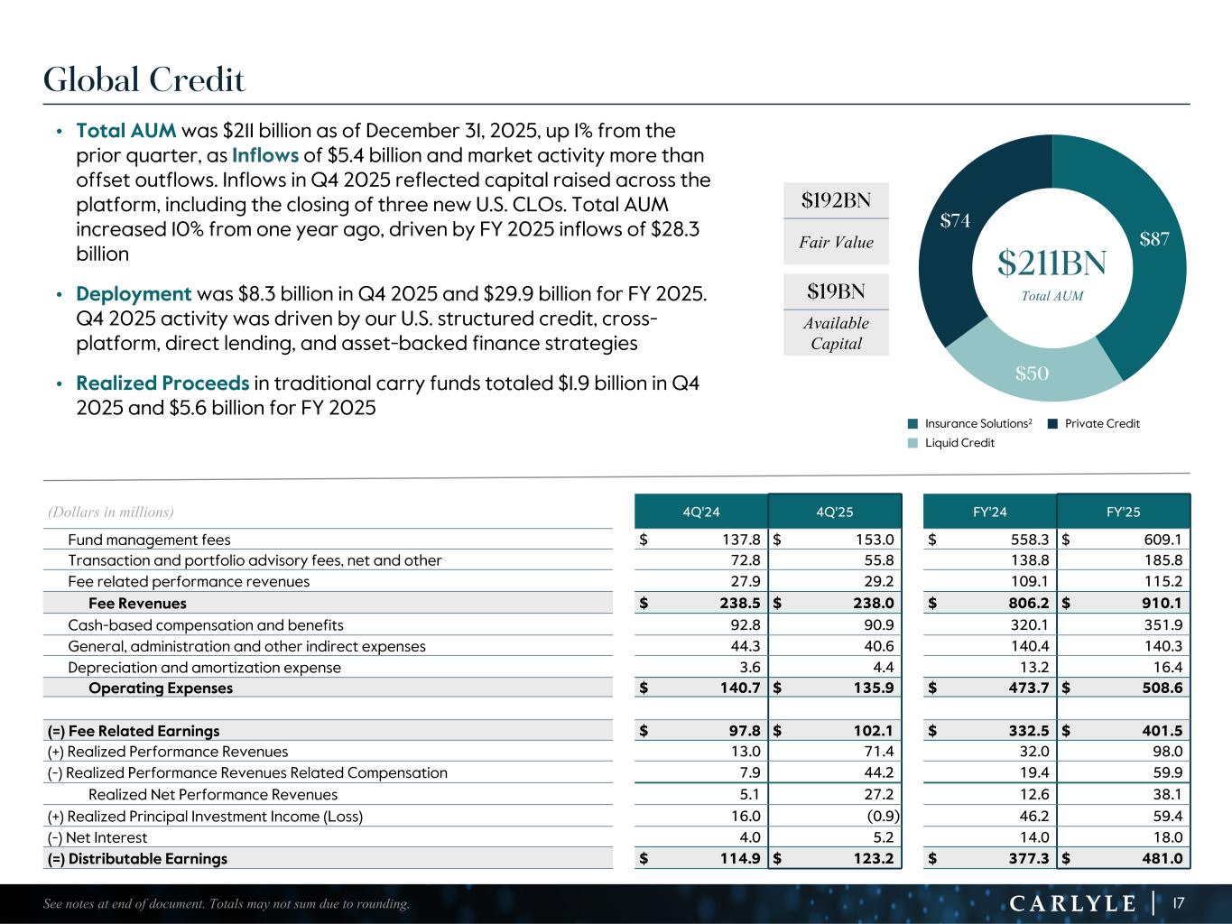 R-14 7 G-19 5 B-19 7 R-88 G-15 9 B-16 5 R-13 6 G-18 0 B-83 R-16 3 G-14 3 B-18 7 R-0 G-74 B-13 6 R-18 5 G-21 1 B-15 3 R-11 8 G-92 B-15 0 R-22 0 G-22 1 B-23 2 R-14 0 G-14 1 B-15 2R-12 0 G-16 9 B-22 2 Old Colors R-88 G-89 B-91 58595B R-23 G-234 B-234 EAEAEA R-208 G-232 B-247 D0E8F7 R-65 G-64 B-66 414042 R-8 G-51 B-94 08335E R-167 G-169 B-171 A7A9AB R-9 G-102 B-112 096670 R-220 G-221 B-222 DCDDDE R-97 G-161 B-224 61A1E0 R-237 G-217 B-157 EDD99D R-147 G-195 B-197 93C3C5 Global Private Equity • Total AUM was $164 billion as of December 31, 2025, flat from the prior quarter, as Inflows of $1.3 billion and 3% appreciation were offset by realizations in Q4 2025. Inflows in Q4 2025 were driven by fundraising in our infrastructure & natural resources and U.S. real estate funds. Total AUM was flat from the prior year, as FY 2025 inflows of $7.5 billion and 7% appreciation were offset by the impact of $18.2 billion of realizations • Deployment was $3.1 billion in Q4 2025 and $10.4 billion for FY 2025. Notable Q4 2025 transactions included Tarrytown Expocare Pharmacy (CP VIII), Knack RCM (CAP VI), and Cygnet Energy Ltd. (CIEP II) • Realized Proceeds totaled $5.7 billion in Q4 2025 and $18.2 billion for FY 2025. Notable Q4 2025 transactions included Ampere Computing Holdings LLC (CP VI), Calastone (CEP V/CETP IV/CGFSP III), Medline (CP VII/CP VIII), and Ignyte Insurance (NSM) (CP VIII) $104 $36 $23 $164BN Total AUM (Dollars in millions) 4Q'24 4Q'25 FY'24 FY'25 Fund management fees $ 303.6 $ 295.9 $ 1,212.0 $ 1,176.3 Transaction and portfolio advisory fees, net and other 7.8 11.1 24.6 39.0 Fee related performance revenues — 0.3 6.9 0.3 Fee Revenues $ 311.4 $ 307.3 $ 1,243.5 $ 1,215.6 Cash-based compensation and benefits 108.5 90.7 422.8 397.2 General, administration and other indirect expenses 57.9 72.9 195.2 228.1 Depreciation and amortization expense 7.2 7.9 26.8 29.4 Operating Expenses $ 173.6 $ 171.5 $ 644.8 $ 654.7 (=) Fee Related Earnings $ 137.8 $ 135.8 $ 598.7 $ 560.9 (+) Realized Performance Revenues 198.5 245.8 927.2 845.6 (-) Realized Performance Revenues Related Compensation 132.9 154.9 590.1 540.4 Realized Net Performance Revenues 65.6 90.9 337.1 305.2 (+) Realized Principal Investment Income (Loss) 14.0 29.2 49.7 56.3 (-) Net Interest 7.8 9.4 28.2 31.6 (=) Distributable Earnings $ 209.6 $ 246.5 $ 957.3 $ 890.8 16See notes at end of document. Totals may not sum due to rounding. $125BN Fair Value $39BN Available Capital 15% Publicly Traded 65% Aged 4+ Years1 n Corporate Private Equity n Infrastructure & Natural Resourcesn Real Estate