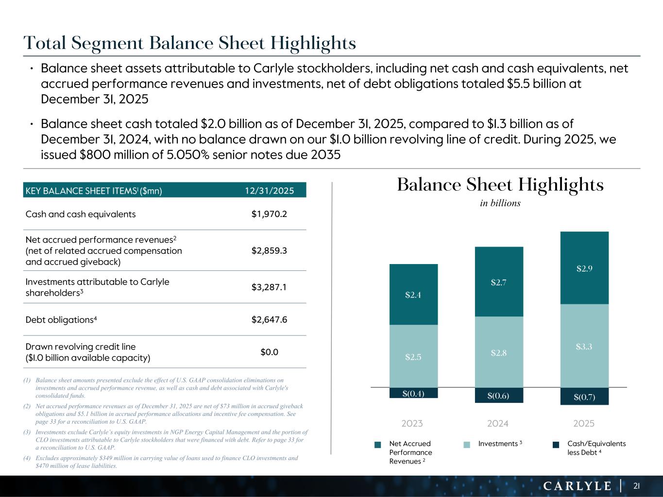 R-14 7 G-19 5 B-19 7 R-88 G-15 9 B-16 5 R-13 6 G-18 0 B-83 R-16 3 G-14 3 B-18 7 R-0 G-74 B-13 6 R-18 5 G-21 1 B-15 3 R-11 8 G-92 B-15 0 R-22 0 G-22 1 B-23 2 R-14 0 G-14 1 B-15 2R-12 0 G-16 9 B-22 2 Old Colors R-88 G-89 B-91 58595B R-23 G-234 B-234 EAEAEA R-208 G-232 B-247 D0E8F7 R-65 G-64 B-66 414042 R-8 G-51 B-94 08335E R-167 G-169 B-171 A7A9AB R-9 G-102 B-112 096670 R-220 G-221 B-222 DCDDDE R-97 G-161 B-224 61A1E0 R-237 G-217 B-157 EDD99D R-147 G-195 B-197 93C3C5 Total Segment Balance Sheet Highlights • Balance sheet assets attributable to Carlyle stockholders, including net cash and cash equivalents, net accrued performance revenues and investments, net of debt obligations totaled $5.5 billion at December 31, 2025 • Balance sheet cash totaled $2.0 billion as of December 31, 2025, compared to $1.3 billion as of December 31, 2024, with no balance drawn on our $1.0 billion revolving line of credit. During 2025, we issued $800 million of 5.050% senior notes due 2035 KEY BALANCE SHEET ITEMS1 ($mn) 12/31/2025 Cash and cash equivalents $1,970.2 Net accrued performance revenues2 (net of related accrued compensation and accrued giveback) $2,859.3 Investments attributable to Carlyle shareholders3 $3,287.1 Debt obligations4 $2,647.6 Drawn revolving credit line ($1.0 billion available capacity) $0.0 (1) Balance sheet amounts presented exclude the effect of U.S. GAAP consolidation eliminations on investments and accrued performance revenue, as well as cash and debt associated with Carlyle's consolidated funds. (2) Net accrued performance revenues as of December 31, 2025 are net of $73 million in accrued giveback obligations and $5.1 billion in accrued performance allocations and incentive fee compensation. See page 33 for a reconciliation to U.S. GAAP. (3) Investments exclude Carlyle’s equity investments in NGP Energy Capital Management and the portion of CLO investments attributable to Carlyle stockholders that were financed with debt. Refer to page 33 for a reconciliation to U.S. GAAP. (4) Excludes approximately $349 million in carrying value of loans used to finance CLO investments and $470 million of lease liabilities. $(0.4) $(0.6) $(0.7) $2.5 $2.8 $3.3 $2.4 $2.7 $2.9 2023 2024 2025 21 Balance Sheet Highlights in billions n Net Accrued Performance Revenues 2 n Investments 3 n Cash/Equivalents less Debt 4