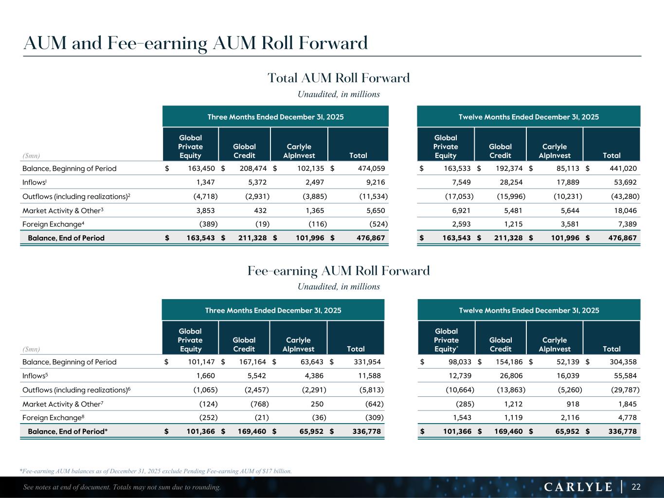 R-14 7 G-19 5 B-19 7 R-88 G-15 9 B-16 5 R-13 6 G-18 0 B-83 R-16 3 G-14 3 B-18 7 R-0 G-74 B-13 6 R-18 5 G-21 1 B-15 3 R-11 8 G-92 B-15 0 R-22 0 G-22 1 B-23 2 R-14 0 G-14 1 B-15 2R-12 0 G-16 9 B-22 2 Old Colors R-88 G-89 B-91 58595B R-23 G-234 B-234 EAEAEA R-208 G-232 B-247 D0E8F7 R-65 G-64 B-66 414042 R-8 G-51 B-94 08335E R-167 G-169 B-171 A7A9AB R-9 G-102 B-112 096670 R-220 G-221 B-222 DCDDDE R-97 G-161 B-224 61A1E0 R-237 G-217 B-157 EDD99D R-147 G-195 B-197 93C3C5 AUM and Fee-earning AUM Roll Forward Total AUM Roll Forward Unaudited, in millions Three Months Ended December 31, 2025 Twelve Months Ended December 31, 2025 ($mn) Global Private Equity Global Credit Carlyle AlpInvest Total Global Private Equity Global Credit Carlyle AlpInvest Total Balance, Beginning of Period $ 163,450 $ 208,474 $ 102,135 $ 474,059 $ 163,533 $ 192,374 $ 85,113 $ 441,020 Inflows1 1,347 5,372 2,497 9,216 7,549 28,254 17,889 53,692 Outflows (including realizations)2 (4,718) (2,931) (3,885) (11,534) (17,053) (15,996) (10,231) (43,280) Market Activity & Other3 3,853 432 1,365 5,650 6,921 5,481 5,644 18,046 Foreign Exchange4 (389) (19) (116) (524) 2,593 1,215 3,581 7,389 Balance, End of Period $ 163,543 $ 211,328 $ 101,996 $ 476,867 $ 163,543 $ 211,328 $ 101,996 $ 476,867 Fee-earning AUM Roll Forward Unaudited, in millions Three Months Ended December 31, 2025 Twelve Months Ended December 31, 2025 ($mn) Global Private Equity Global Credit Carlyle AlpInvest Total Global Private Equity* Global Credit Carlyle AlpInvest Total Balance, Beginning of Period $ 101,147 $ 167,164 $ 63,643 $ 331,954 $ 98,033 $ 154,186 $ 52,139 $ 304,358 Inflows5 1,660 5,542 4,386 11,588 12,739 26,806 16,039 55,584 Outflows (including realizations)6 (1,065) (2,457) (2,291) (5,813) (10,664) (13,863) (5,260) (29,787) Market Activity & Other7 (124) (768) 250 (642) (285) 1,212 918 1,845 Foreign Exchange8 (252) (21) (36) (309) 1,543 1,119 2,116 4,778 Balance, End of Period* $ 101,366 $ 169,460 $ 65,952 $ 336,778 $ 101,366 $ 169,460 $ 65,952 $ 336,778 22See notes at end of document. Totals may not sum due to rounding. *Fee-earning AUM balances as of December 31, 2025 exclude Pending Fee-earning AUM of $17 billion.