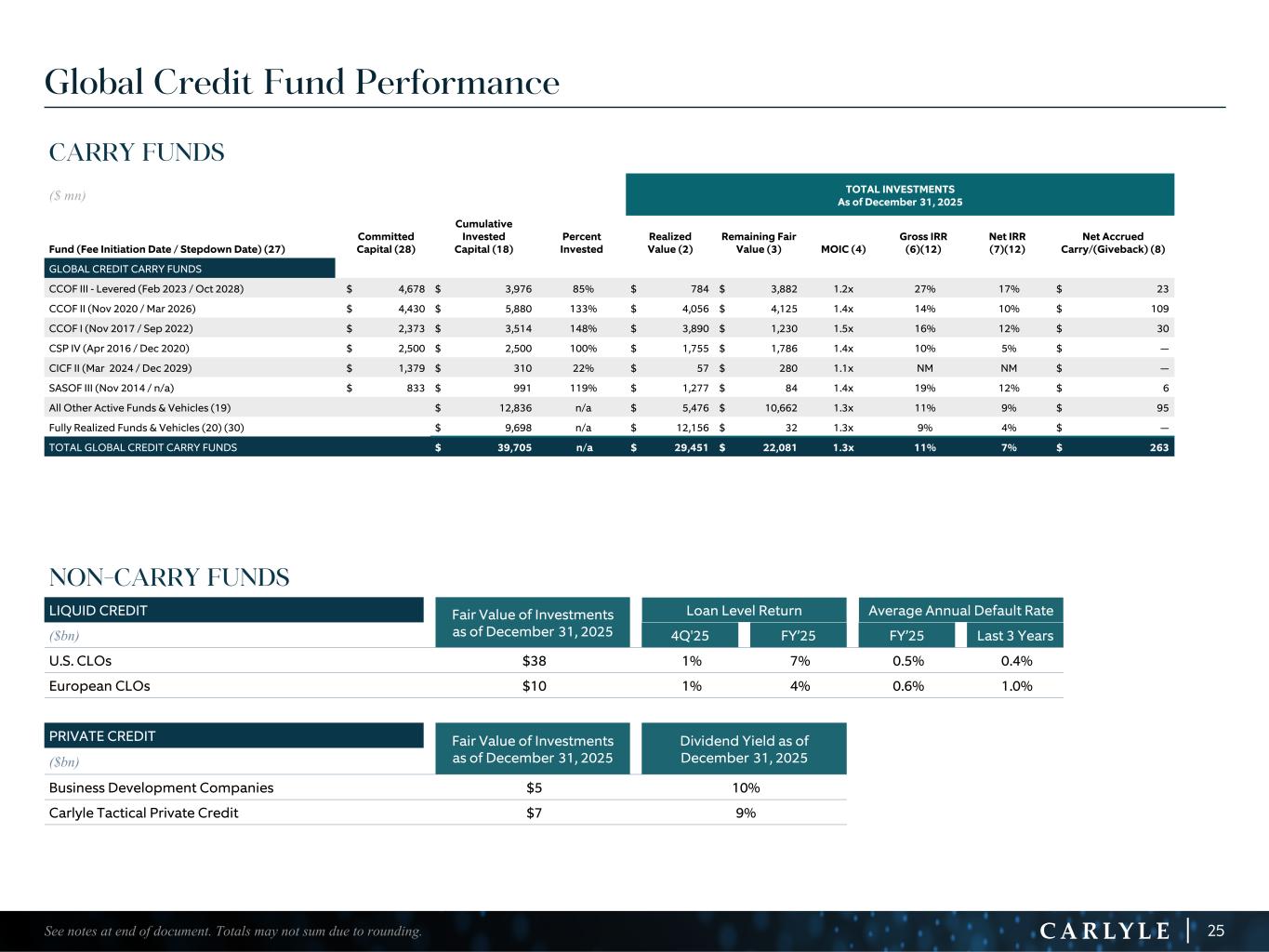 R-14 7 G-19 5 B-19 7 R-88 G-15 9 B-16 5 R-13 6 G-18 0 B-83 R-16 3 G-14 3 B-18 7 R-0 G-74 B-13 6 R-18 5 G-21 1 B-15 3 R-11 8 G-92 B-15 0 R-22 0 G-22 1 B-23 2 R-14 0 G-14 1 B-15 2R-12 0 G-16 9 B-22 2 Old Colors R-88 G-89 B-91 58595B R-23 G-234 B-234 EAEAEA R-208 G-232 B-247 D0E8F7 R-65 G-64 B-66 414042 R-8 G-51 B-94 08335E R-167 G-169 B-171 A7A9AB R-9 G-102 B-112 096670 R-220 G-221 B-222 DCDDDE R-97 G-161 B-224 61A1E0 R-237 G-217 B-157 EDD99D R-147 G-195 B-197 93C3C5 Global Credit Fund Performance 25 CARRY FUNDS ($ mn) TOTAL INVESTMENTS As of December 31, 2025 Fund (Fee Initiation Date / Stepdown Date) (27) Committed Capital (28) Cumulative Invested Capital (18) Percent Invested Realized Value (2) Remaining Fair Value (3) MOIC (4) Gross IRR (6)(12) Net IRR (7)(12) Net Accrued Carry/(Giveback) (8) GLOBAL CREDIT CARRY FUNDS CCOF III - Levered (Feb 2023 / Oct 2028) $ 4,678 $ 3,976 85% $ 784 $ 3,882 1.2x 27% 17% $ 23 CCOF II (Nov 2020 / Mar 2026) $ 4,430 $ 5,880 133% $ 4,056 $ 4,125 1.4x 14% 10% $ 109 CCOF I (Nov 2017 / Sep 2022) $ 2,373 $ 3,514 148% $ 3,890 $ 1,230 1.5x 16% 12% $ 30 CSP IV (Apr 2016 / Dec 2020) $ 2,500 $ 2,500 100% $ 1,755 $ 1,786 1.4x 10% 5% $ — CICF II (Mar 2024 / Dec 2029) $ 1,379 $ 310 22% $ 57 $ 280 1.1x NM NM $ — SASOF III (Nov 2014 / n/a) $ 833 $ 991 119% $ 1,277 $ 84 1.4x 19% 12% $ 6 All Other Active Funds & Vehicles (19) $ 12,836 n/a $ 5,476 $ 10,662 1.3x 11% 9% $ 95 Fully Realized Funds & Vehicles (20) (30) $ 9,698 n/a $ 12,156 $ 32 1.3x 9% 4% $ — TOTAL GLOBAL CREDIT CARRY FUNDS $ 39,705 n/a $ 29,451 $ 22,081 1.3x 11% 7% $ 263 See notes at end of document. Totals may not sum due to rounding. NON-CARRY FUNDS LIQUID CREDIT Fair Value of Investments as of December 31, 2025 Loan Level Return Average Annual Default Rate ($bn) 4Q'25 FY’25 FY’25 Last 3 Years U.S. CLOs $38 1% 7% 0.5% 0.4% European CLOs $10 1% 4% 0.6% 1.0% PRIVATE CREDIT Fair Value of Investments as of December 31, 2025 Dividend Yield as of December 31, 2025($bn) Business Development Companies $5 10% Carlyle Tactical Private Credit $7 9%