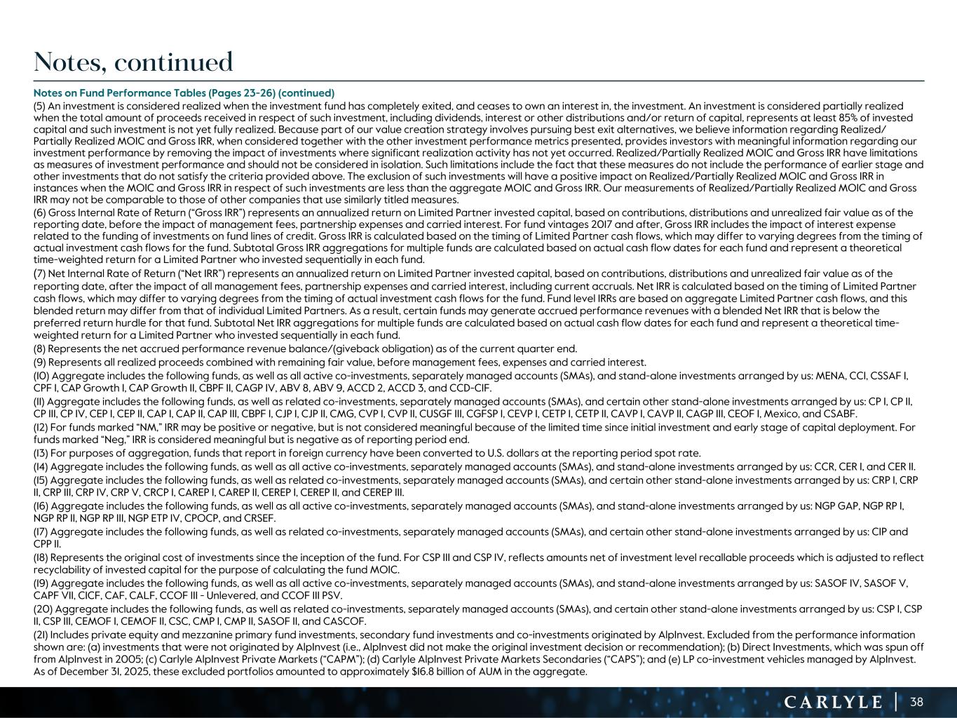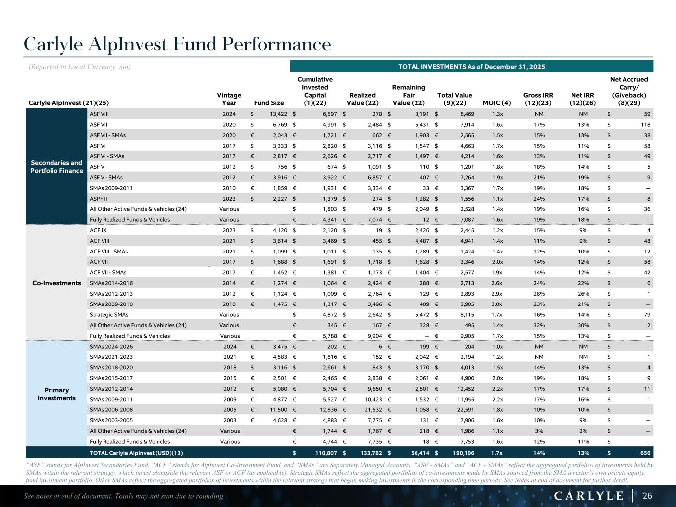 R-14 7 G-19 5 B-19 7 R-88 G-15 9 B-16 5 R-13 6 G-18 0 B-83 R-16 3 G-14 3 B-18 7 R-0 G-74 B-13 6 R-18 5 G-21 1 B-15 3 R-11 8 G-92 B-15 0 R-22 0 G-22 1 B-23 2 R-14 0 G-14 1 B-15 2R-12 0 G-16 9 B-22 2 Old Colors R-88 G-89 B-91 58595B R-23 G-234 B-234 EAEAEA R-208 G-232 B-247 D0E8F7 R-65 G-64 B-66 414042 R-8 G-51 B-94 08335E R-167 G-169 B-171 A7A9AB R-9 G-102 B-112 096670 R-220 G-221 B-222 DCDDDE R-97 G-161 B-224 61A1E0 R-237 G-217 B-157 EDD99D R-147 G-195 B-197 93C3C5 Carlyle AlpInvest Fund Performance (Reported in Local Currency, mn) TOTAL INVESTMENTS As of December 31, 2025 Carlyle AlpInvest (21)(25) Vintage Year Fund Size Cumulative Invested Capital (1)(22) Realized Value (22) Remaining Fair Value (22) Total Value (9)(22) MOIC (4) Gross IRR (12)(23) Net IRR (12)(26) Net Accrued Carry/ (Giveback) (8)(29) Secondaries and Portfolio Finance ASF VIII 2024 $ 13,422 $ 6,597 $ 278 $ 8,191 $ 8,469 1.3x NM NM $ 59 ASF VII 2020 $ 6,769 $ 4,991 $ 2,484 $ 5,431 $ 7,914 1.6x 17% 13% $ 118 ASF VII - SMAs 2020 € 2,043 € 1,721 € 662 € 1,903 € 2,565 1.5x 15% 13% $ 38 ASF VI 2017 $ 3,333 $ 2,820 $ 3,116 $ 1,547 $ 4,663 1.7x 15% 11% $ 58 ASF VI - SMAs 2017 € 2,817 € 2,626 € 2,717 € 1,497 € 4,214 1.6x 13% 11% $ 49 ASF V 2012 $ 756 $ 674 $ 1,091 $ 110 $ 1,201 1.8x 18% 14% $ 5 ASF V - SMAs 2012 € 3,916 € 3,922 € 6,857 € 407 € 7,264 1.9x 21% 19% $ 9 SMAs 2009-2011 2010 € 1,859 € 1,931 € 3,334 € 33 € 3,367 1.7x 19% 18% $ — ASPF II 2023 $ 2,227 $ 1,379 $ 274 $ 1,282 $ 1,556 1.1x 24% 17% $ 8 All Other Active Funds & Vehicles (24) Various $ 1,803 $ 479 $ 2,049 $ 2,528 1.4x 19% 16% $ 36 Fully Realized Funds & Vehicles Various € 4,341 € 7,074 € 12 € 7,087 1.6x 19% 18% $ — Co-Investments ACF IX 2023 $ 4,120 $ 2,120 $ 19 $ 2,426 $ 2,445 1.2x 15% 9% $ 4 ACF VIII 2021 $ 3,614 $ 3,469 $ 455 $ 4,487 $ 4,941 1.4x 11% 9% $ 48 ACF VIII - SMAs 2021 $ 1,099 $ 1,011 $ 135 $ 1,289 $ 1,424 1.4x 12% 10% $ 12 ACF VII 2017 $ 1,688 $ 1,691 $ 1,718 $ 1,628 $ 3,346 2.0x 14% 12% $ 58 ACF VII - SMAs 2017 € 1,452 € 1,381 € 1,173 € 1,404 € 2,577 1.9x 14% 12% $ 42 SMAs 2014-2016 2014 € 1,274 € 1,064 € 2,424 € 288 € 2,713 2.6x 24% 22% $ 6 SMAs 2012-2013 2012 € 1,124 € 1,009 € 2,764 € 129 € 2,893 2.9x 28% 26% $ 1 SMAs 2009-2010 2010 € 1,475 € 1,317 € 3,496 € 409 € 3,905 3.0x 23% 21% $ — Strategic SMAs Various $ 4,872 $ 2,642 $ 5,472 $ 8,115 1.7x 16% 14% $ 79 All Other Active Funds & Vehicles (24) Various € 345 € 167 € 328 € 495 1.4x 32% 30% $ 2 Fully Realized Funds & Vehicles Various € 5,788 € 9,904 € — € 9,905 1.7x 15% 13% $ — Primary Investments SMAs 2024-2026 2024 € 3,475 € 202 € 6 € 199 € 204 1.0x NM NM $ — SMAs 2021-2023 2021 € 4,583 € 1,816 € 152 € 2,042 € 2,194 1.2x NM NM $ 1 SMAs 2018-2020 2018 $ 3,116 $ 2,661 $ 843 $ 3,170 $ 4,013 1.5x 14% 13% $ 4 SMAs 2015-2017 2015 € 2,501 € 2,465 € 2,838 € 2,061 € 4,900 2.0x 19% 18% $ 9 SMAs 2012-2014 2012 € 5,080 € 5,704 € 9,650 € 2,801 € 12,452 2.2x 17% 17% $ 11 SMAs 2009-2011 2009 € 4,877 € 5,527 € 10,423 € 1,532 € 11,955 2.2x 17% 16% $ 1 SMAs 2006-2008 2005 € 11,500 € 12,836 € 21,532 € 1,058 € 22,591 1.8x 10% 10% $ — SMAs 2003-2005 2003 € 4,628 € 4,883 € 7,775 € 131 € 7,906 1.6x 10% 9% $ — All Other Active Funds & Vehicles (24) Various € 1,744 € 1,767 € 218 € 1,986 1.1x 3% 2% $ — Fully Realized Funds & Vehicles Various € 4,744 € 7,735 € 18 € 7,753 1.6x 12% 11% $ — TOTAL Carlyle AlpInvest (USD)(13) $ 110,807 $ 133,782 $ 56,414 $ 190,196 1.7x 14% 13% $ 656 26See notes at end of document. Totals may not sum due to rounding. “ASF” stands for AlpInvest Secondaries Fund, “ACF” stands for AlpInvest Co-Investment Fund, and “SMAs” are Separately Managed Accounts. “ASF - SMAs” and “ACF - SMAs” reflect the aggregated portfolios of investments held by SMAs within the relevant strategy, which invest alongside the relevant ASF or ACF (as applicable). Strategic SMAs reflect the aggregated portfolios of co-investments made by SMAs sourced from the SMA investor’s own private equity fund investment portfolio. Other SMAs reflect the aggregated portfolios of investments within the relevant strategy that began making investments in the corresponding time periods. See Notes at end of document for further detail.
