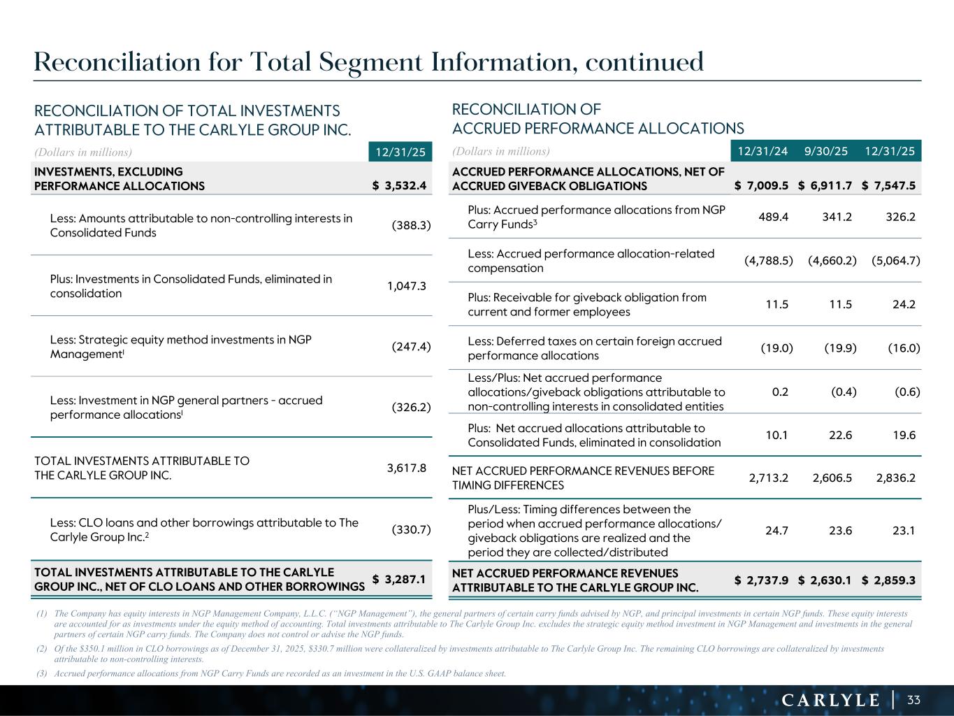 R-14 7 G-19 5 B-19 7 R-88 G-15 9 B-16 5 R-13 6 G-18 0 B-83 R-16 3 G-14 3 B-18 7 R-0 G-74 B-13 6 R-18 5 G-21 1 B-15 3 R-11 8 G-92 B-15 0 R-22 0 G-22 1 B-23 2 R-14 0 G-14 1 B-15 2R-12 0 G-16 9 B-22 2 Old Colors R-88 G-89 B-91 58595B R-23 G-234 B-234 EAEAEA R-208 G-232 B-247 D0E8F7 R-65 G-64 B-66 414042 R-8 G-51 B-94 08335E R-167 G-169 B-171 A7A9AB R-9 G-102 B-112 096670 R-220 G-221 B-222 DCDDDE R-97 G-161 B-224 61A1E0 R-237 G-217 B-157 EDD99D R-147 G-195 B-197 93C3C5 Reconciliation for Total Segment Information, continued (1) The Company has equity interests in NGP Management Company, L.L.C. (“NGP Management”), the general partners of certain carry funds advised by NGP, and principal investments in certain NGP funds. These equity interests are accounted for as investments under the equity method of accounting. Total investments attributable to The Carlyle Group Inc. excludes the strategic equity method investment in NGP Management and investments in the general partners of certain NGP carry funds. The Company does not control or advise the NGP funds. (2) Of the $350.1 million in CLO borrowings as of December 31, 2025, $330.7 million were collateralized by investments attributable to The Carlyle Group Inc. The remaining CLO borrowings are collateralized by investments attributable to non-controlling interests. (3) Accrued performance allocations from NGP Carry Funds are recorded as an investment in the U.S. GAAP balance sheet. RECONCILIATION OF TOTAL INVESTMENTS ATTRIBUTABLE TO THE CARLYLE GROUP INC. (Dollars in millions) 12/31/25 INVESTMENTS, EXCLUDING PERFORMANCE ALLOCATIONS $ 3,532.4 Less: Amounts attributable to non-controlling interests in Consolidated Funds (388.3) Plus: Investments in Consolidated Funds, eliminated in consolidation 1,047.3 Less: Strategic equity method investments in NGP Management1 (247.4) Less: Investment in NGP general partners - accrued performance allocations1 (326.2) TOTAL INVESTMENTS ATTRIBUTABLE TO THE CARLYLE GROUP INC. 3,617.8 Less: CLO loans and other borrowings attributable to The Carlyle Group Inc.2 (330.7) TOTAL INVESTMENTS ATTRIBUTABLE TO THE CARLYLE GROUP INC., NET OF CLO LOANS AND OTHER BORROWINGS $ 3,287.1 RECONCILIATION OF ACCRUED PERFORMANCE ALLOCATIONS (Dollars in millions) 12/31/24 9/30/25 12/31/25 ACCRUED PERFORMANCE ALLOCATIONS, NET OF ACCRUED GIVEBACK OBLIGATIONS $ 7,009.5 $ 6,911.7 $ 7,547.5 Plus: Accrued performance allocations from NGP Carry Funds3 489.4 341.2 326.2 Less: Accrued performance allocation-related compensation (4,788.5) (4,660.2) (5,064.7) Plus: Receivable for giveback obligation from current and former employees 11.5 11.5 24.2 Less: Deferred taxes on certain foreign accrued performance allocations (19.0) (19.9) (16.0) Less/Plus: Net accrued performance allocations/giveback obligations attributable to non-controlling interests in consolidated entities 0.2 (0.4) (0.6) Plus: Net accrued allocations attributable to Consolidated Funds, eliminated in consolidation 10.1 22.6 19.6 NET ACCRUED PERFORMANCE REVENUES BEFORE TIMING DIFFERENCES 2,713.2 2,606.5 2,836.2 Plus/Less: Timing differences between the period when accrued performance allocations/ giveback obligations are realized and the period they are collected/distributed 24.7 23.6 23.1 NET ACCRUED PERFORMANCE REVENUES ATTRIBUTABLE TO THE CARLYLE GROUP INC. $ 2,737.9 $ 2,630.1 $ 2,859.3 33