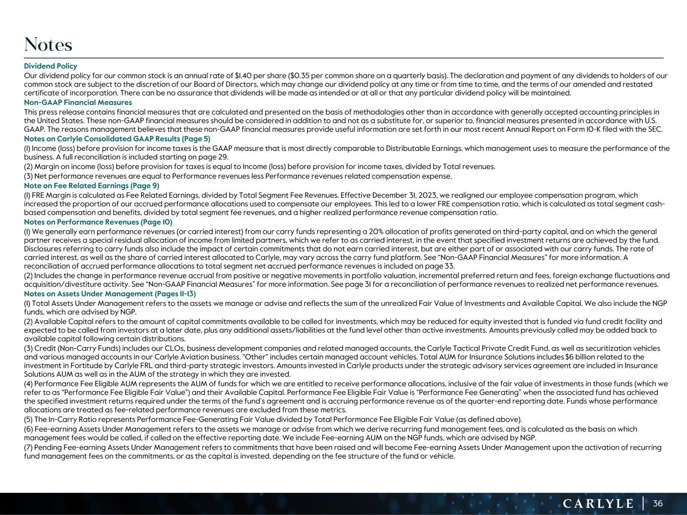 R-14 7 G-19 5 B-19 7 R-88 G-15 9 B-16 5 R-13 6 G-18 0 B-83 R-16 3 G-14 3 B-18 7 R-0 G-74 B-13 6 R-18 5 G-21 1 B-15 3 R-11 8 G-92 B-15 0 R-22 0 G-22 1 B-23 2 R-14 0 G-14 1 B-15 2R-12 0 G-16 9 B-22 2 Old Colors R-88 G-89 B-91 58595B R-23 G-234 B-234 EAEAEA R-208 G-232 B-247 D0E8F7 R-65 G-64 B-66 414042 R-8 G-51 B-94 08335E R-167 G-169 B-171 A7A9AB R-9 G-102 B-112 096670 R-220 G-221 B-222 DCDDDE R-97 G-161 B-224 61A1E0 R-237 G-217 B-157 EDD99D R-147 G-195 B-197 93C3C5 Notes Dividend Policy Our dividend policy for our common stock is an annual rate of $1.40 per share ($0.35 per common share on a quarterly basis). The declaration and payment of any dividends to holders of our common stock are subject to the discretion of our Board of Directors, which may change our dividend policy at any time or from time to time, and the terms of our amended and restated certificate of incorporation. There can be no assurance that dividends will be made as intended or at all or that any particular dividend policy will be maintained. Non-GAAP Financial Measures This press release contains financial measures that are calculated and presented on the basis of methodologies other than in accordance with generally accepted accounting principles in the United States. These non-GAAP financial measures should be considered in addition to and not as a substitute for, or superior to, financial measures presented in accordance with U.S. GAAP. The reasons management believes that these non-GAAP financial measures provide useful information are set forth in our most recent Annual Report on Form 10-K filed with the SEC. Notes on Carlyle Consolidated GAAP Results (Page 5) (1) Income (loss) before provision for income taxes is the GAAP measure that is most directly comparable to Distributable Earnings, which management uses to measure the performance of the business. A full reconciliation is included starting on page 29. (2) Margin on income (loss) before provision for taxes is equal to Income (loss) before provision for income taxes, divided by Total revenues. (3) Net performance revenues are equal to Performance revenues less Performance revenues related compensation expense. Note on Fee Related Earnings (Page 9) (1) FRE Margin is calculated as Fee Related Earnings, divided by Total Segment Fee Revenues. Effective December 31, 2023, we realigned our employee compensation program, which increased the proportion of our accrued performance allocations used to compensate our employees. This led to a lower FRE compensation ratio, which is calculated as total segment cash- based compensation and benefits, divided by total segment fee revenues, and a higher realized performance revenue compensation ratio. Notes on Performance Revenues (Page 10) (1) We generally earn performance revenues (or carried interest) from our carry funds representing a 20% allocation of profits generated on third-party capital, and on which the general partner receives a special residual allocation of income from limited partners, which we refer to as carried interest, in the event that specified investment returns are achieved by the fund. Disclosures referring to carry funds also include the impact of certain commitments that do not earn carried interest, but are either part of or associated with our carry funds. The rate of carried interest, as well as the share of carried interest allocated to Carlyle, may vary across the carry fund platform. See “Non-GAAP Financial Measures” for more information. A reconciliation of accrued performance allocations to total segment net accrued performance revenues is included on page 33. (2) Includes the change in performance revenue accrual from positive or negative movements in portfolio valuation, incremental preferred return and fees, foreign exchange fluctuations and acquisition/divestiture activity. See “Non-GAAP Financial Measures” for more information. See page 31 for a reconciliation of performance revenues to realized net performance revenues. Notes on Assets Under Management (Pages 11-13) (1) Total Assets Under Management refers to the assets we manage or advise and reflects the sum of the unrealized Fair Value of Investments and Available Capital. We also include the NGP funds, which are advised by NGP. (2) Available Capital refers to the amount of capital commitments available to be called for investments, which may be reduced for equity invested that is funded via fund credit facility and expected to be called from investors at a later date, plus any additional assets/liabilities at the fund level other than active investments. Amounts previously called may be added back to available capital following certain distributions. (3) Credit (Non-Carry Funds) includes our CLOs, business development companies and related managed accounts, the Carlyle Tactical Private Credit Fund, as well as securitization vehicles and various managed accounts in our Carlyle Aviation business. "Other" includes certain managed account vehicles. Total AUM for Insurance Solutions includes $6 billion related to the investment in Fortitude by Carlyle FRL and third-party strategic investors. Amounts invested in Carlyle products under the strategic advisory services agreement are included in Insurance Solutions AUM as well as in the AUM of the strategy in which they are invested. (4) Performance Fee Eligible AUM represents the AUM of funds for which we are entitled to receive performance allocations, inclusive of the fair value of investments in those funds (which we refer to as “Performance Fee Eligible Fair Value”) and their Available Capital. Performance Fee Eligible Fair Value is “Performance Fee Generating” when the associated fund has achieved the specified investment returns required under the terms of the fund’s agreement and is accruing performance revenue as of the quarter-end reporting date. Funds whose performance allocations are treated as fee-related performance revenues are excluded from these metrics. (