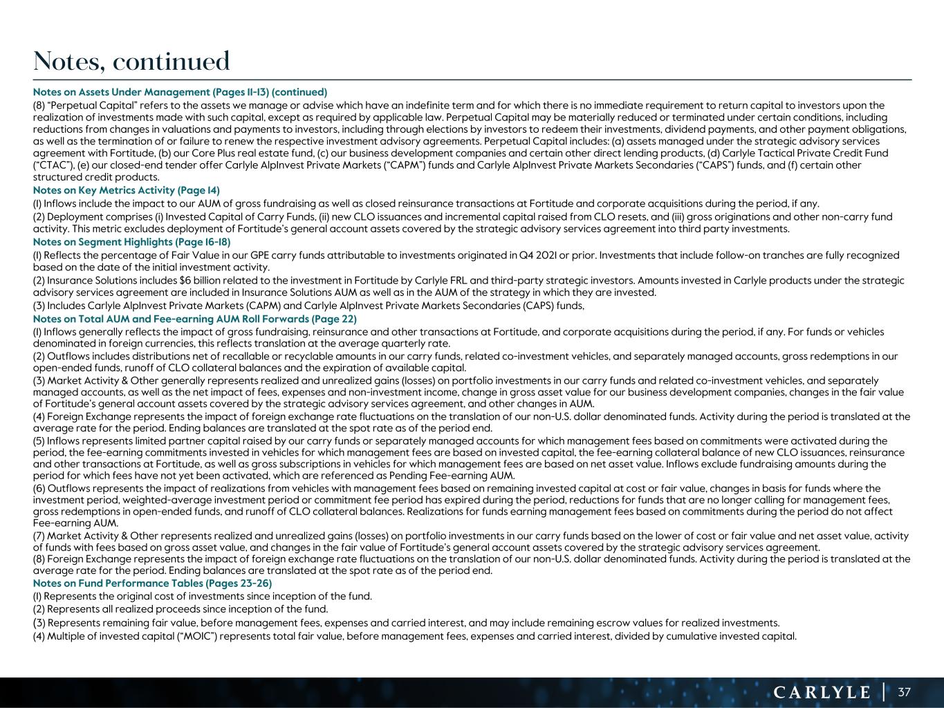 R-14 7 G-19 5 B-19 7 R-88 G-15 9 B-16 5 R-13 6 G-18 0 B-83 R-16 3 G-14 3 B-18 7 R-0 G-74 B-13 6 R-18 5 G-21 1 B-15 3 R-11 8 G-92 B-15 0 R-22 0 G-22 1 B-23 2 R-14 0 G-14 1 B-15 2R-12 0 G-16 9 B-22 2 Old Colors R-88 G-89 B-91 58595B R-23 G-234 B-234 EAEAEA R-208 G-232 B-247 D0E8F7 R-65 G-64 B-66 414042 R-8 G-51 B-94 08335E R-167 G-169 B-171 A7A9AB R-9 G-102 B-112 096670 R-220 G-221 B-222 DCDDDE R-97 G-161 B-224 61A1E0 R-237 G-217 B-157 EDD99D R-147 G-195 B-197 93C3C5 Notes on Assets Under Management (Pages 11-13) (continued) (8) “Perpetual Capital” refers to the assets we manage or advise which have an indefinite term and for which there is no immediate requirement to return capital to investors upon the realization of investments made with such capital, except as required by applicable law. Perpetual Capital may be materially reduced or terminated under certain conditions, including reductions from changes in valuations and payments to investors, including through elections by investors to redeem their investments, dividend payments, and other payment obligations, as well as the termination of or failure to renew the respective investment advisory agreements. Perpetual Capital includes: (a) assets managed under the strategic advisory services agreement with Fortitude, (b) our Core Plus real estate fund, (c) our business development companies and certain other direct lending products, (d) Carlyle Tactical Private Credit Fund (“CTAC”), (e) our closed-end tender offer Carlyle AlpInvest Private Markets (“CAPM”) funds and Carlyle AlpInvest Private Markets Secondaries (“CAPS”) funds, and (f) certain other structured credit products. Notes on Key Metrics Activity (Page 14) (1) Inflows include the impact to our AUM of gross fundraising as well as closed reinsurance transactions at Fortitude and corporate acquisitions during the period, if any. (2) Deployment comprises (i) Invested Capital of Carry Funds, (ii) new CLO issuances and incremental capital raised from CLO resets, and (iii) gross originations and other non-carry fund activity. This metric excludes deployment of Fortitude’s general account assets covered by the strategic advisory services agreement into third party investments. Notes on Segment Highlights (Page 16-18) (1) Reflects the percentage of Fair Value in our GPE carry funds attributable to investments originated in Q4 2021 or prior. Investments that include follow-on tranches are fully recognized based on the date of the initial investment activity. (2) Insurance Solutions includes $6 billion related to the investment in Fortitude by Carlyle FRL and third-party strategic investors. Amounts invested in Carlyle products under the strategic advisory services agreement are included in Insurance Solutions AUM as well as in the AUM of the strategy in which they are invested. (3) Includes Carlyle AlpInvest Private Markets (CAPM) and Carlyle AlpInvest Private Markets Secondaries (CAPS) funds, Notes on Total AUM and Fee-earning AUM Roll Forwards (Page 22) (1) Inflows generally reflects the impact of gross fundraising, reinsurance and other transactions at Fortitude, and corporate acquisitions during the period, if any. For funds or vehicles denominated in foreign currencies, this reflects translation at the average quarterly rate. (2) Outflows includes distributions net of recallable or recyclable amounts in our carry funds, related co-investment vehicles, and separately managed accounts, gross redemptions in our open-ended funds, runoff of CLO collateral balances and the expiration of available capital. (3) Market Activity & Other generally represents realized and unrealized gains (losses) on portfolio investments in our carry funds and related co-investment vehicles, and separately managed accounts, as well as the net impact of fees, expenses and non-investment income, change in gross asset value for our business development companies, changes in the fair value of Fortitude’s general account assets covered by the strategic advisory services agreement, and other changes in AUM. (4) Foreign Exchange represents the impact of foreign exchange rate fluctuations on the translation of our non-U.S. dollar denominated funds. Activity during the period is translated at the average rate for the period. Ending balances are translated at the spot rate as of the period end. (5) Inflows represents limited partner capital raised by our carry funds or separately managed accounts for which management fees based on commitments were activated during the period, the fee-earning commitments invested in vehicles for which management fees are based on invested capital, the fee-earning collateral balance of new CLO issuances, reinsurance and other transactions at Fortitude, as well as gross subscriptions in vehicles for which management fees are based on net asset value. Inflows exclude fundraising amounts during the period for which fees have not yet been activated, which are referenced as Pending Fee-earning AUM. (6) Outflows represents the impact of realizations from vehicles with management fees based on remaining invested capital at cost or fair value, changes in basis for funds where the investment period, weighted-average investment period or commitment fee period has expired during the period, reductions for funds that are no longer calling for management fees, gross redemptions in open-ended funds, and runoff of CLO collateral balances. Realizations for funds earning management fees based on commitments during the period do not affect Fee-earning AUM. (7) Market Activity & Other represents realized and unrealized gains (losses) on portfolio investments in our carry funds based on the lower of cost or fair value and net asset value, activity of funds with fees based on gross asset value, and changes in the fair value of Fortitude’s general account assets covered by the strategic advisory services agreement. (8) Foreign Exchange represents the impact of foreign exchange rate fluctua